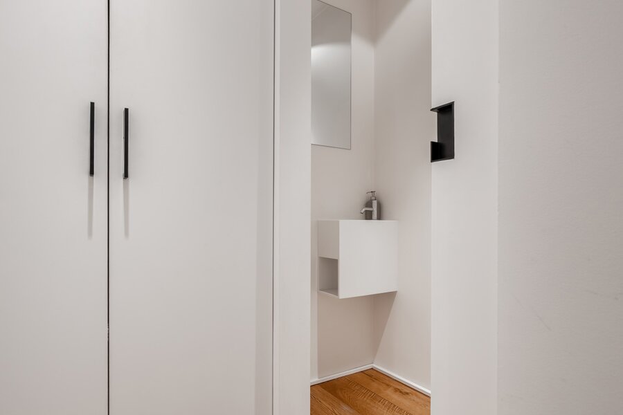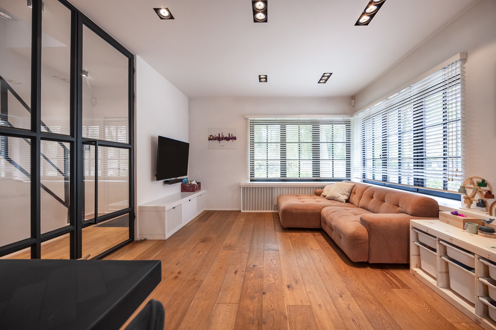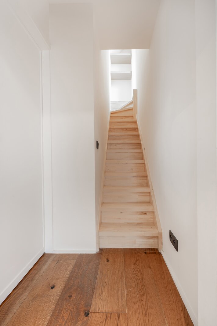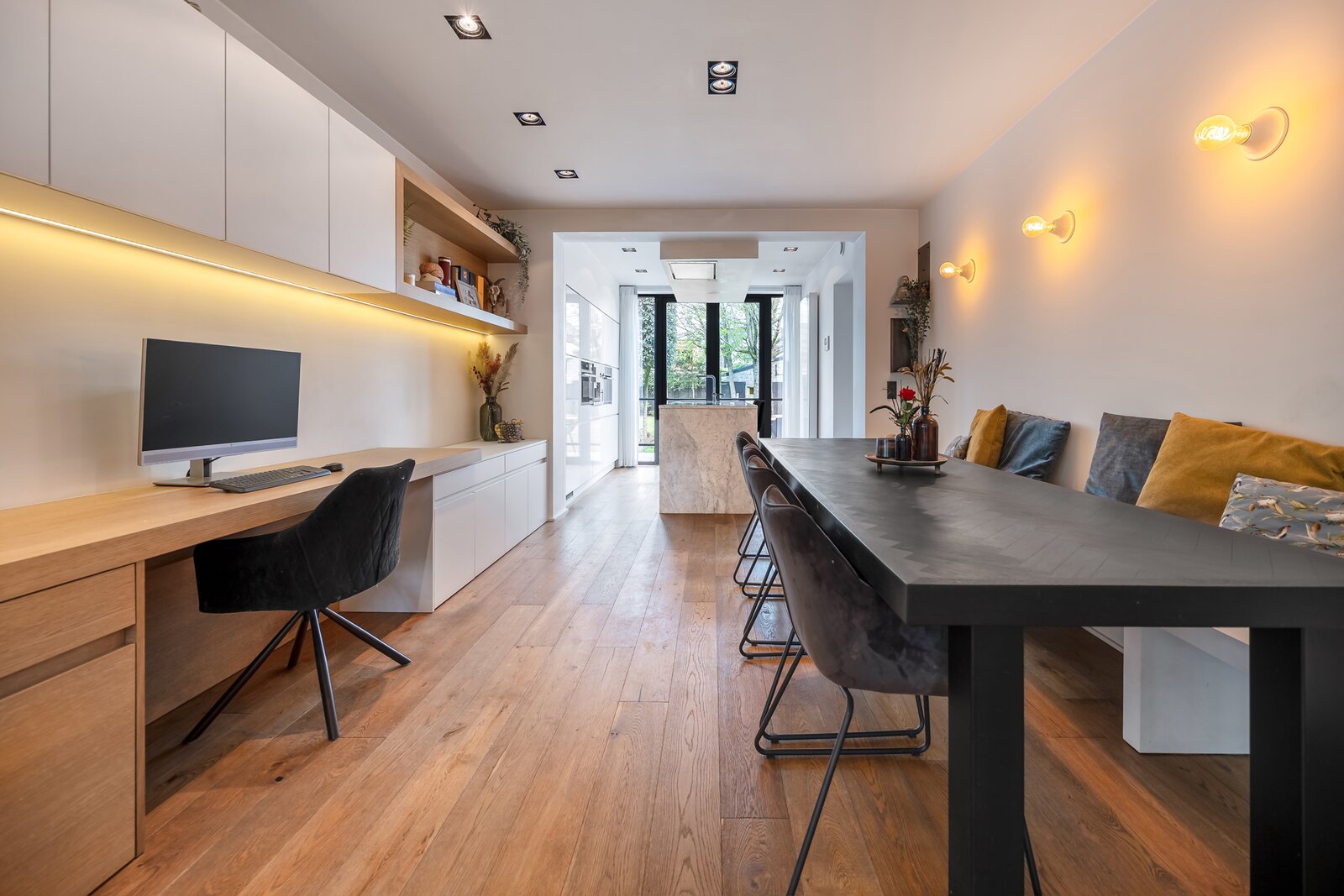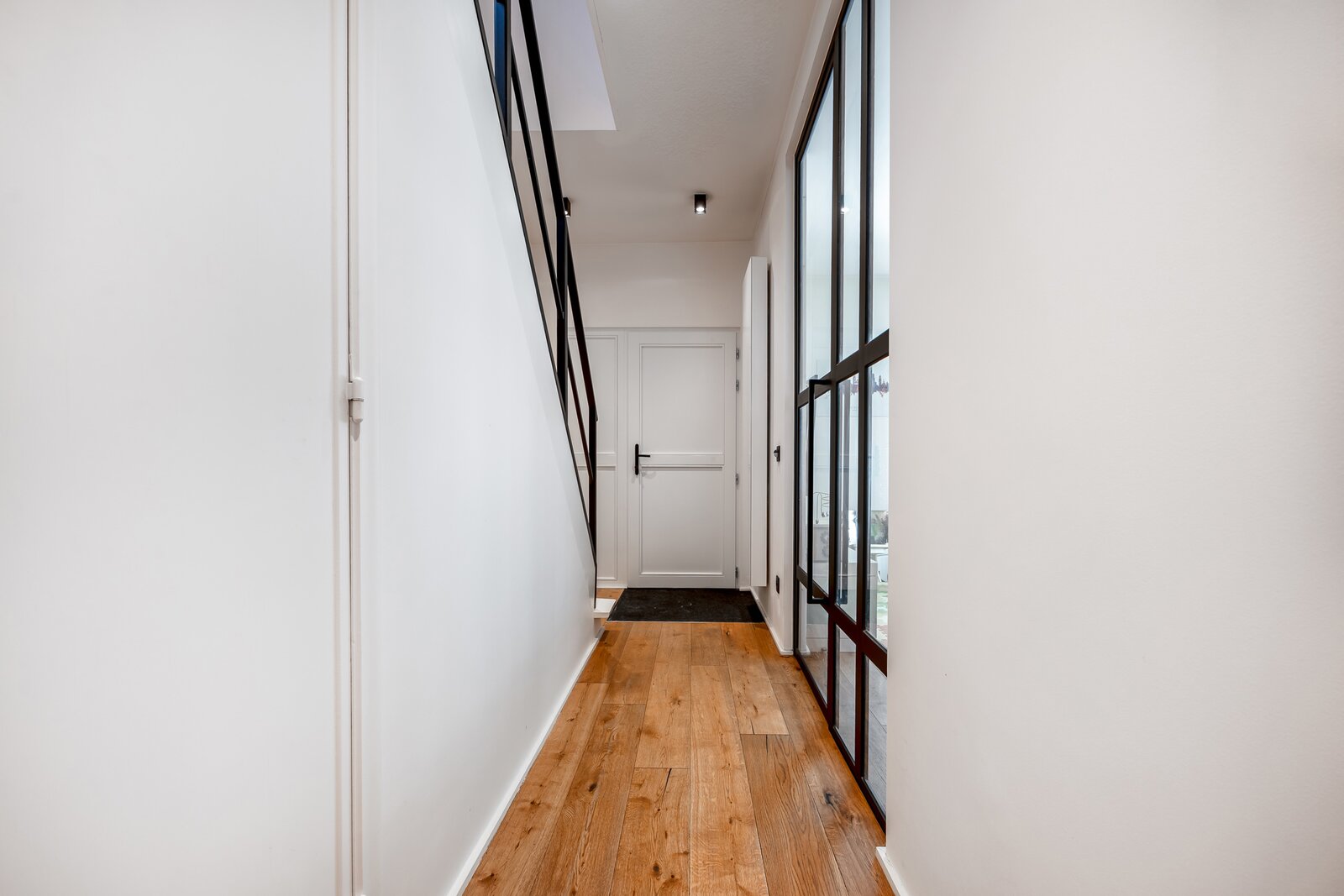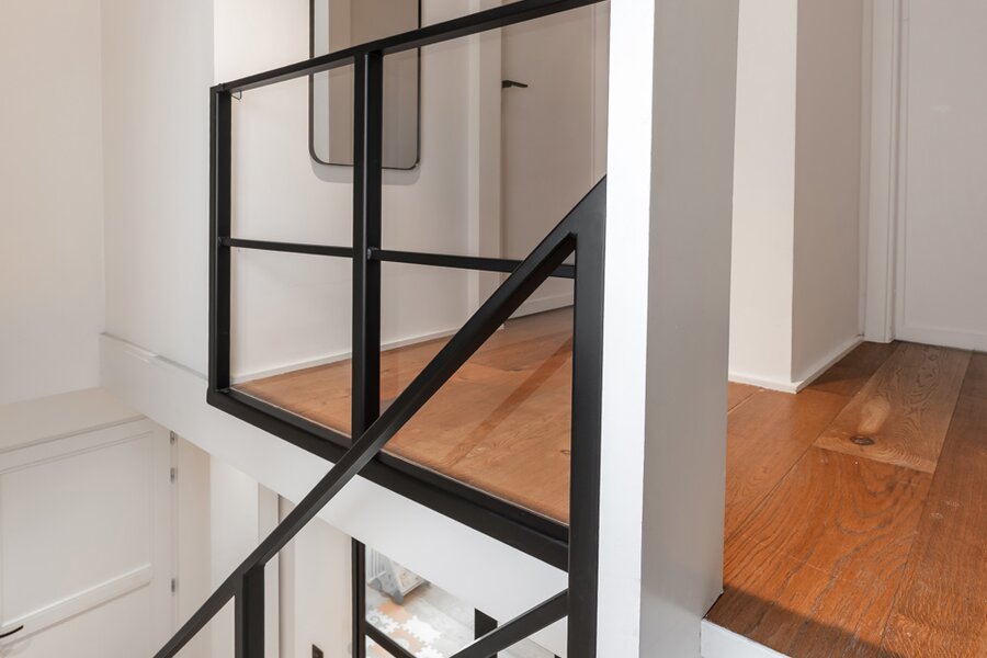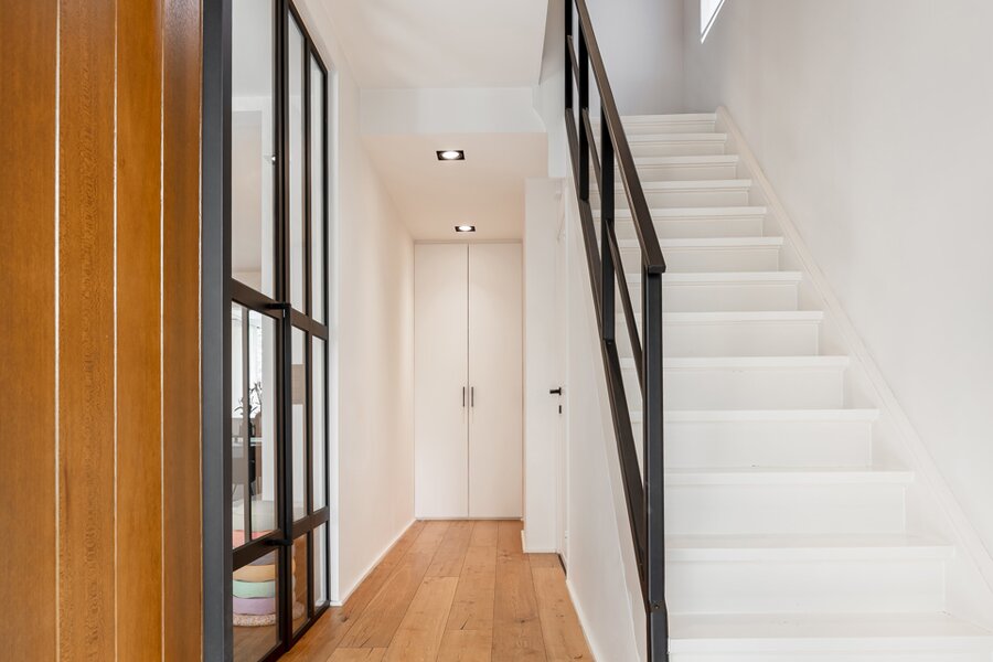 Binnen wordt u verwelkomd in een woning waar sfeer en verfijning centraal staan. Warme houten parketvloeren, subtiele gietijzeren accenten en zorgvuldig maatwerk creëren een tijdloze en elegante woonbeleving.