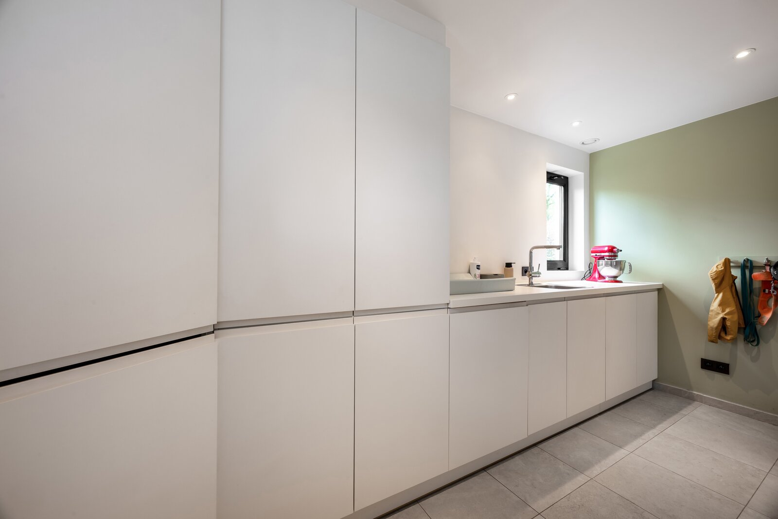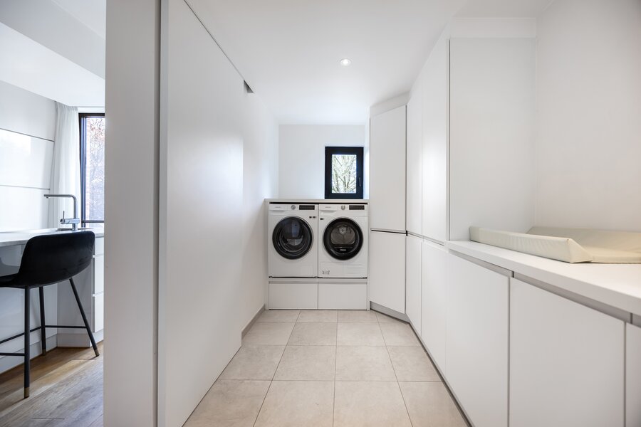 De woning werd praktisch en doordacht ingedeeld met een inkomhal met gastentoilet en vestiaire, een ruime bijkeuken/wasplaats, een kelder en een ingemaakte bureauruimte die discreet in het geheel werd geïntegreerd.