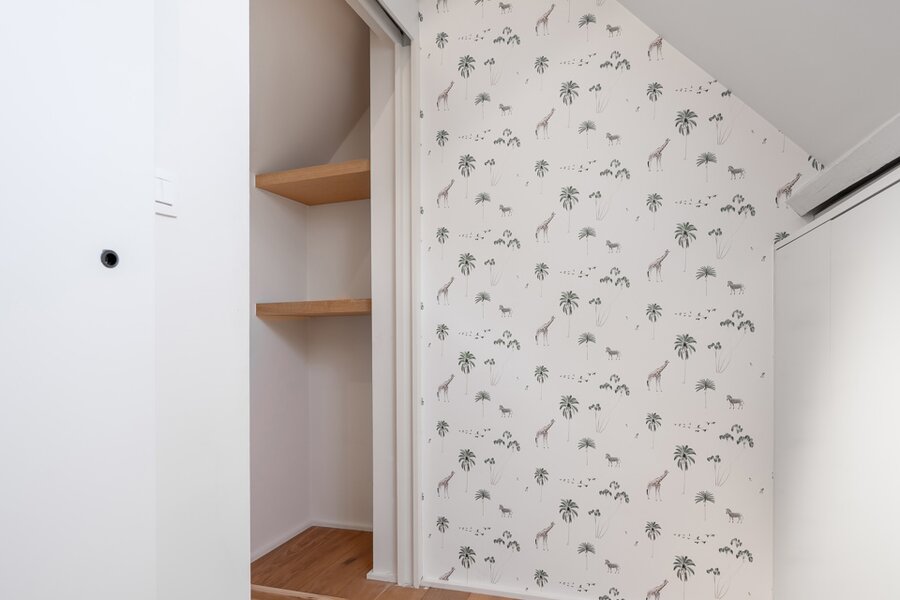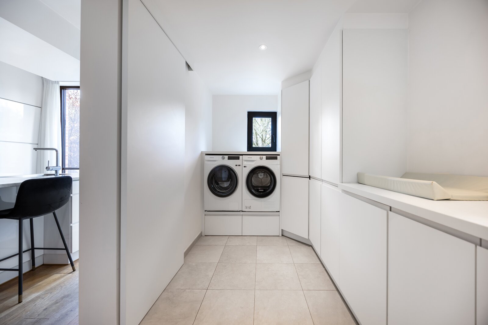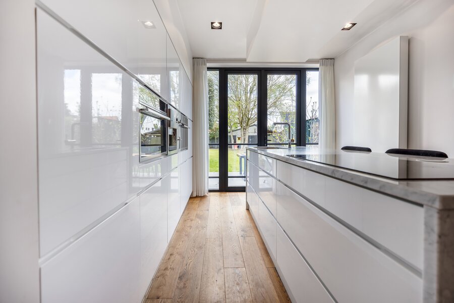 De leefruimte vormt het kloppend hart van de woning. Dankzij de grote raampartijen baadt de ruimte in natuurlijk licht en geniet u van een mooi zicht op de tuin. De open keuken sluit naadloos aan en versterkt het gevoel van ruimte, licht en verbondenheid.