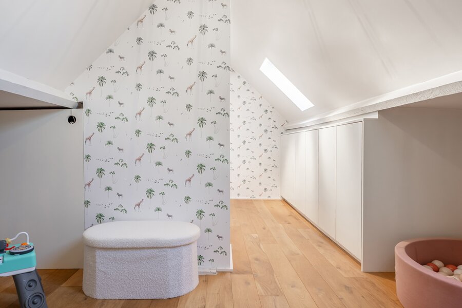 Op de verdiepingen bevinden zich drie volwaardige slaapkamers, elk met hun eigen karakter. De master bedroom is uitgerust met airconditioning en beschikt over een royale badkamer met ligbad/douche en dubbele lavabo. De tweede slaapkamer geniet van een eigen douchekamer. De derde slaapkamer, gelegen op de bovenste verdieping en bereikbaar via een vaste trap, is volledig afgewerkt en voorzien van ingemaakte kasten die het geheel versterken.