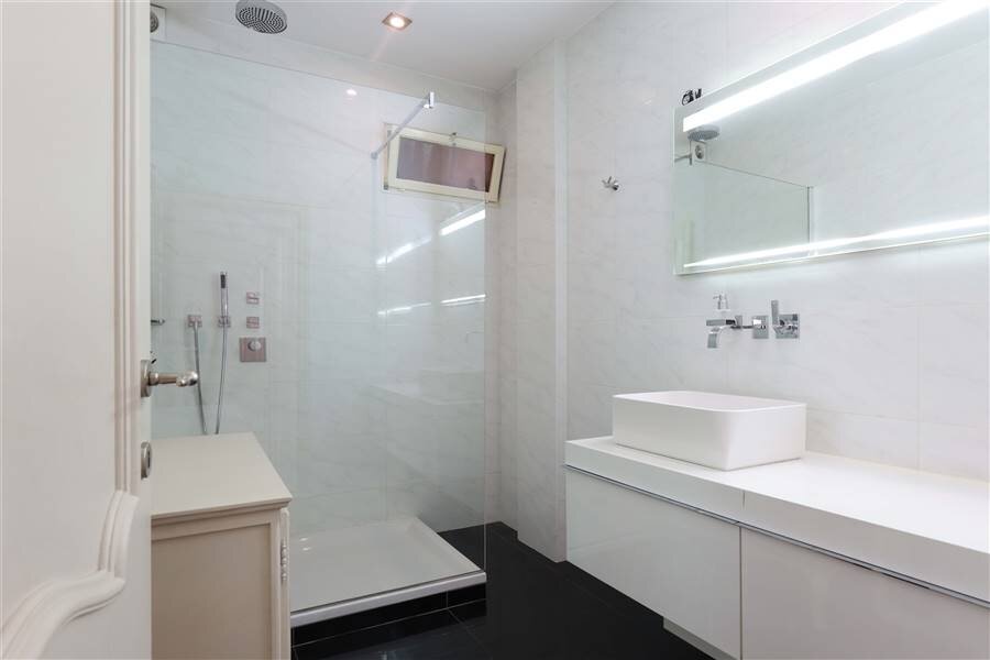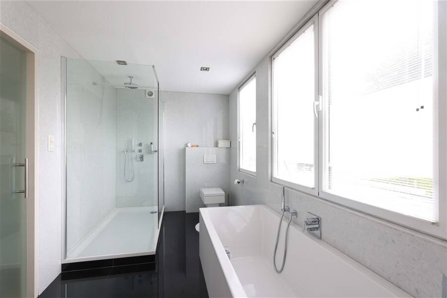 + 2de ruime moderne badkamer met ligbad en inloopdouche met regendouche