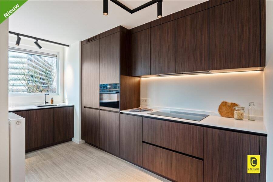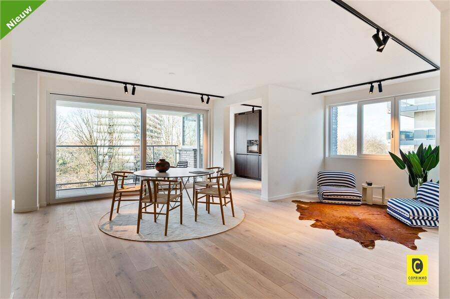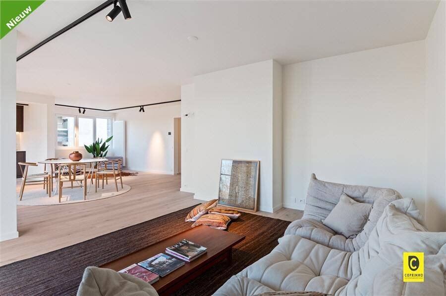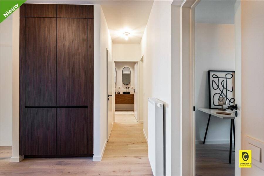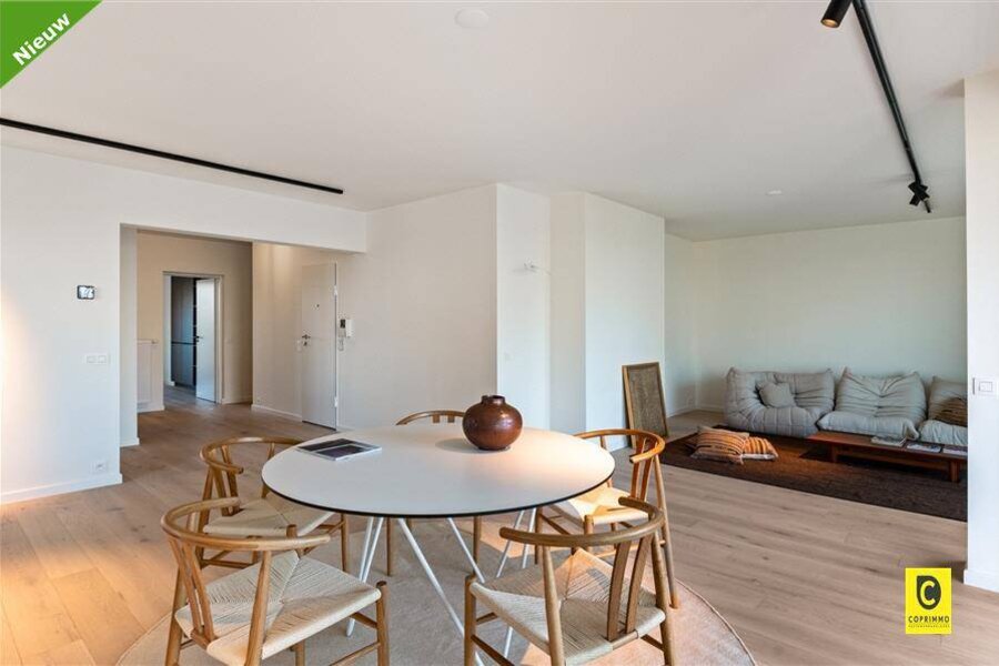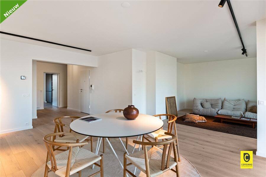 U betreedt dit klassevol appartement via de inkomhal met veiligheidsdeur en vestiaire. De parketvloer werd doorgetrokken in nagenoeg heel het appartement. In de riante leefruimte (49m²) accentueert de lichtinval het ruimtegevoel en de hoge afwerkingsgraad. De prachtige open keuken voorziet in kwalitatieve toestellen. De travertin-look vloer, het gemarmerde composieten werkblad en de hedendaagse design-verlichting zorgen voor nog meer cachet. De wasruimte is apart.