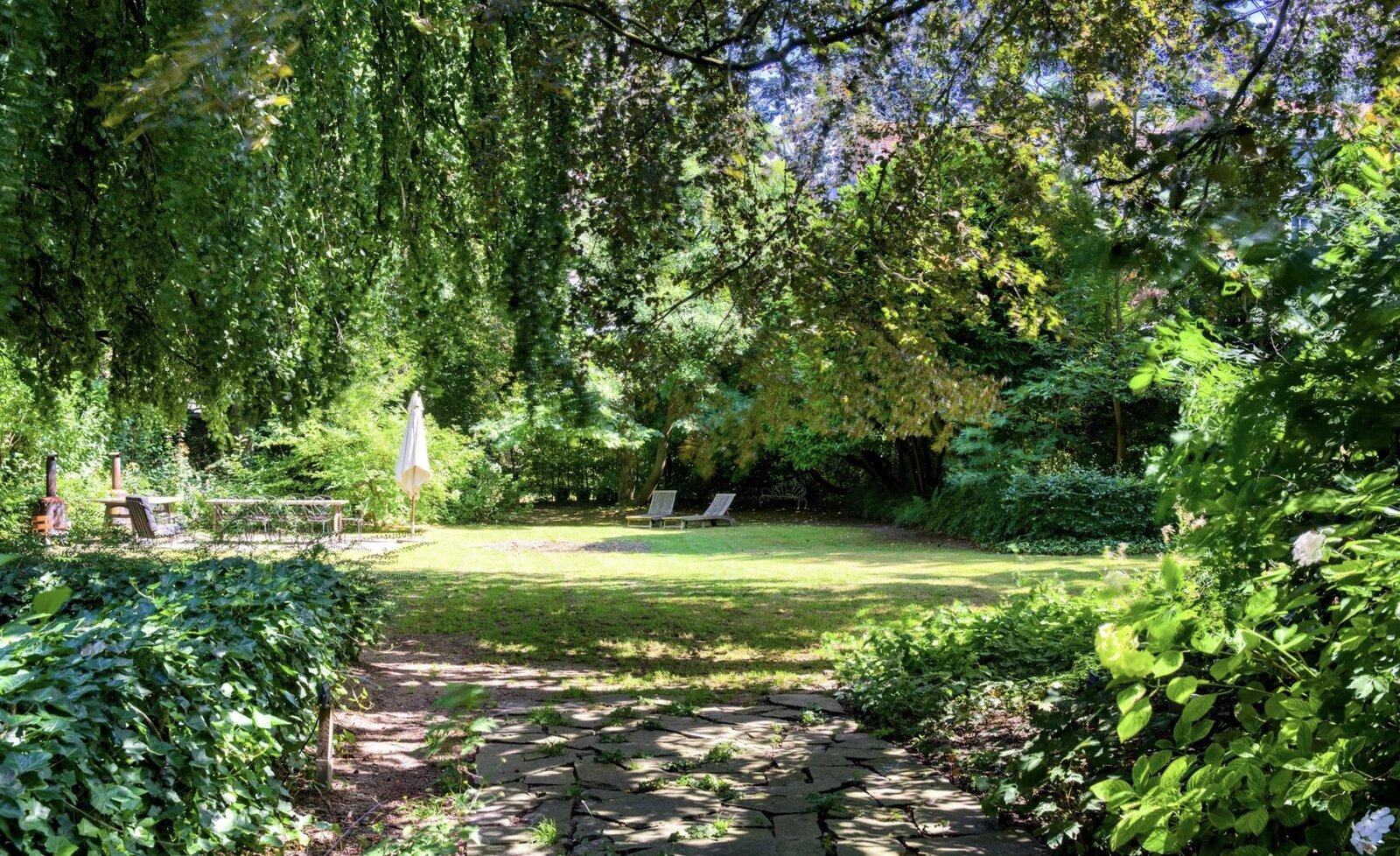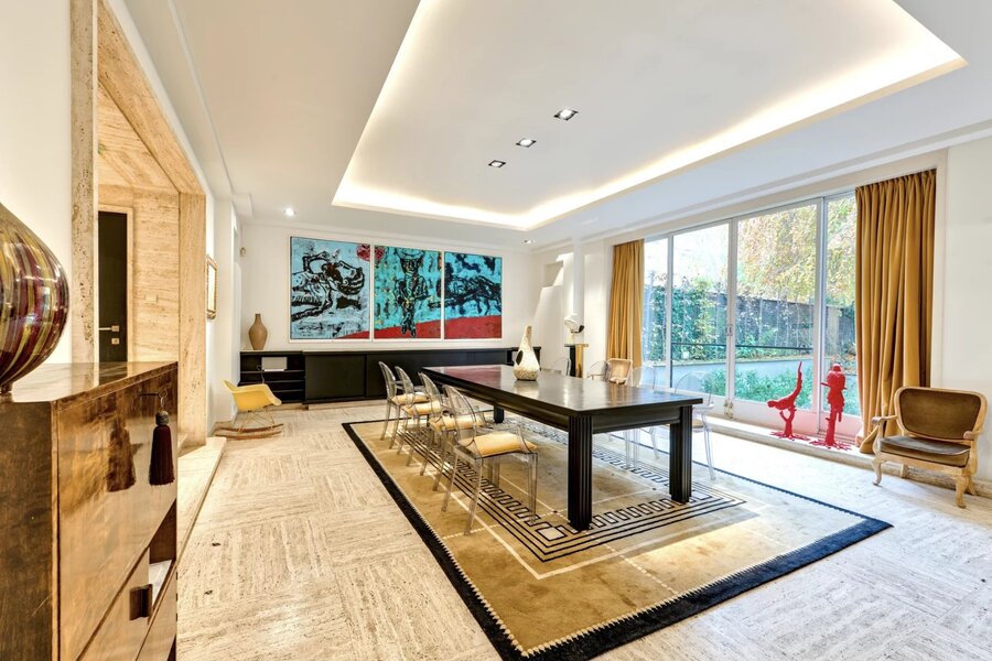 - Begane grond, een spectaculaire hal, een volledig uitgeruste keuken en een zeer grote eetkamer met open haard.