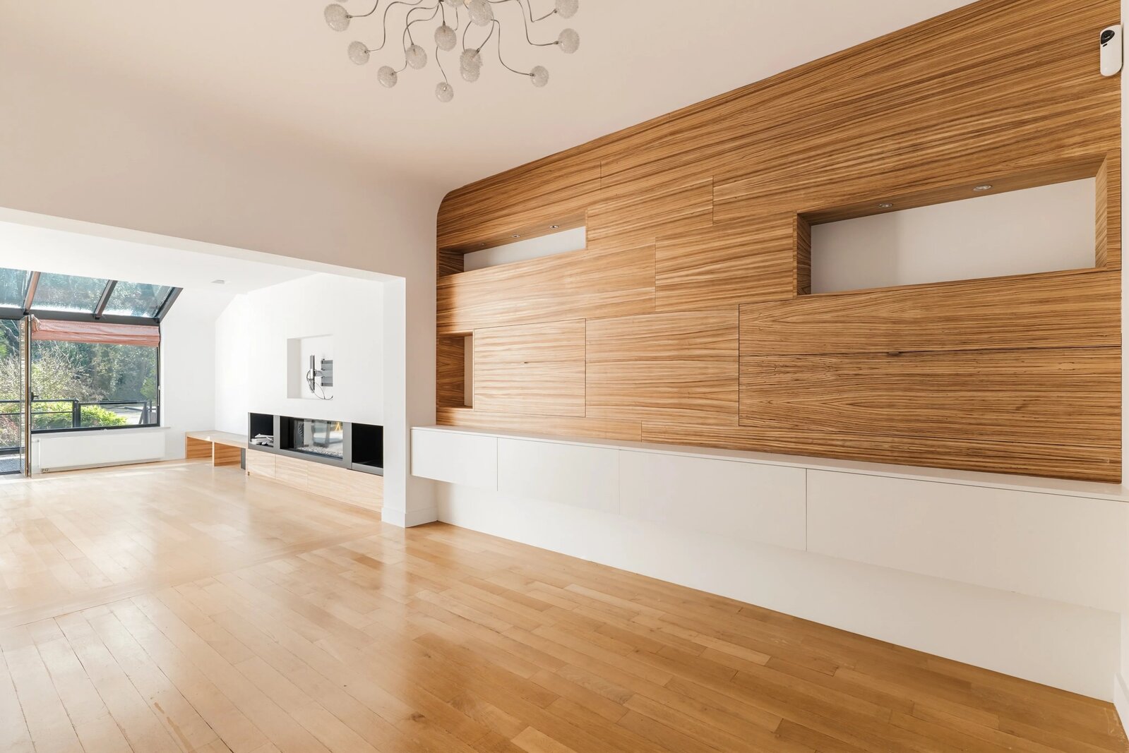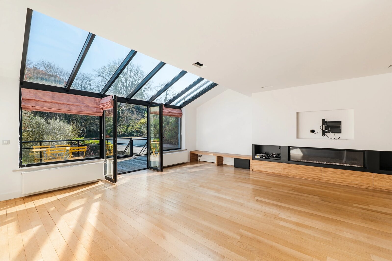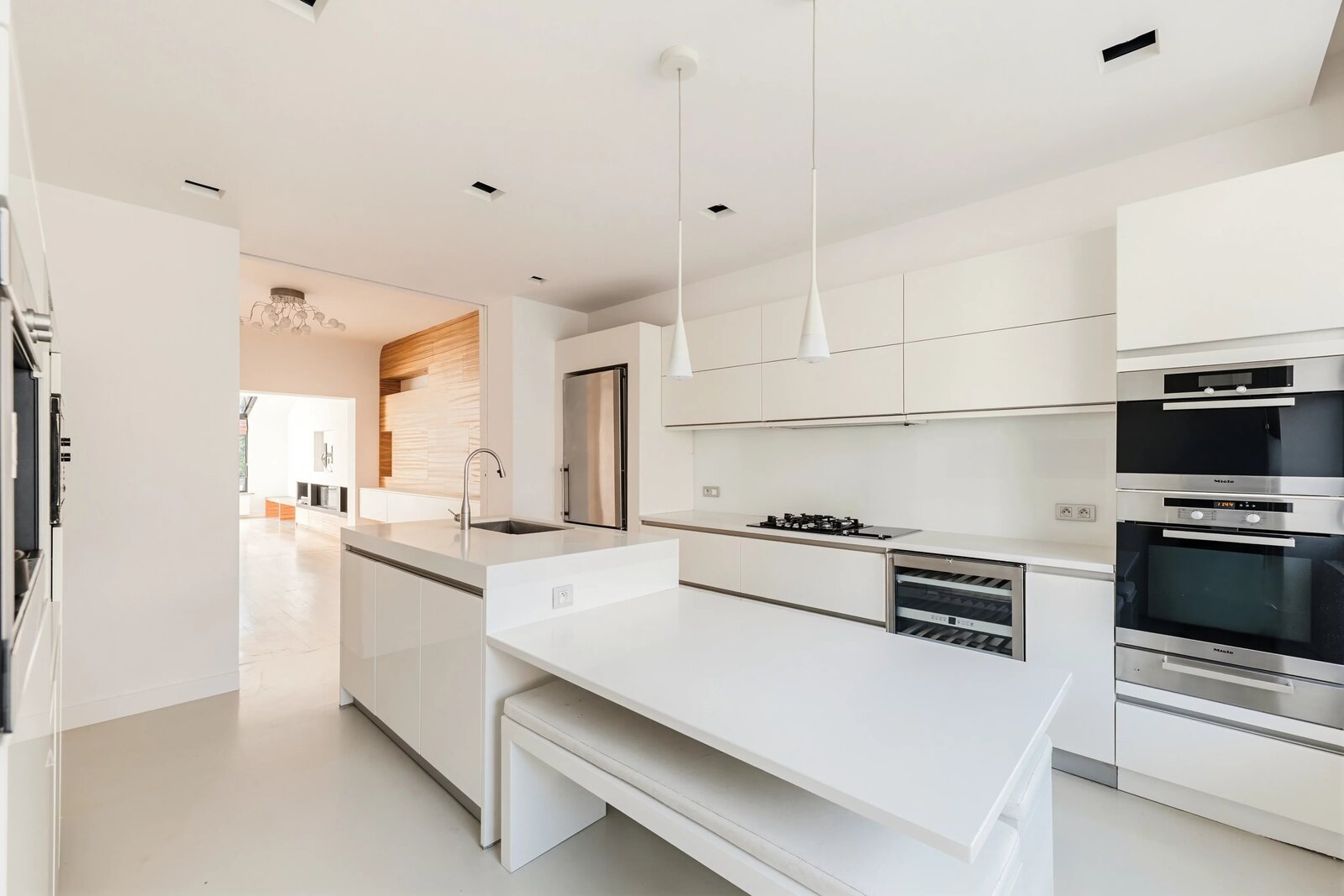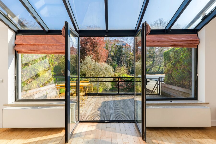 In de mooie verdieping: ruime ontvangstruimtes verlengd door een serres, een volledig uitgeruste open keuken (Miele) met wasruimte, en toegang tot het terras en de tuin.