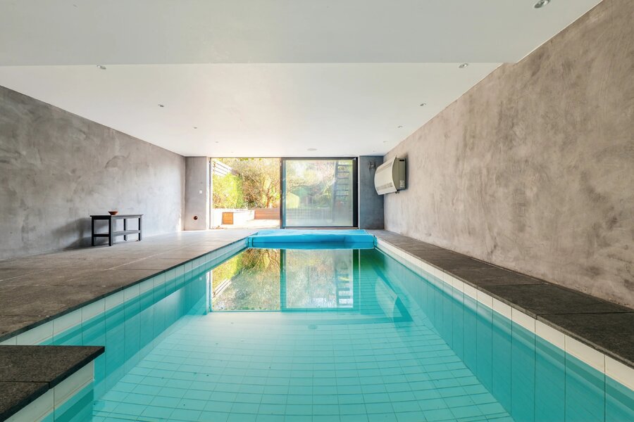 Op de begane grond: uitnodigende inkomhal, garage en zwembadruimte.