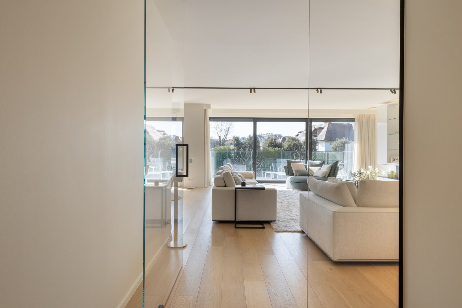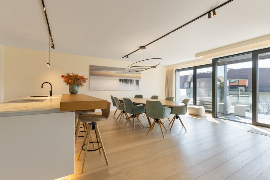 Inkomhal met gastentoilet en aparte toegang voor dienstverleners, een bijzonder ruime en lichtrijke leefruimte voorzien van alle comfort (gevelbreedte van 16,5m) die toegang geeft tot het zonnige terras. Daarbij is de woonkamer ook voorzien van een sfeervolle gashaard en een infraroodsauna. Verder beschikt het appartement over een open keuken, die volledig geïnstalleerd is met moderne toestellen.