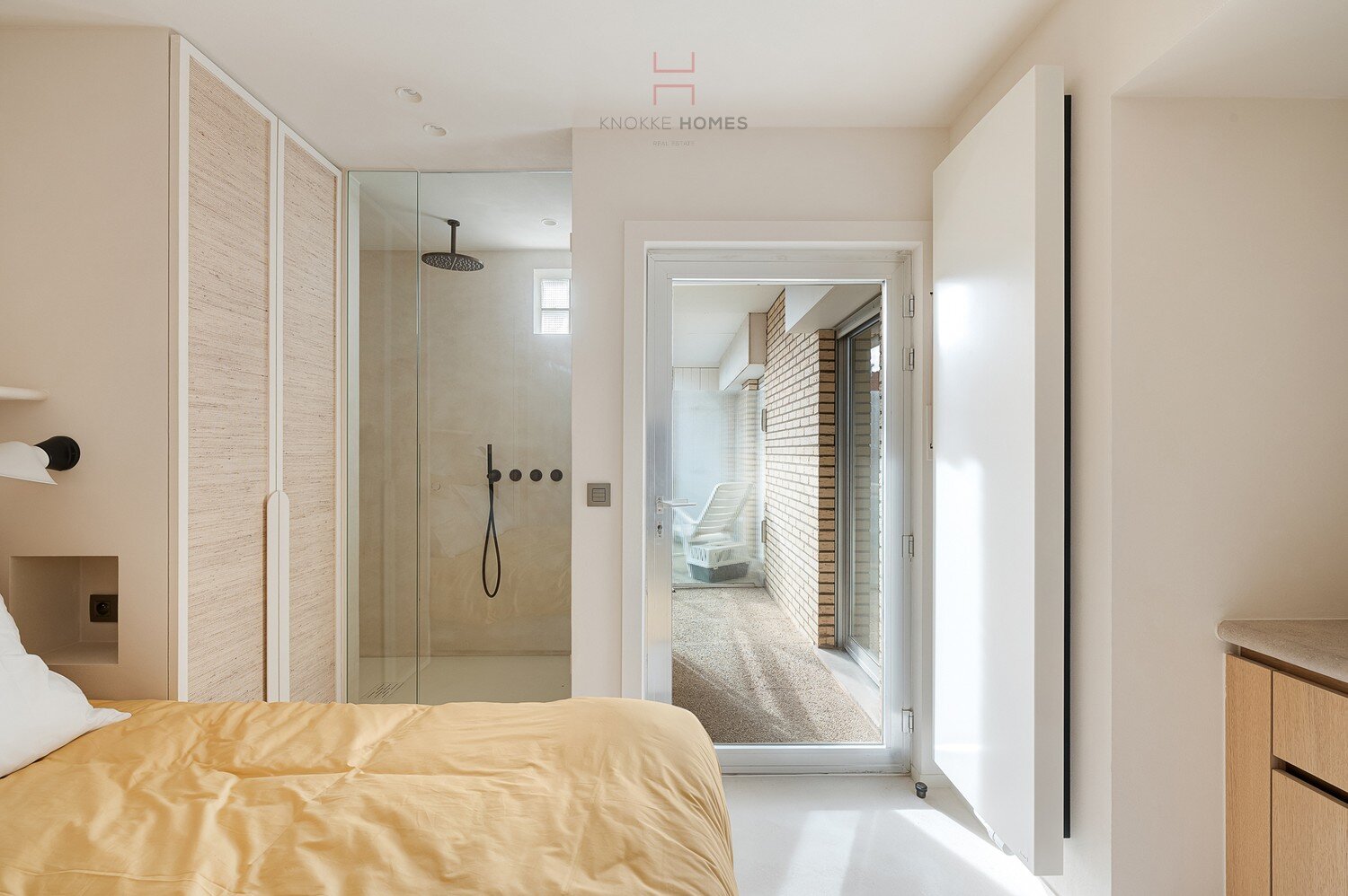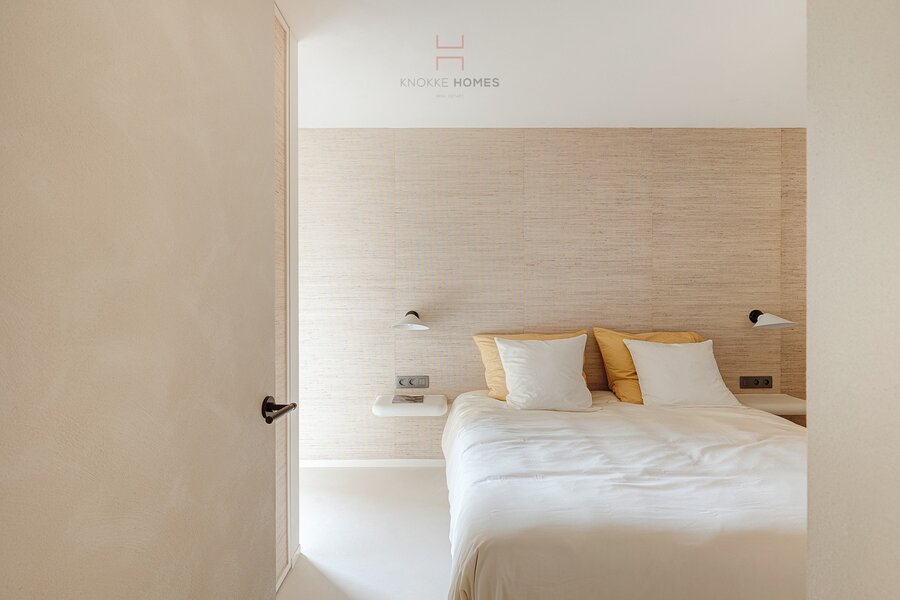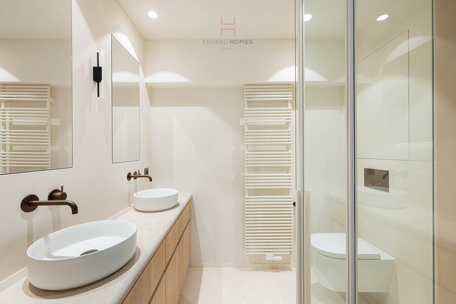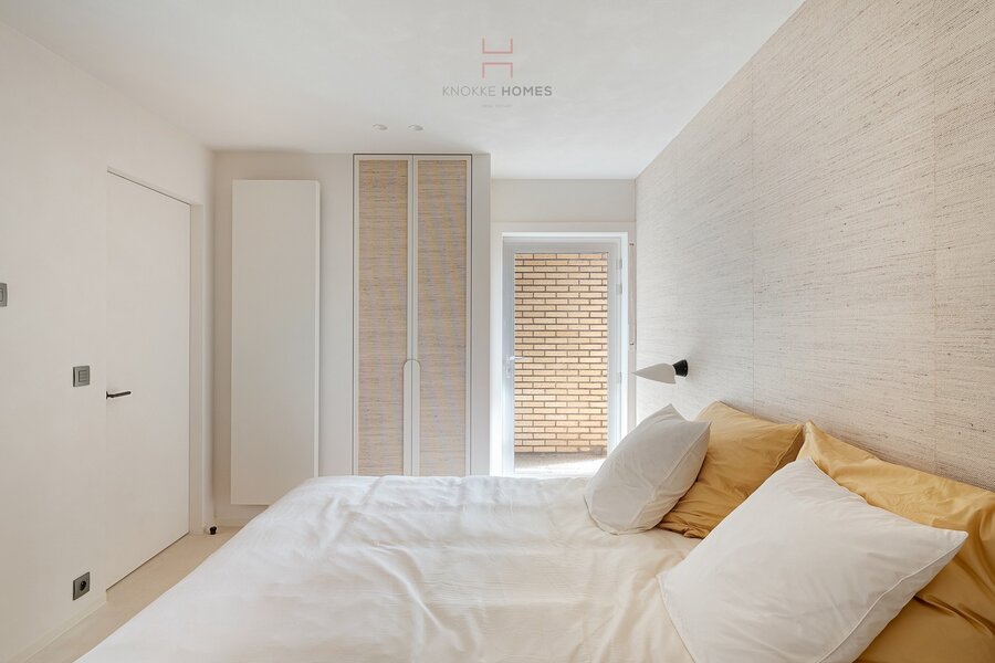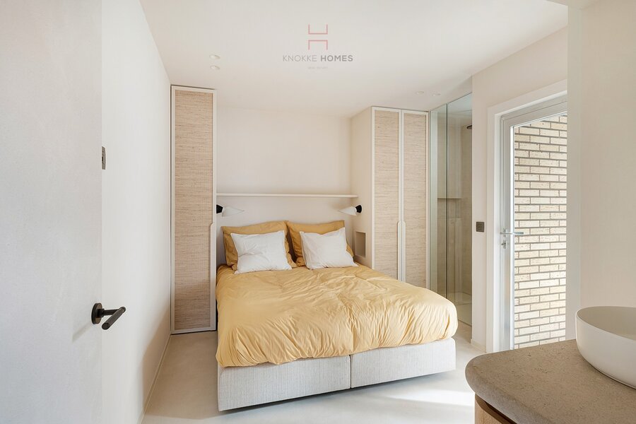 Het appartement beschikt over drie slaapkamers. De masterbedroom is voorzien van ingemaakte kasten en een en-suite badkamer met dubbele lavabo, inloopdouche en toilet. De tweede slaapkamer beschikt eveneens over maatkasten en een eigen douchekamer met lavabo. Beide kamers geven toegang tot een rustig achterliggend terras. De derde slaapkamer werd praktisch ingericht met een stijlvol lollipop-stapelbed, ideaal als kinder- of logeerkamer.