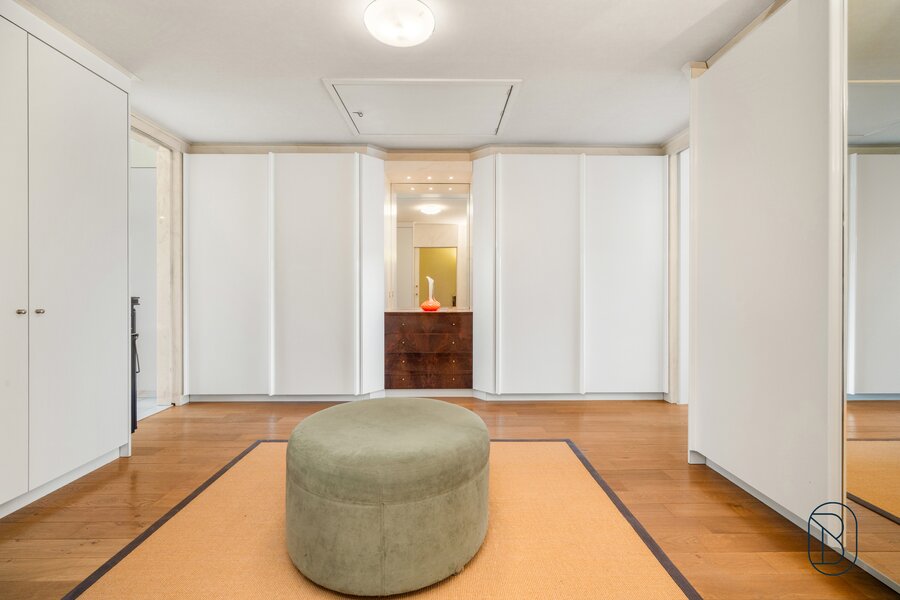 Het penthouse beschikt over drie slaapkamers, waarvan twee met ensuite badkamer. De master is voorzien van een dressing en een luxueuze marmeren badkamer met jacuzzi, douche en bidet. De grote leefruimte wordt overspoeld door natuurlijk licht dankzij de hoge raampartijen aan drie gevels, en geeft uit op twee ruime, verbonden terrassen met uitzicht op het groene park en het kasteeltje.