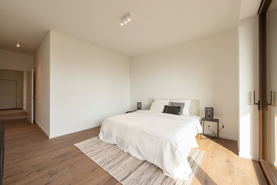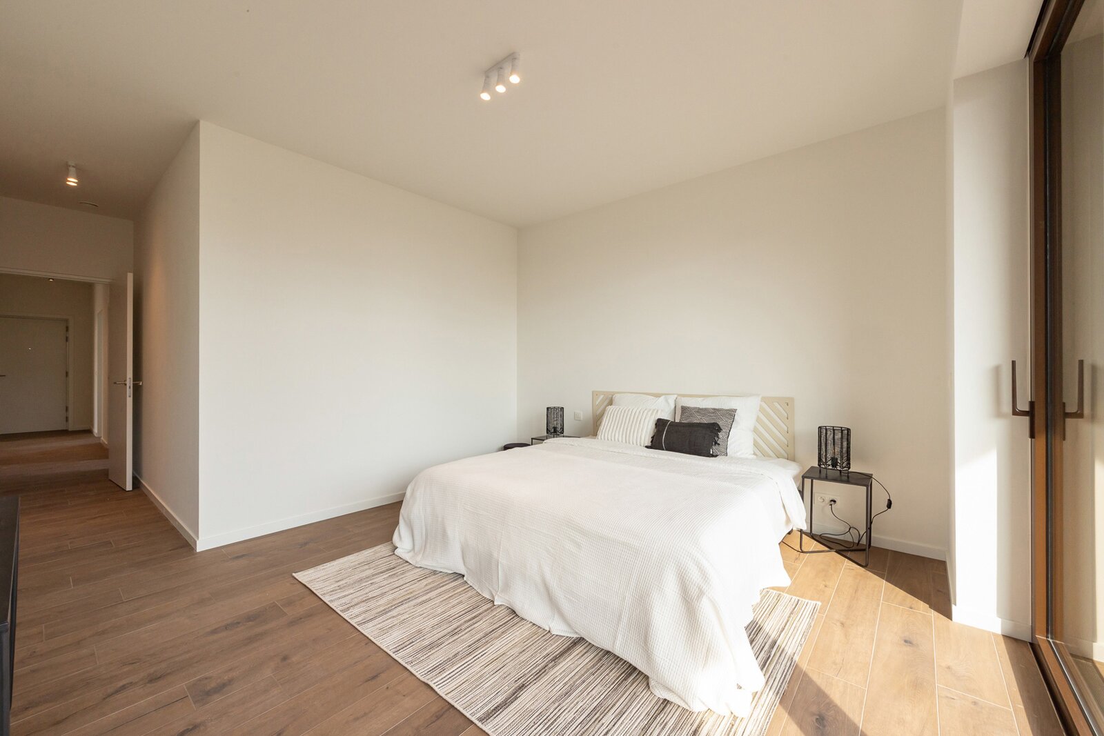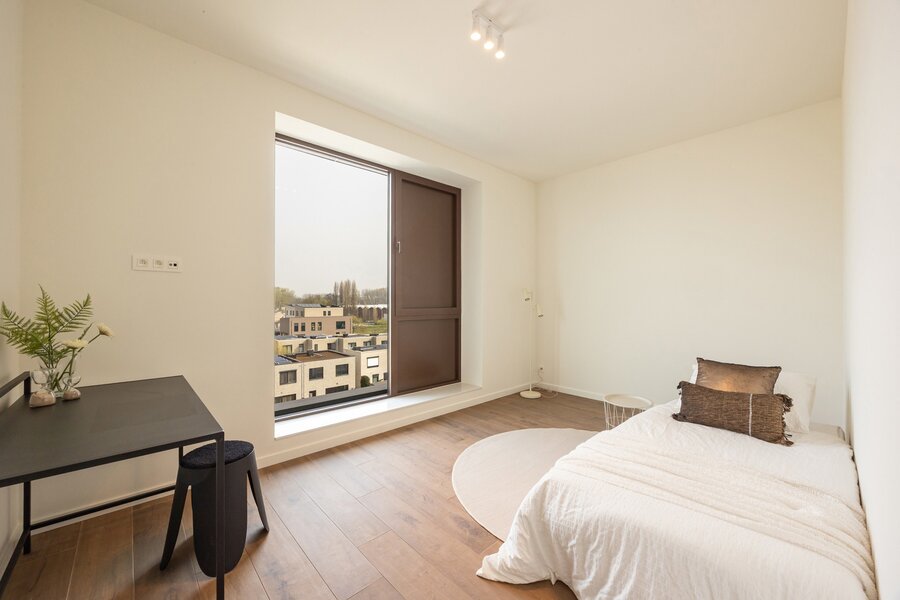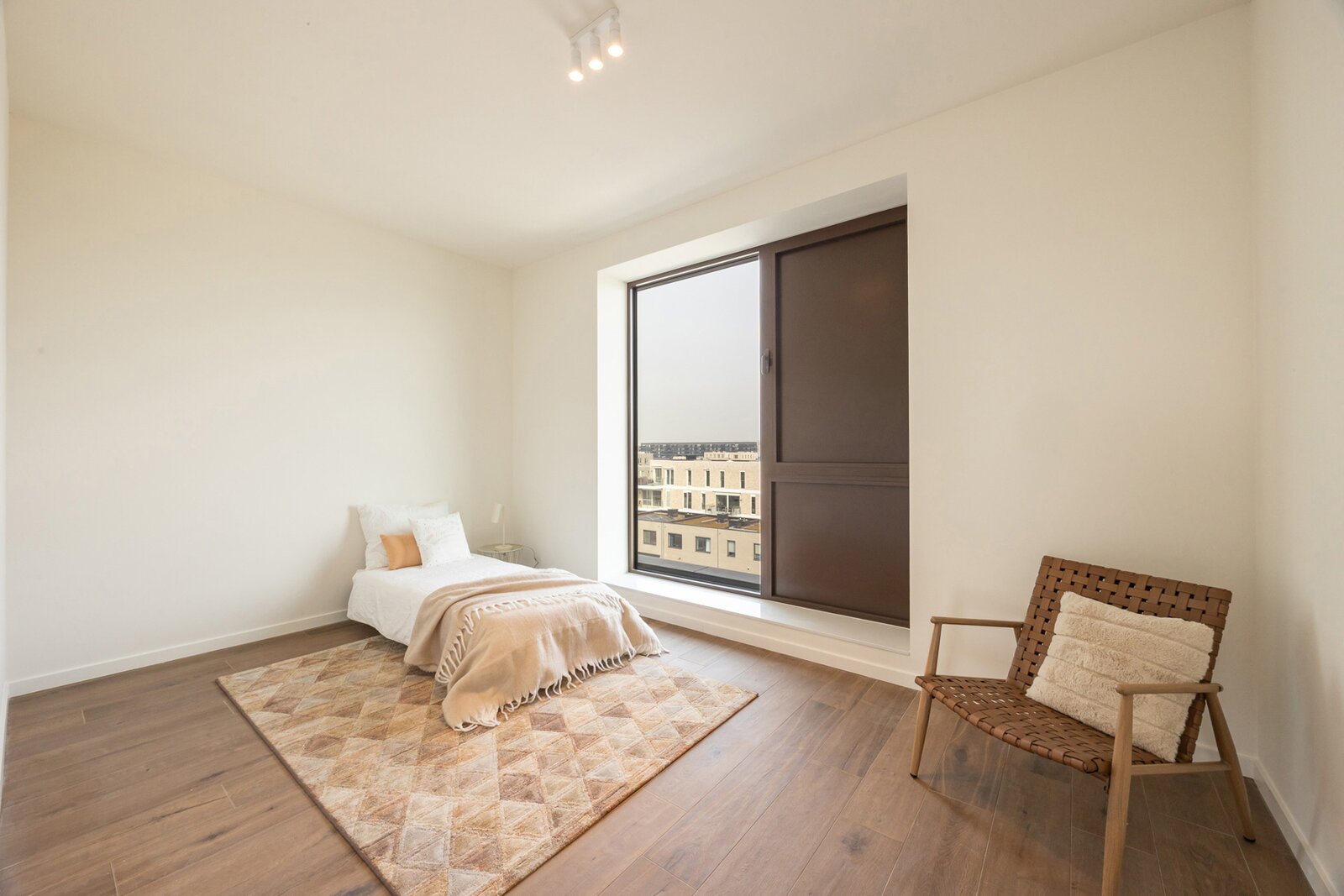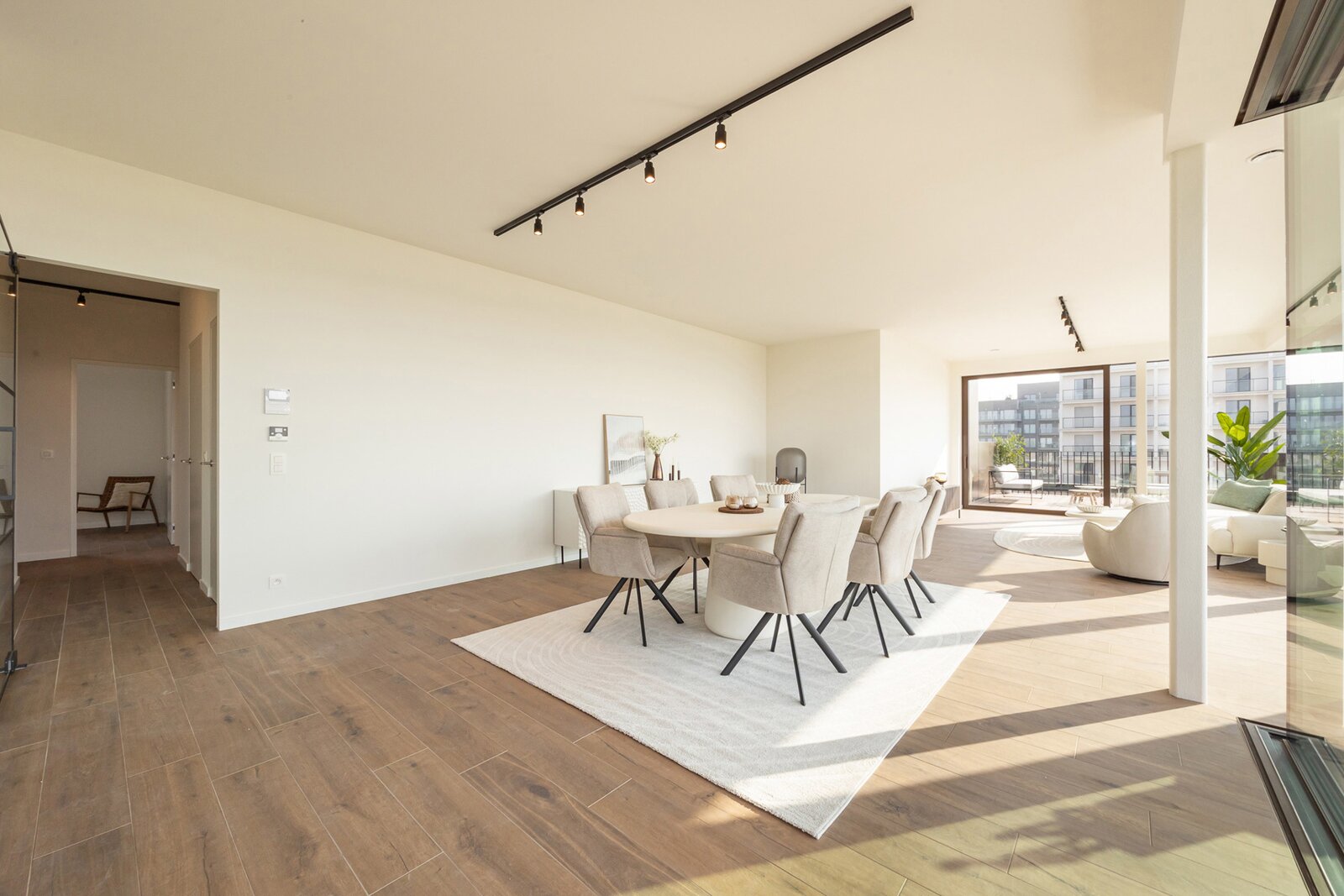 Dit uitzonderlijke dakappartement verwelkomt u via een stijlvolle inkomhal, voorzien van een gastentoilet en een praktische berging/wasplaats. De nachthal geeft toegang tot drie volwaardige slaapkamers, waaronder een riante master bedroom met een luxueuze en suite badkamer, uitgerust met een inloopdouche, ligbad, dubbele wastafel en toilet. Aansluitend geniet de master van een dressingruimte en directe toegang tot een terras van 14 m², een ideale plek om te genieten van het uitzicht.