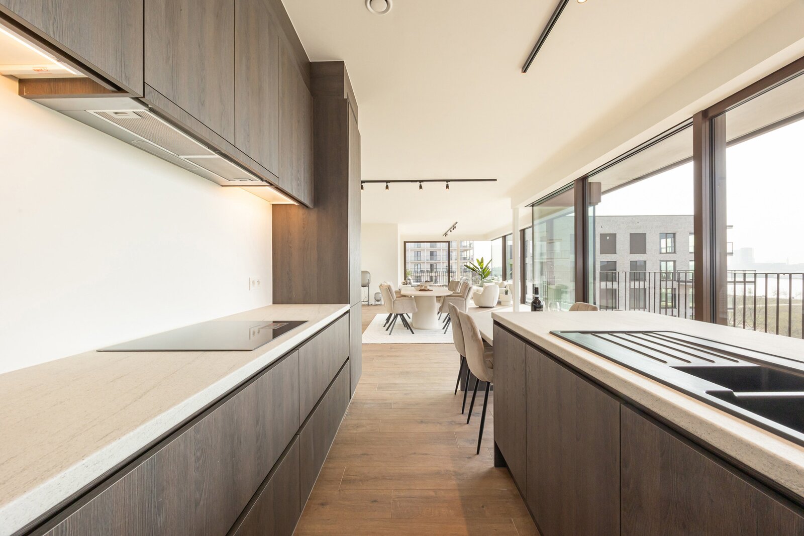 De twee overige slaapkamers delen een tweede, smaakvol ingerichte badkamer, voorzien van een enkel lavabomeubel en een inloopdouche. Doorheen het volledige appartement werd gekozen voor een hoogwaardige lichte steenparket voor een warme en tijdloze uitstraling. Via een smeedijzeren deur betreedt u de riante, lichtrijke leefruimte. Volledig geïnstalleerde leefkeuken met gezellige ontbijthoek en aansluitend bevindt zich de eetruimte, die uitgeeft op een tweede terras van 14 m².