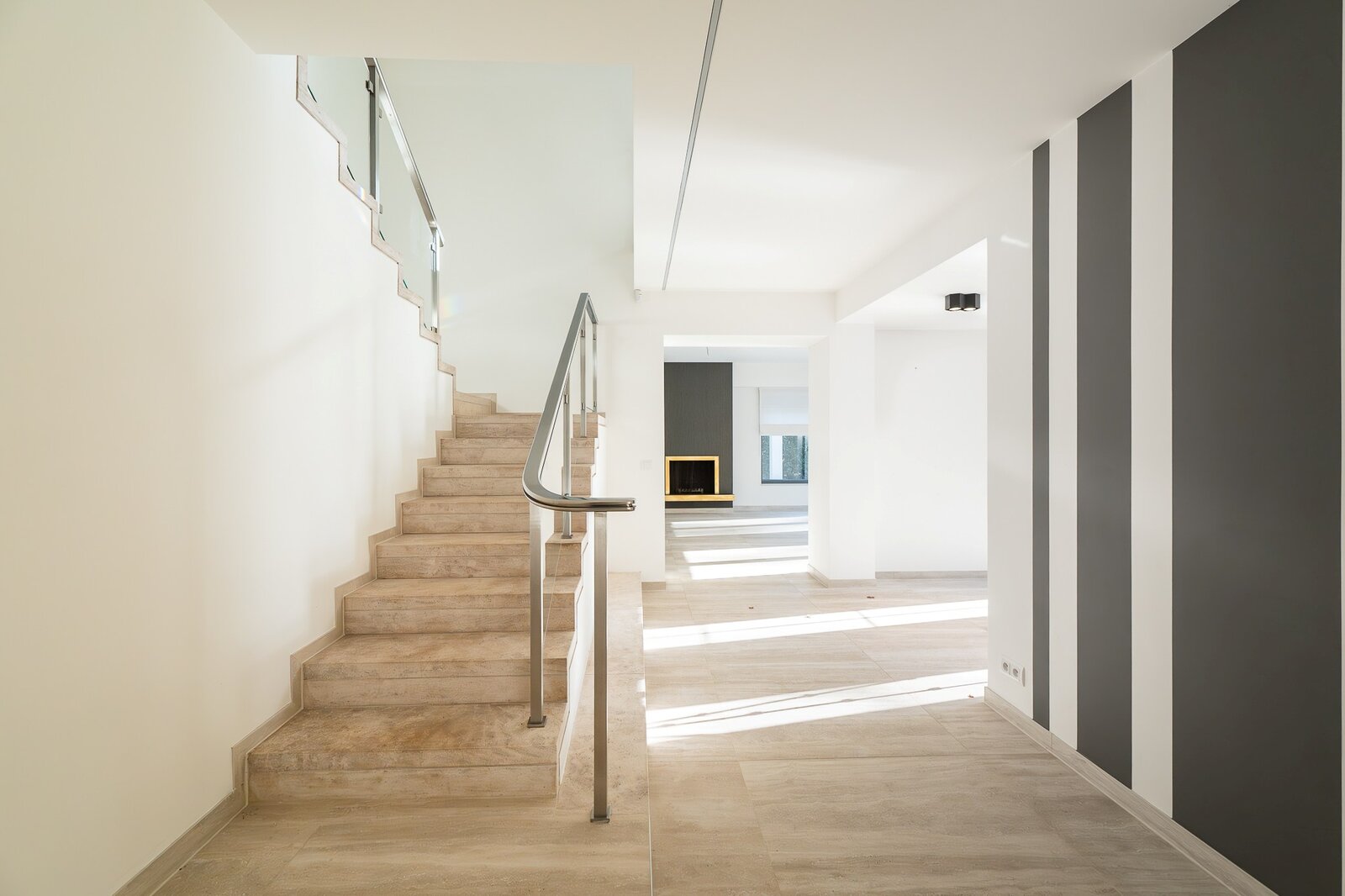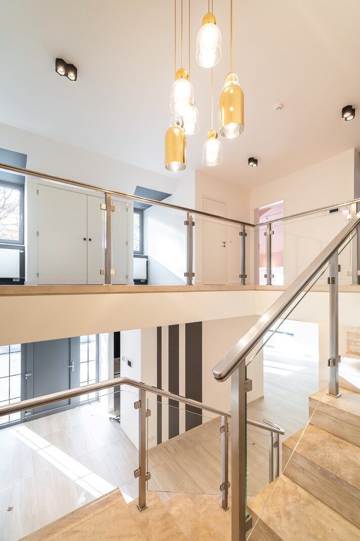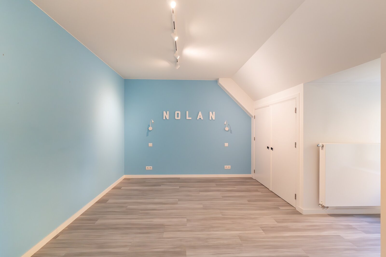 De begane grond heeft een ruime hal, lichte ontvangstruimtes en een gezellige, volledig uitgeruste keuken. De bovenverdieping heeft twee slaapkamers met badkamers en een ouderlijke suite met kleedkamer, eigen badkamer en terras. De tweede verdieping biedt een veelzijdige ruimte, een extra slaapkamer, een badkamer en een wasruimte. In de kelder is er een sportschool, speelkamer en veel opbergruimte.