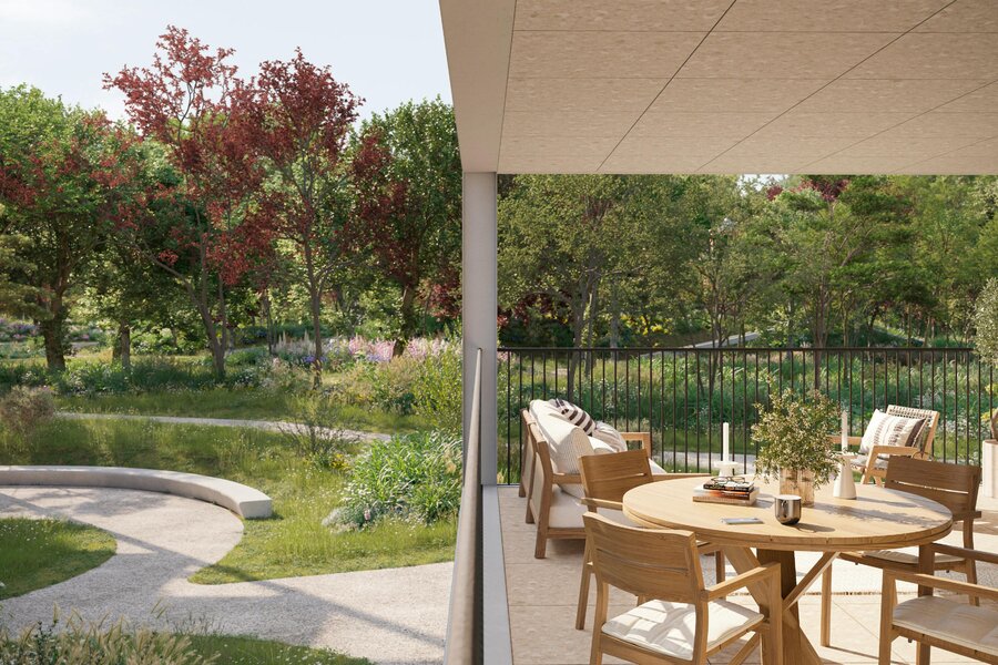 Vanop de twee uitzonderlijk ruime terrassen met een totale oppervlakte van 46 m² en een dubbele oriëntatie geniet u van een adembenemend uitzicht op het omliggende groen en de rustgevende parkomgeving.