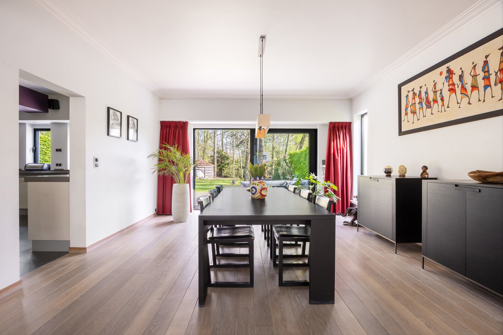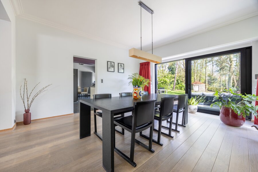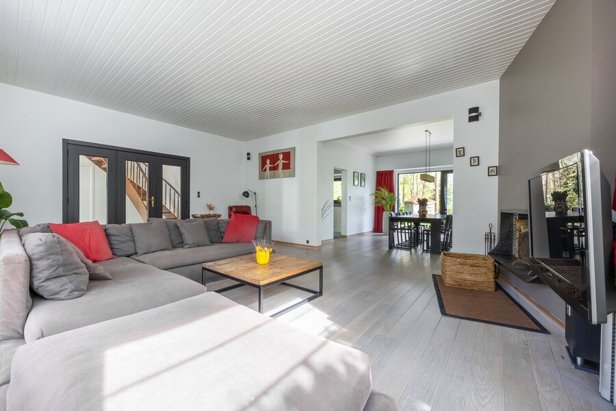 De inkom leidt je naar een verzorgde leefruimte waar de zithoek met open haard meteen voor sfeer zorgt. Aansluitend ligt de eetplaats met zicht op de tuin, waar grote glaspartijen zorgen voor een open en lichte beleving.