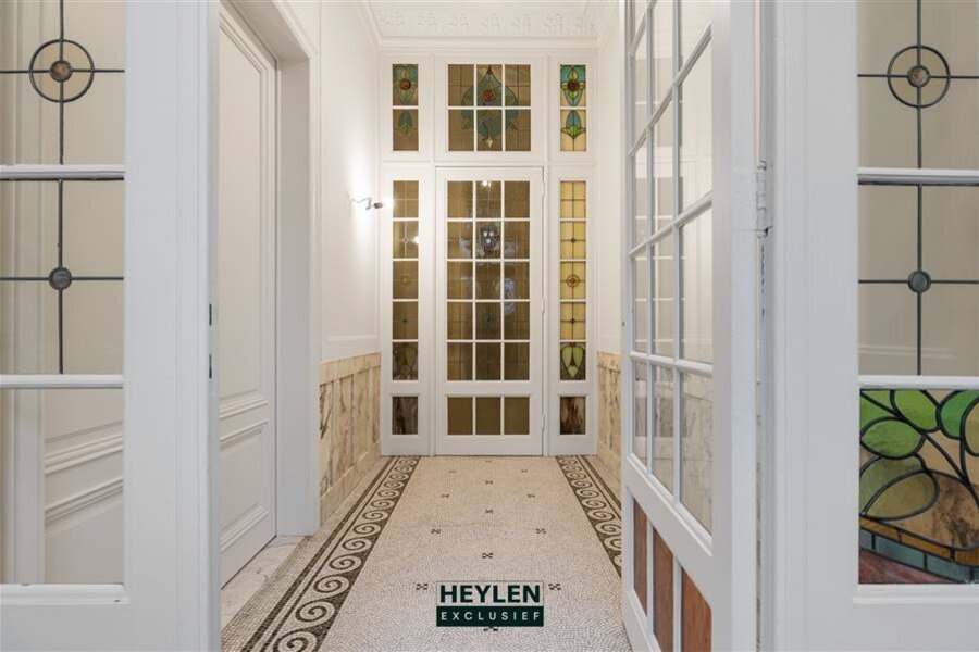 Via de statige inkom betreedt men een interieur waar authenticiteit en verfijning centraal staan. De royale inkomhal met marmeren mozaïekvloer en dubbele toegangsdeur zet meteen de toon. In het bovenlicht van deze deur prijkt een ovaal brandglasmedaillon dat een trofee van bouwmeestersattributen verbeeldt, waaronder meetlat, winkelhaak en kapiteel, een verfijnde verwijzing naar de oorspronkelijk hier gevestigde architectenpraktijk.
