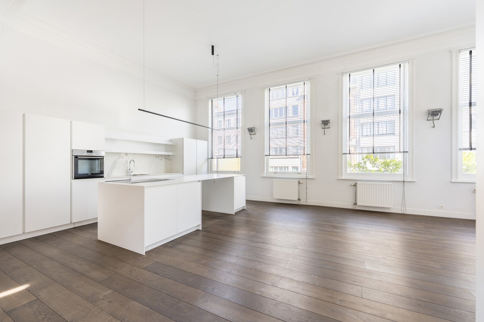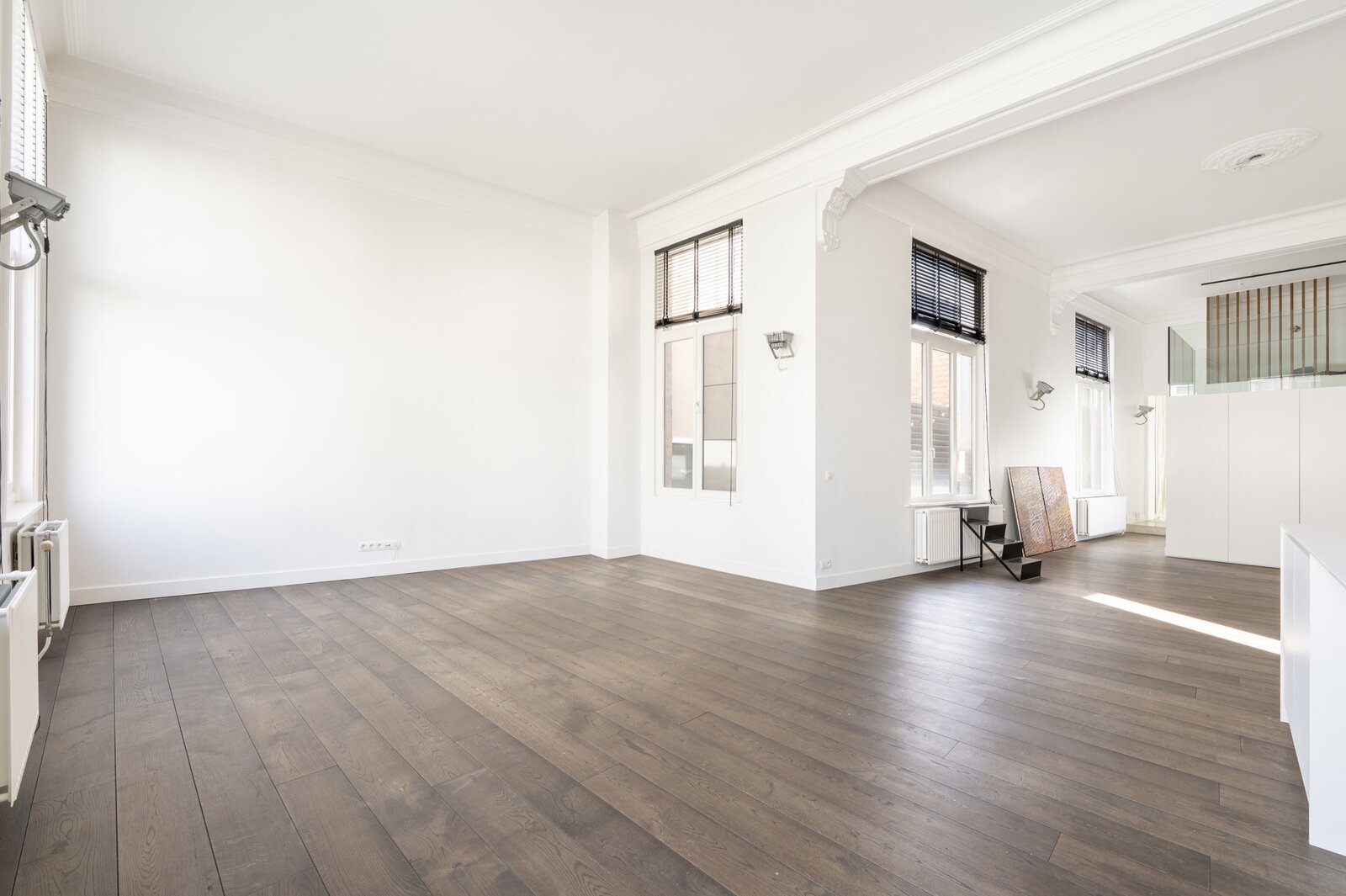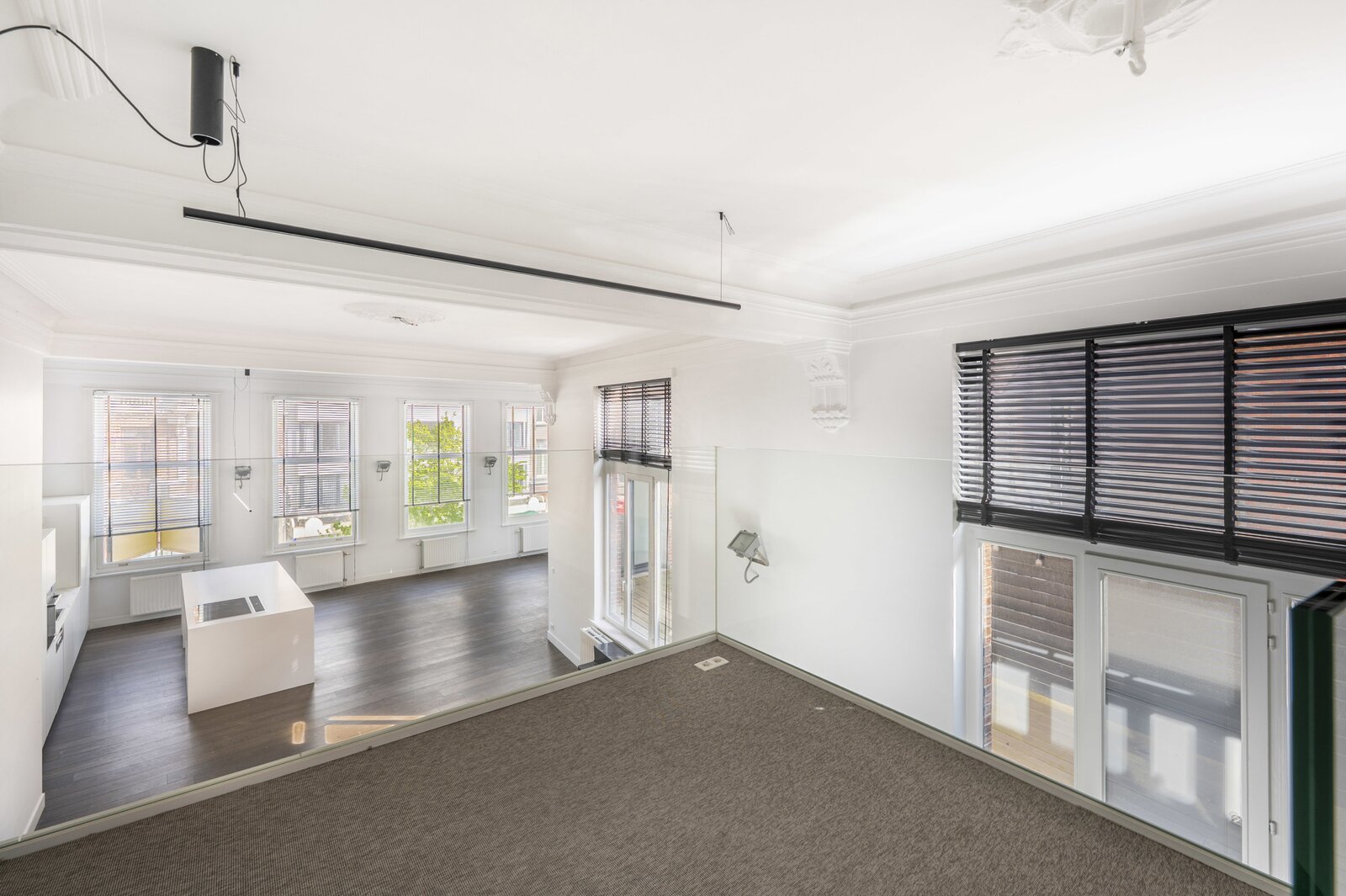 Dit prachtige loftappartement op het eerste verdiep van een bel-époque gebouw aan de Paardenmarkt combineert modern comfort met authentieke charme. Met een bewoonbare oppervlakte van 125 m² geniet u van een open leefruimte met eetkamer en keuken, waar de hoge plafonds, moulures en de mooie donkerbruine parketvloer meteen in het oog springen. De grote raampartijen zorgen voor een overvloed aan lichtinval en versterken het ruimtelijk gevoel. De luxueuze afwerking komt doorheen het volledige appartement terug, waarbij modern en charmant hand in hand gaan. Via de leefruimte bereikt u de mezzanine, ideaal als bureau of tweede slaapplek. Verder is er een praktische wasruimte en een aparte wc voorzien. Achteraan het gebouw bevindt zich de ruime en rustige slaapkamer met inbouwkasten en een aansluitende badkamer met inloopdouche; hier werd bovendien vloerverwarming geplaatst voor extra comfort.