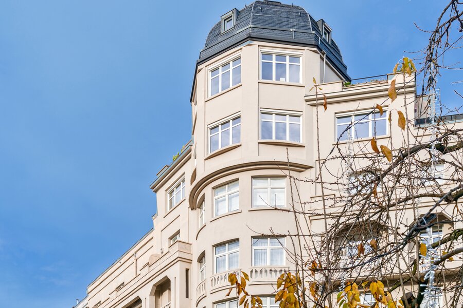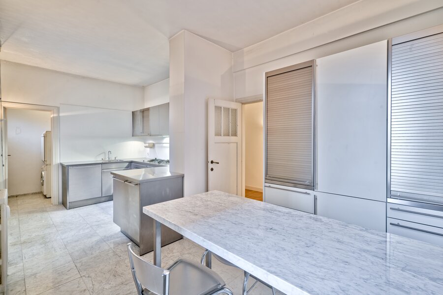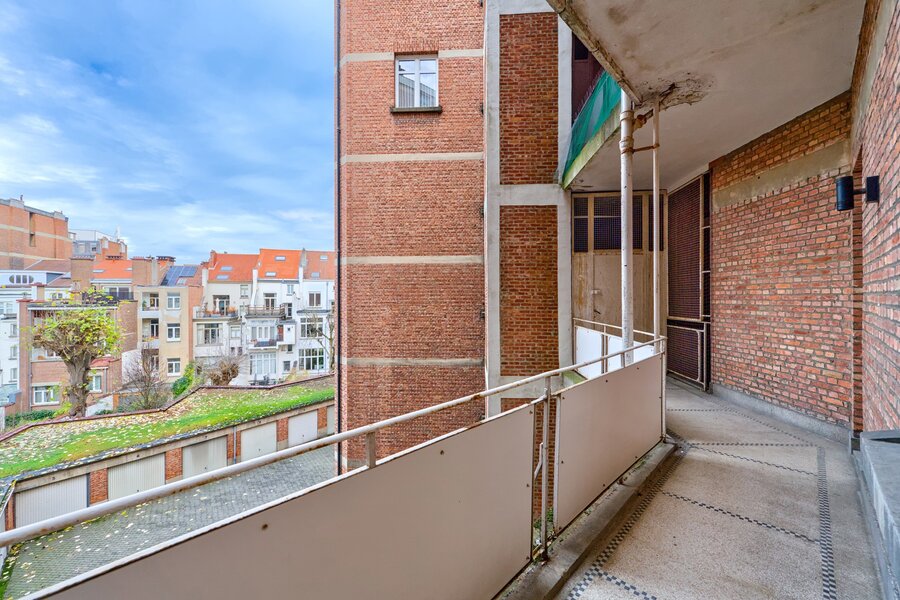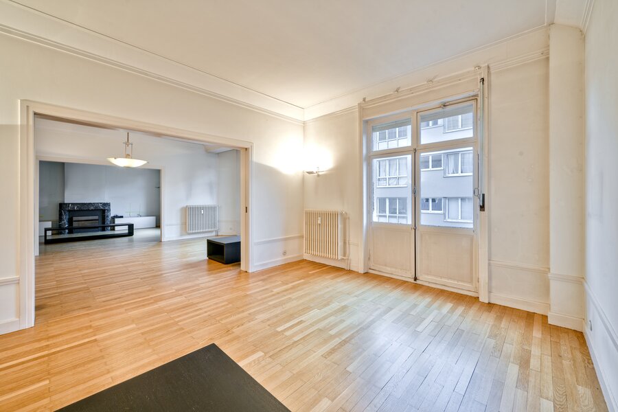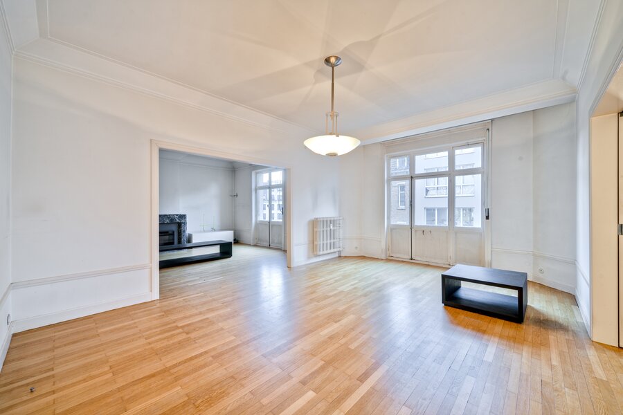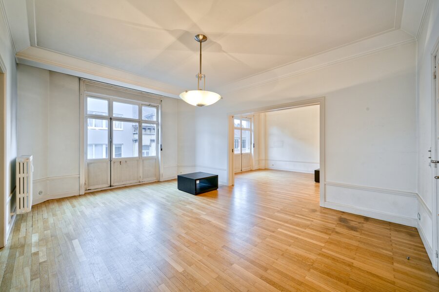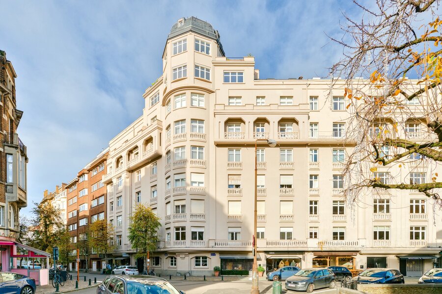 Vlakbij het Brugmannplein, in een prachtig art-decogebouw uit 1929, mooi appartement van +/- 215 m² + terras op de 3e verdieping, volledig gerenoveerd met behoud van de stijl van die tijd. Ruime ontvangstruimtes, parketvloer, hoge plafonds, lijstwerk, superuitgeruste keuken (Buthaup, roestvrij staal), 3 slaapkamers, 2 badkamers. 2 kelders, grote dienstmeisjeskamer op de 7e verdieping. Verplichte aankoop van een grote garage aan de binnenplaats voor € 85.000. EPC F. Zeer mooie afwerking.