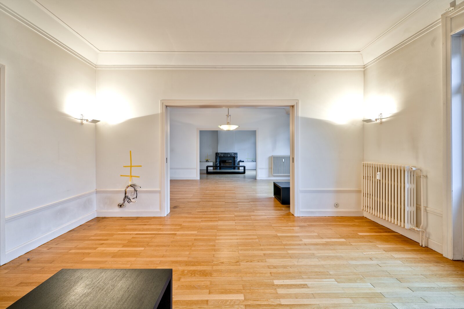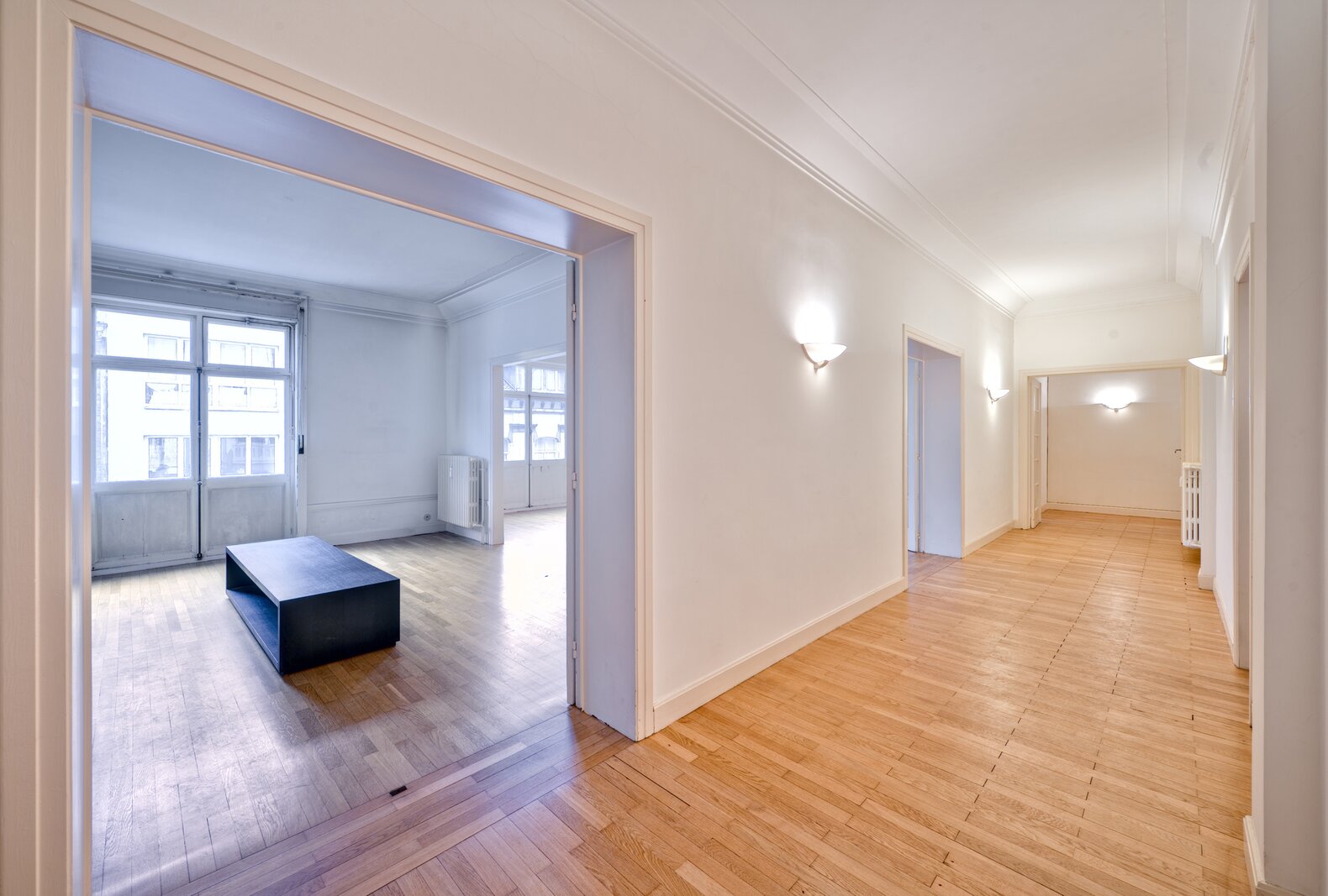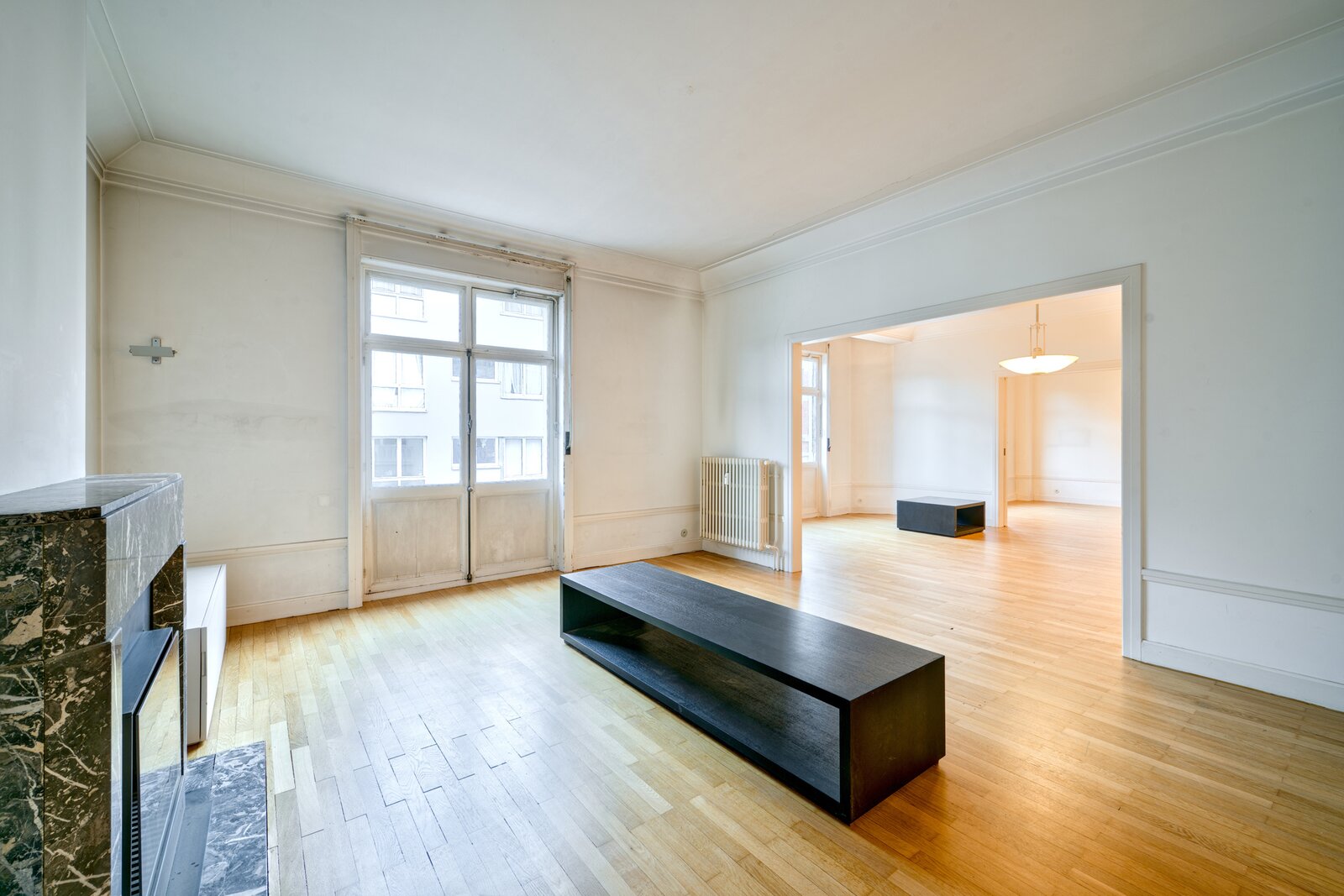 Vlakbij het Brugmannplein, in een prachtig art-decogebouw uit 1929, mooi appartement van +/- 215 m² + terras op de 3e verdieping, volledig gerenoveerd met behoud van de stijl van die tijd. Ruime ontvangstruimtes, parketvloer, hoge plafonds, lijstwerk, superuitgeruste keuken (Buthaup, roestvrij staal), 3 slaapkamers, 2 badkamers. 2 kelders, grote dienstmeisjeskamer op de 7e verdieping. Verplichte aankoop van een grote garage aan de binnenplaats voor € 85.000. EPC F. Zeer mooie afwerking.