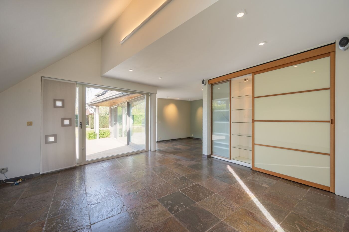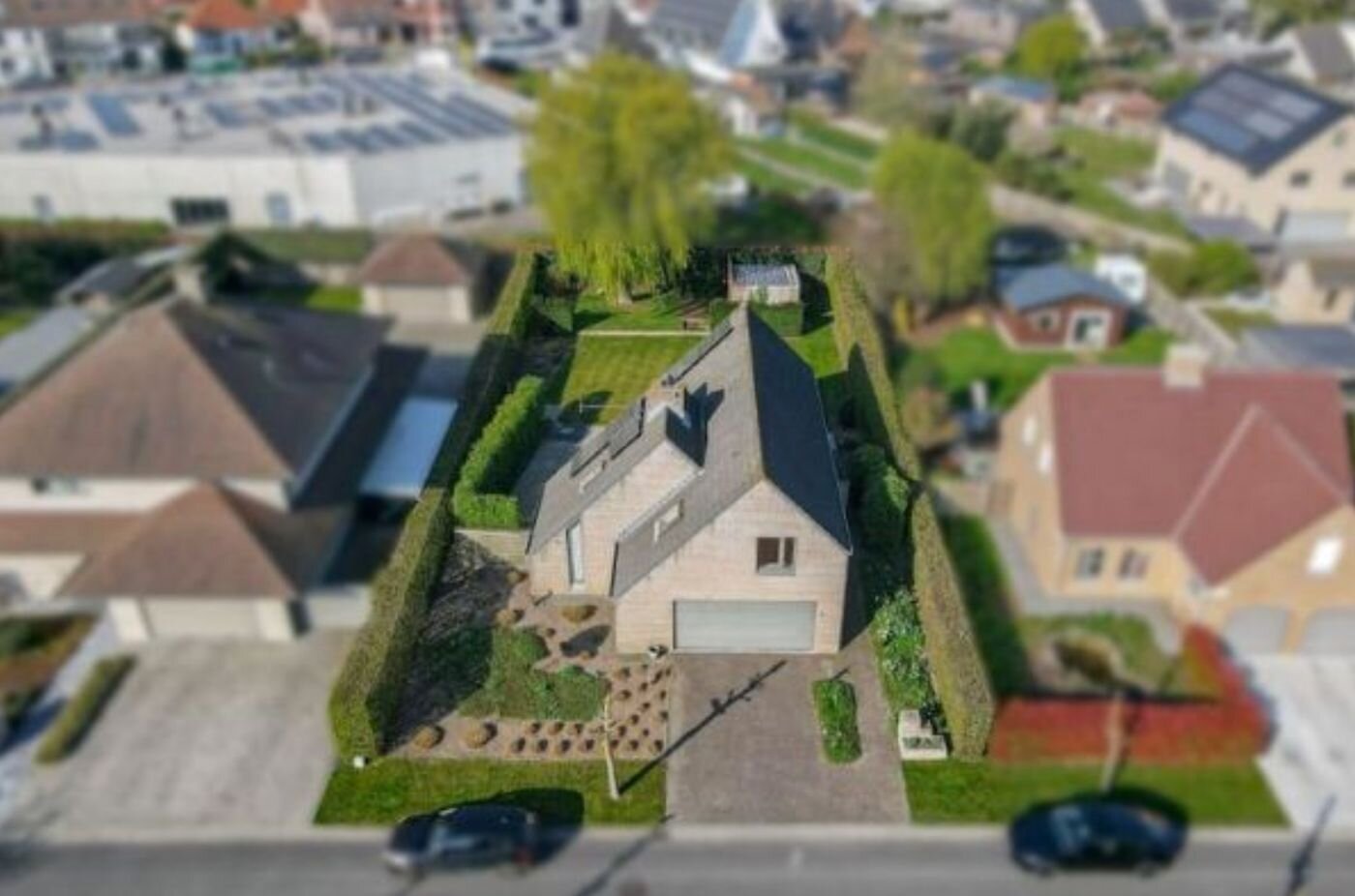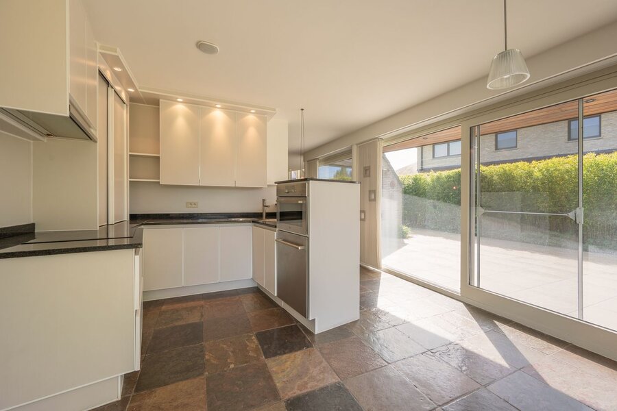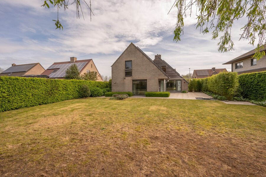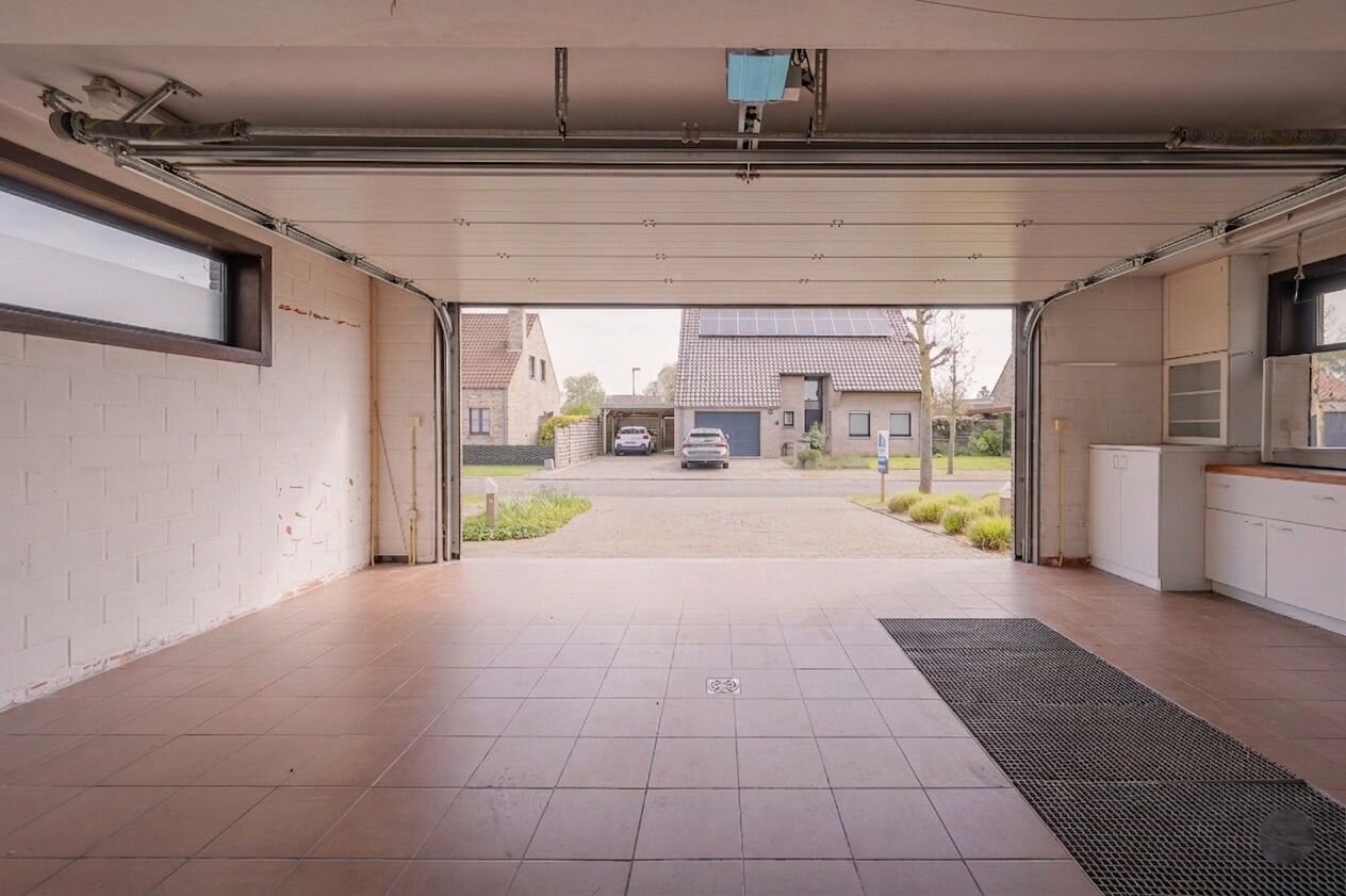 De woning is gelegen op een zonnig perceel van 815 m² met een zuidwestelijke oriëntatie. Het gelijkvloers omvat een ruime en open inkomhal die toegang biedt tot de lichtrijke leefruimte met eetplaats en de ingerichte keuken. Daarnaast beschikt de woning over een praktische wasberging met aparte douche en een bijzonder ruime garage met sectionale poort, geschikt voor twee wagens.