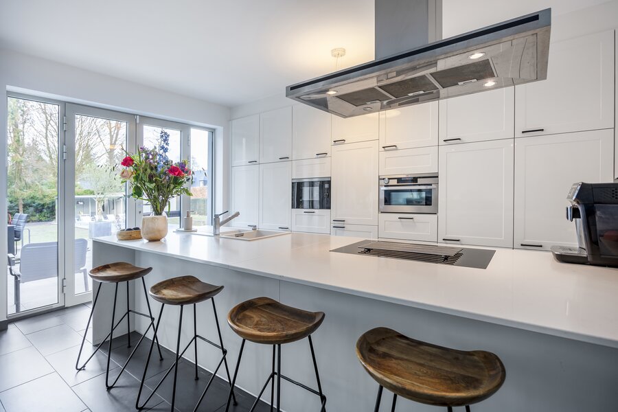 Bij het binnenkomen leidt de inkomhal naar de ruime en lichtrijke leefruimte, bestaande uit een gezellige woonkamer, een eetruimte en een open leefkeuken. Grote raampartijen zorgen voor een mooie verbinding met de tuin en laten u in de zomer genieten van koken en tafelen met zicht op het zwembad, het luxueuze poolhouse én het ruime terras dat aan het huis is verbonden.