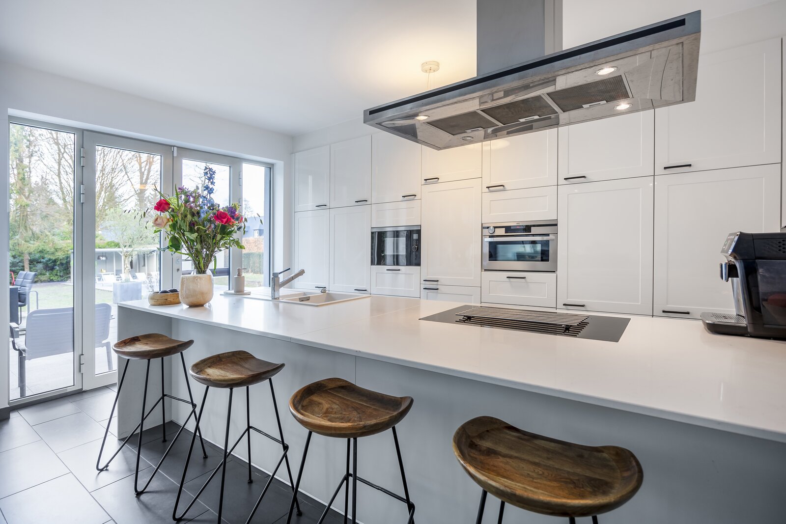 De tuin vormt een echte buitenbeleving. Aan het zwembad geniet u de hele dag van de zon, terwijl het poolhouse met overdekt terras en het aangelegde terras aan het huis zorgen voor instant vakantiesfeer, gewoon bij u thuis.