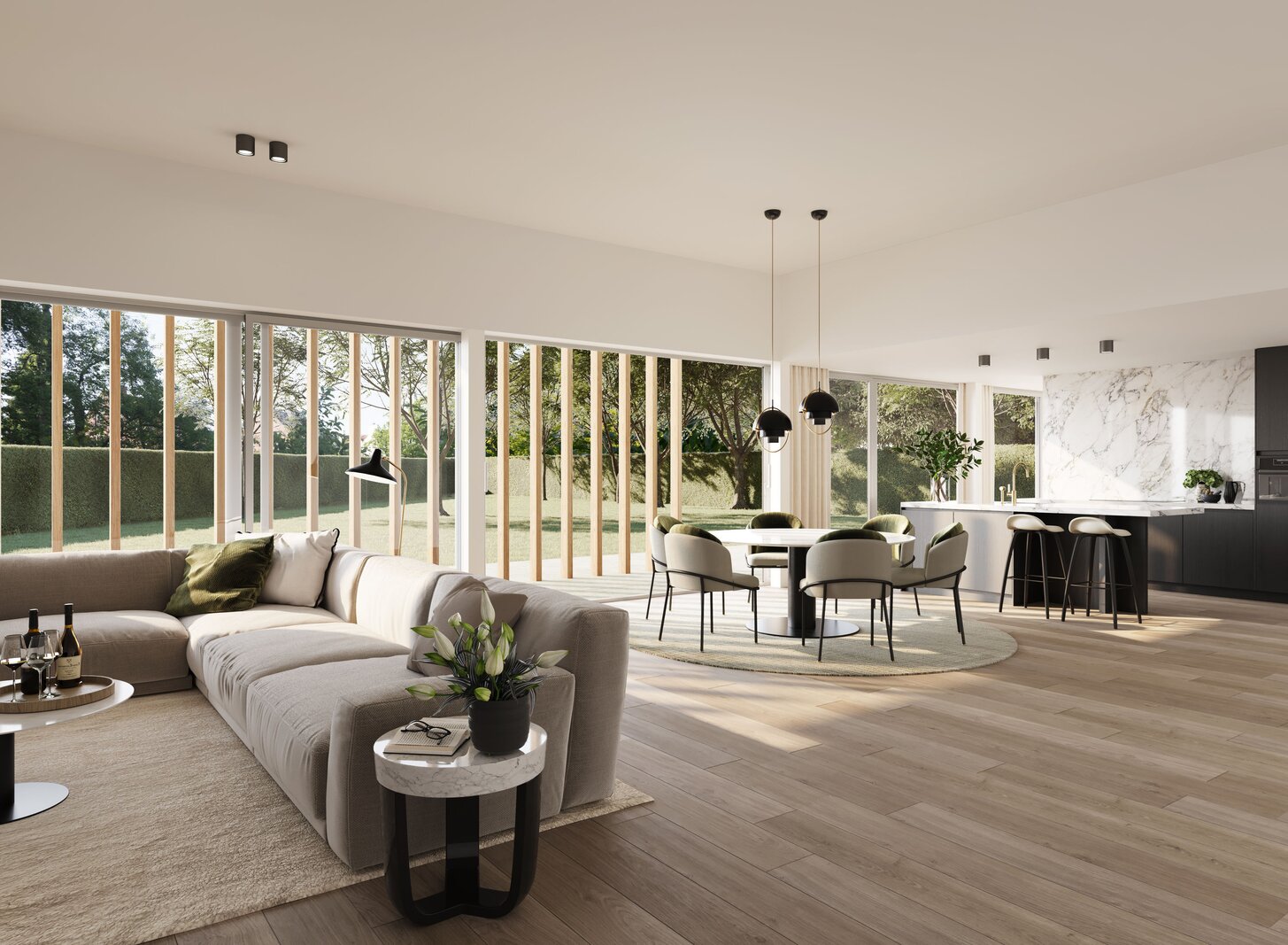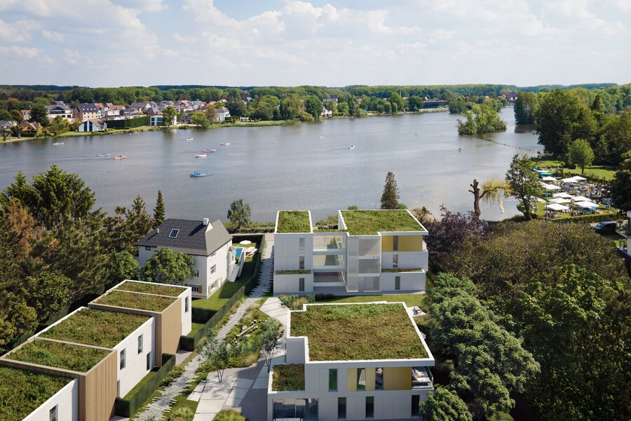 Deze unieke & hedendaagse villa is gelegen in een uitzonderlijk project waar water & groen centraal staan. Je woont op slechts enkele tientallen meters van het Donkmeer en de volledige woning is omgeven door een groen park. Je betreedt de woning in de inkomhal van waar je toegang hebt tot het aparte gastentoilet en de bureauruimte (10m²) . Wanneer je verder doorwandelt, kom je in de ruime woonkamer (45m²) terecht. Hier is de open keuken volledig geïntegreerd in het geheel & voorzien van een praktische berging (8m²). De volledige woonkamer is omgeven door grote raampartijen waardoor je ongelooflijk veel natuurlijk licht binnen krijgt. De woonkamer is omgeven door je eigen privatieve terras (36m²) & grote tuin (504m²).