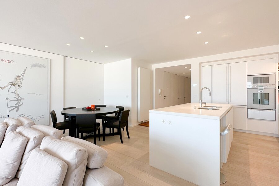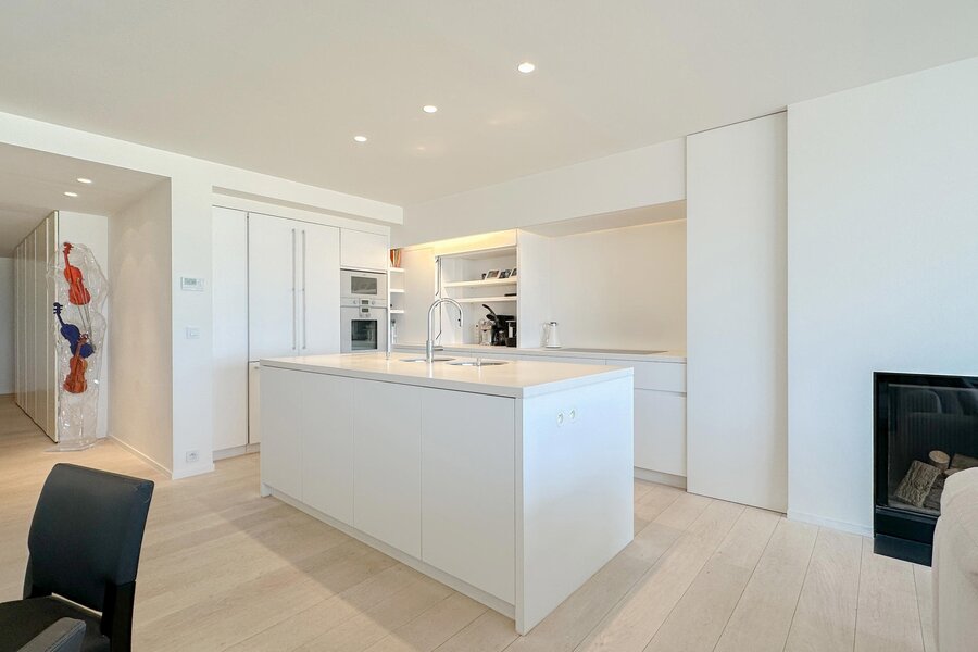 Samenstelling: Inkomhal met gastentoilet en vestiaire. Ruime woonkamer met open haard, en open zicht op zee en over het Rubensplein. Open keuken met keukeneiland en gezellig ontbijthoekje. Eetkamer. Berging voor wasmachine en droogkast.
