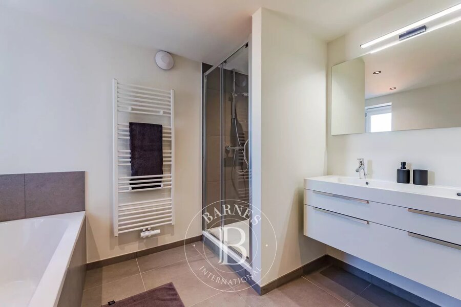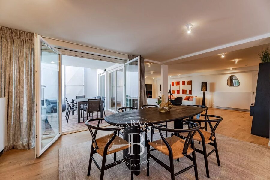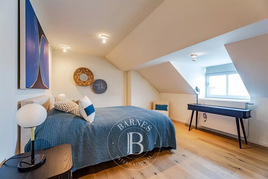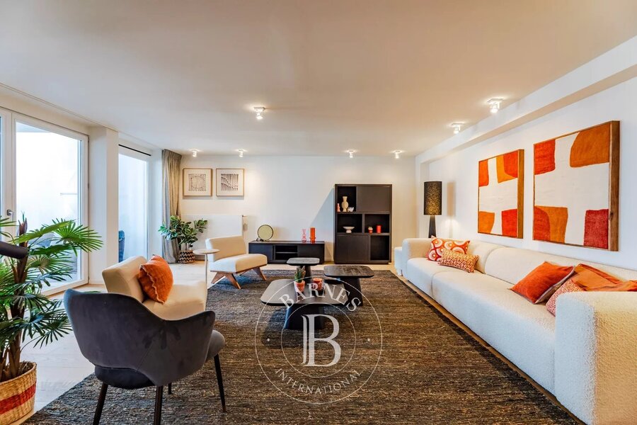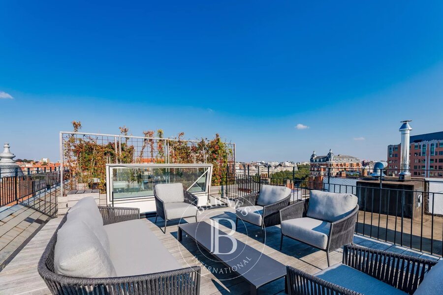 Etterbeek - Jubelpark - Op een steenworp van de Europese instellingen, prachtig nieuw duplex appartement van ongeveer 200 m², gelegen aan de achterzijde van een prachtig gebouw op een rustige locatie, met twee terrassen. Het bestaat uit een inkomhal, gastentoilet en vestiaire, grote woonkamer, volledig uitgeruste open keuken en terras. Boven zijn er drie slaapkamers en drie badkamers, plus een dakterras van 25 m².