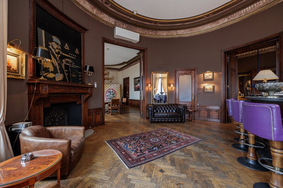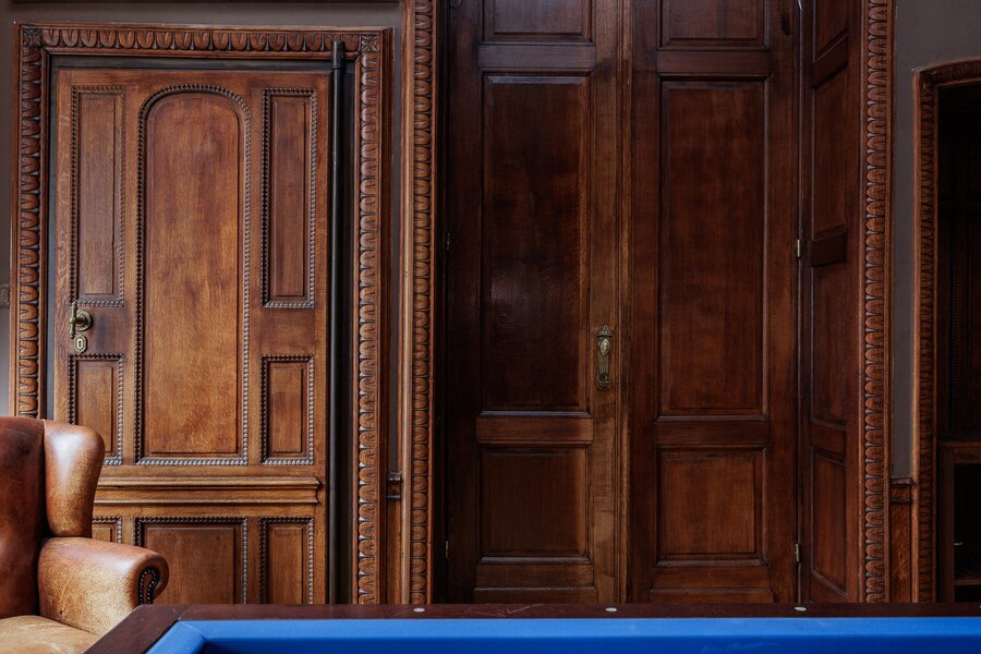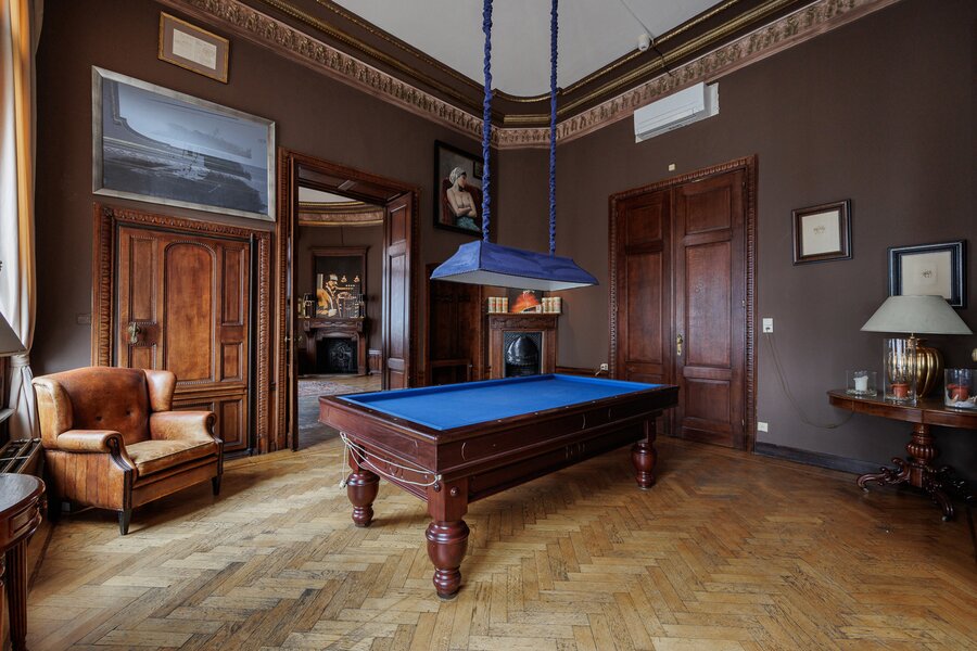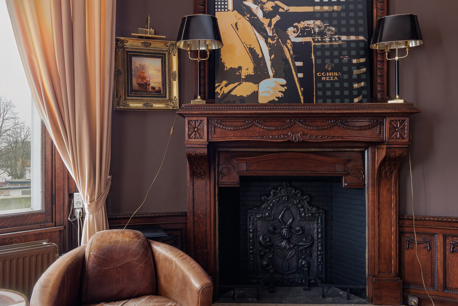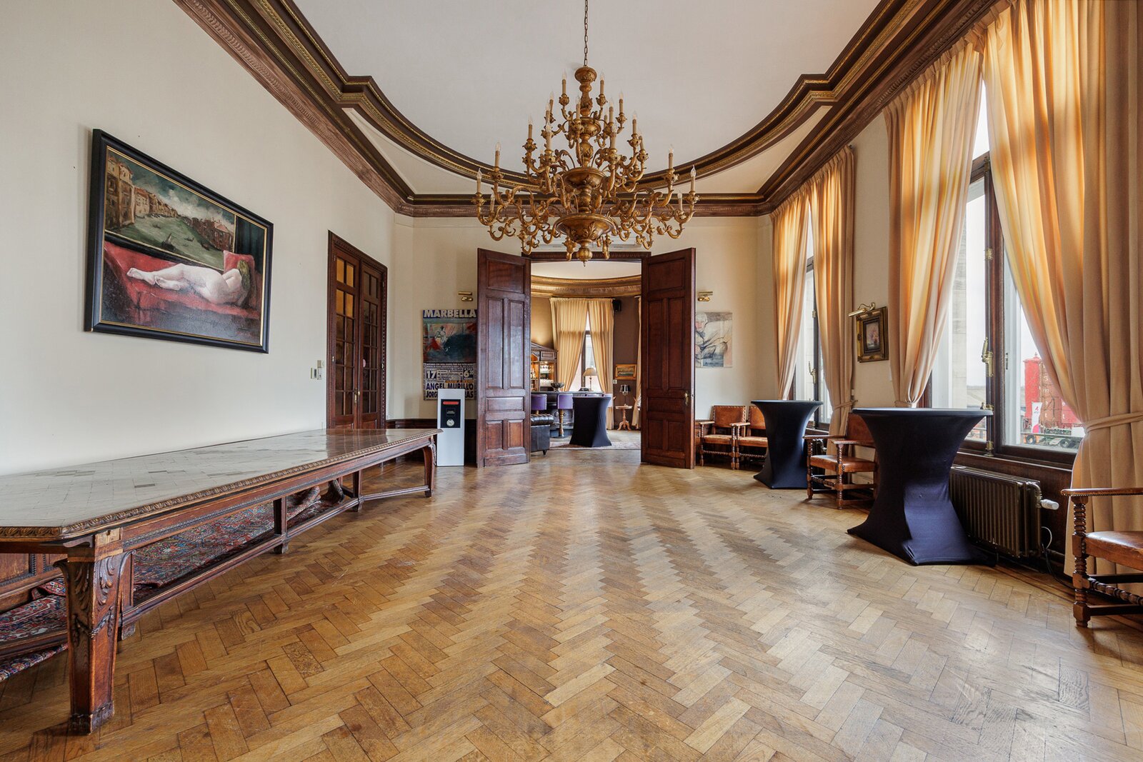 Dubbele openslaande deuren verbinden de ruimten, parketvloeren lopen door, tal van authentieke elementen ademen de geschiedenis en geven een bijzonder karakter aan het pand.