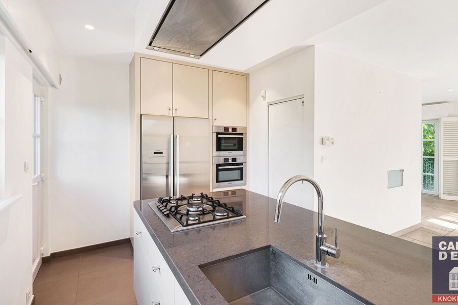 Indeling: inkomhal met vestiaire en gastentoilet, aangename leefruimte aansluitend op de eetkamer en de ingerichte open keuken.