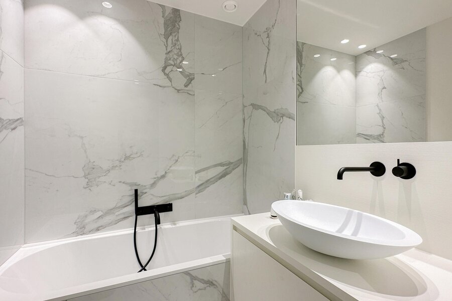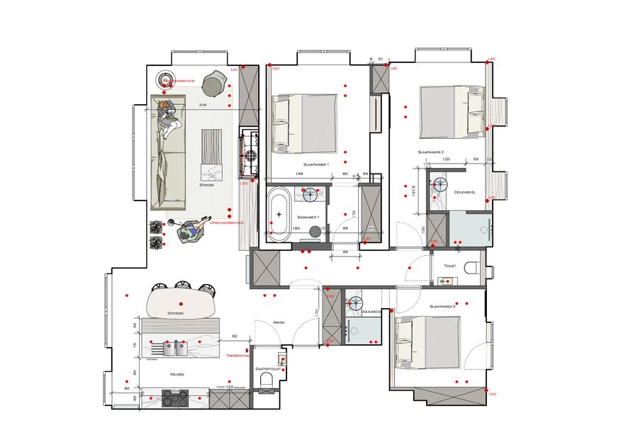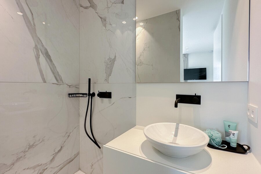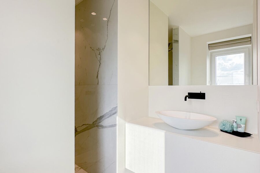 De drie ruime slaapkamers zijn elk voorzien van ingemaakte kasten, een eigen ensuite bad- of douchekamer, en bieden zicht op het omliggende groen en charmante villa’s. Eén slaapkamer beschikt bovendien over een zuidgericht balkon. Een apart nachttoilet maakt het geheel compleet.