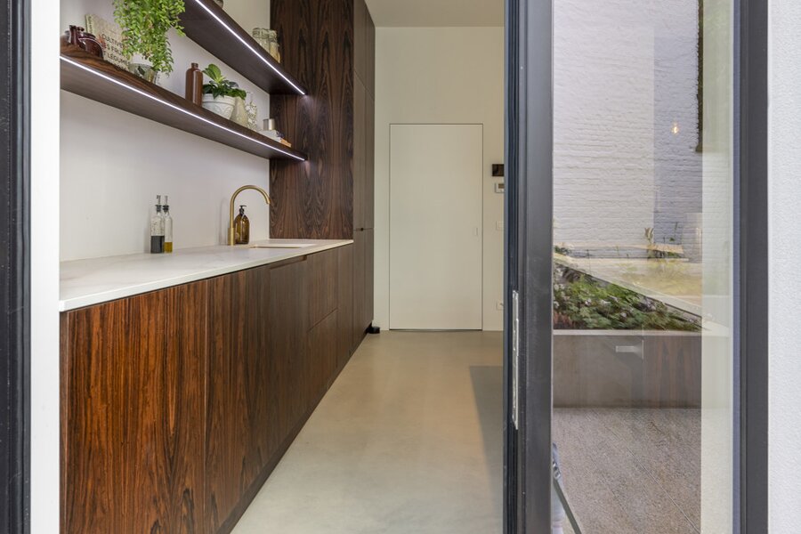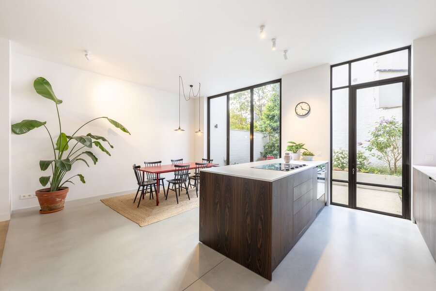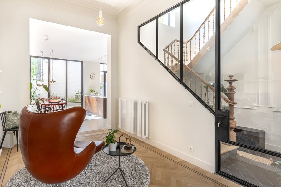Dit pareltje combineert moeiteloos hedendaags wooncomfort met authentieke charme. Het gelijkvloers verwelkomt u met een statige inkomhal en karaktervolle draaitrap, een sfeervolle leefruimte met haard, en een ruime leefkeuken met harmonicaramen die uitgeven op de zuidgerichte stadstuin — ideaal om buiten te genieten in alle rust.