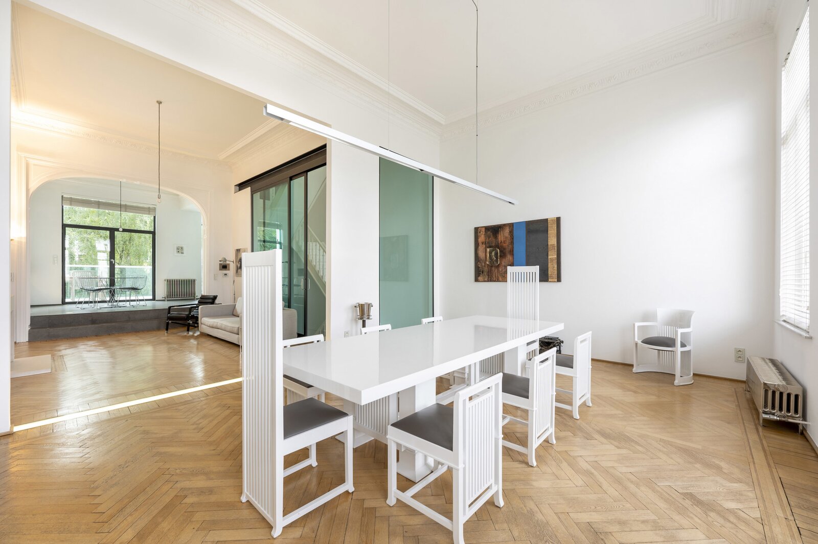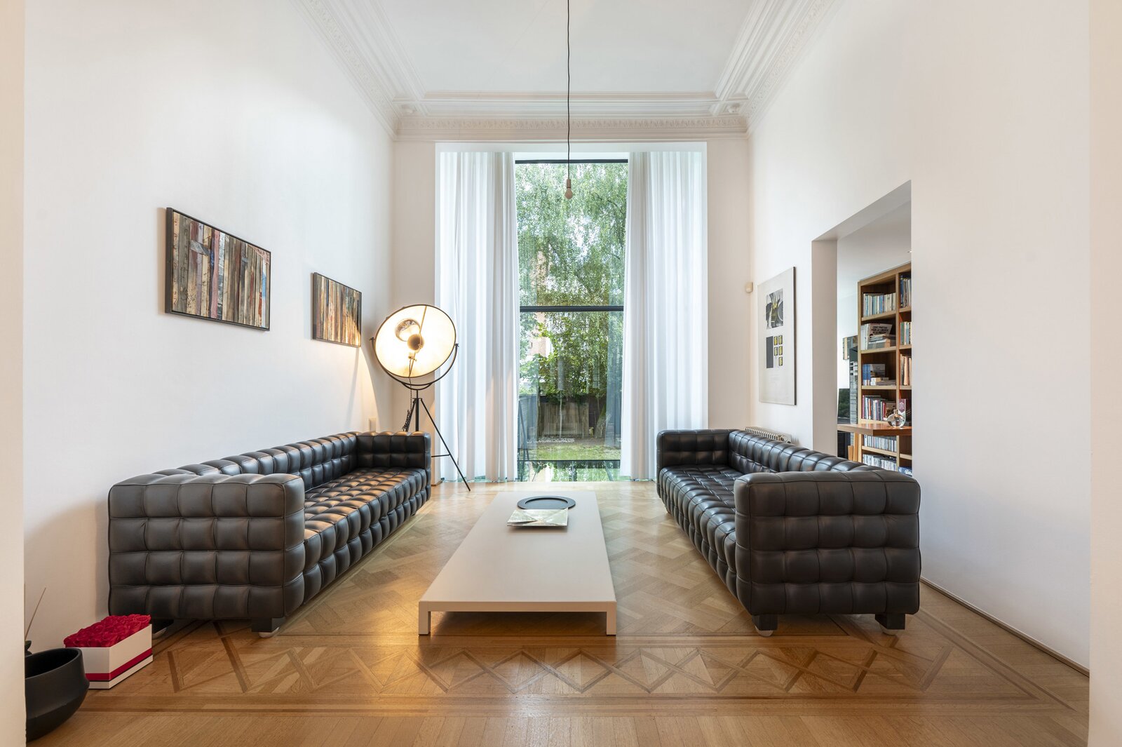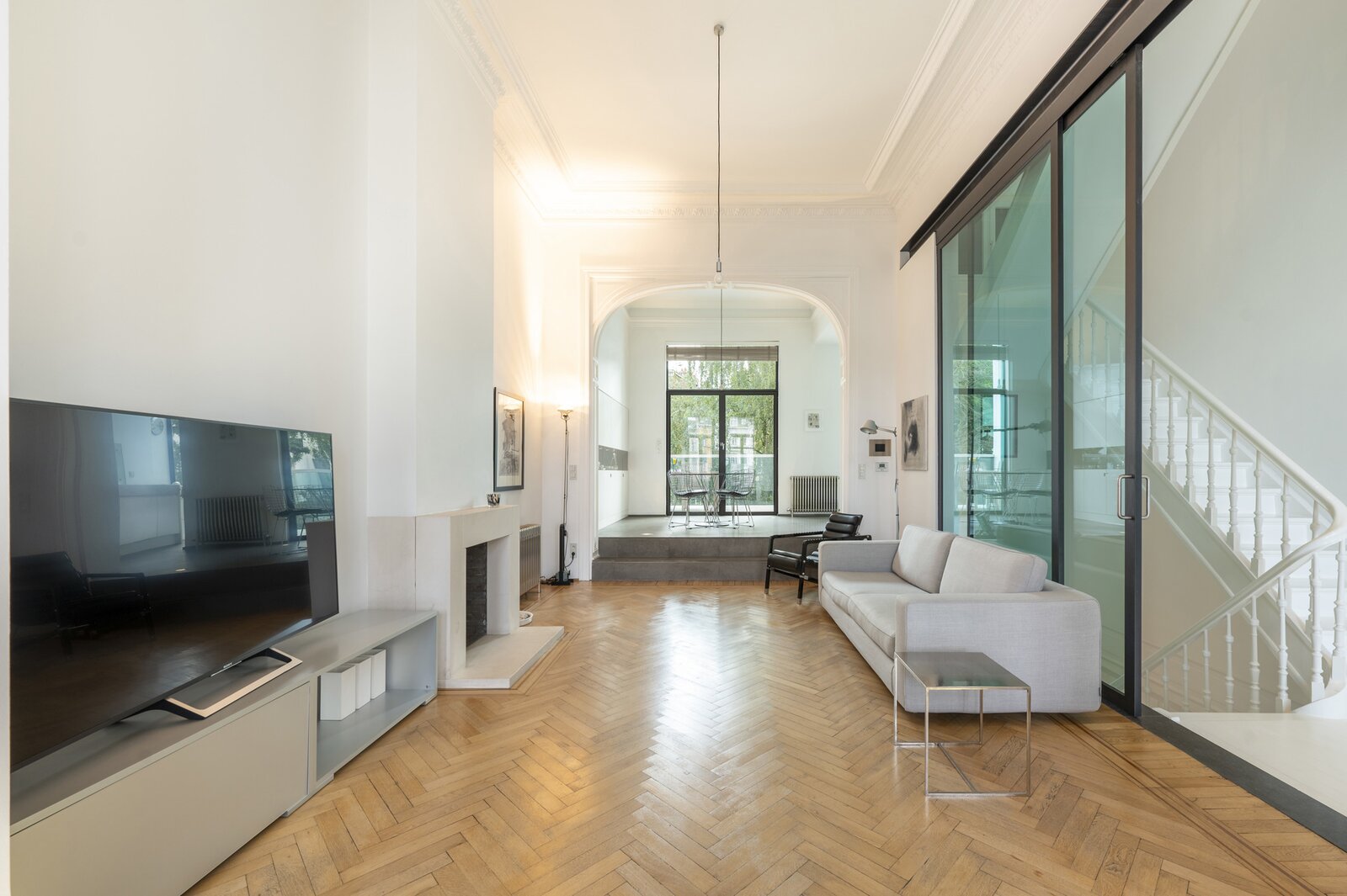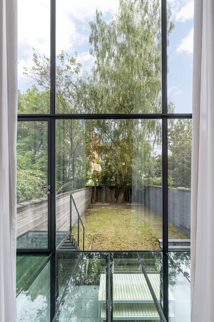 Op het gelijkvloers lopen momenteel 3 open ruimtes in mekaar over, met prachtige parkvloer, hoge plafonds en veel licht en authenticiteit. De glazen achtervel laat de woning overvloeien in de tuin.
