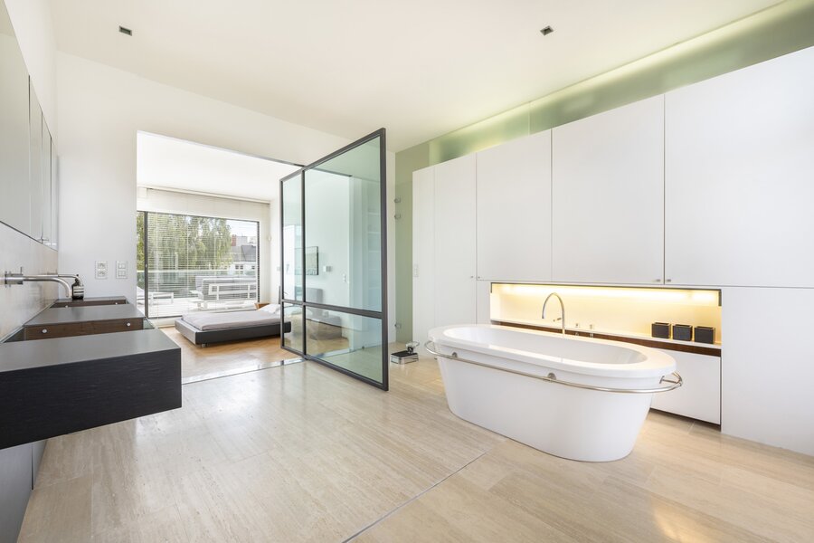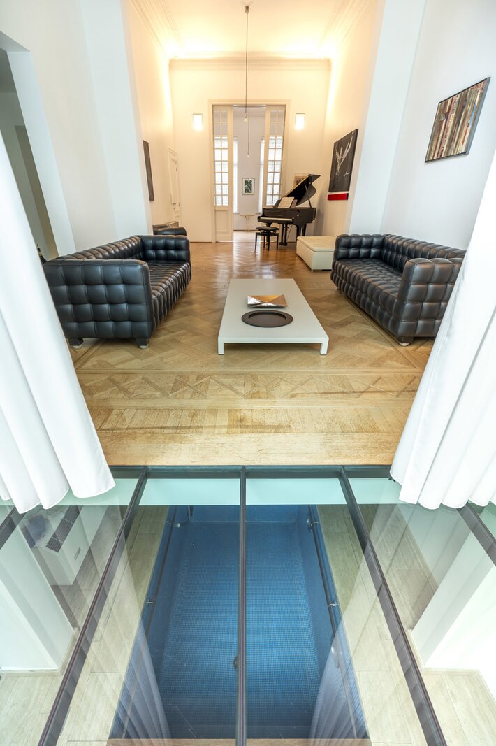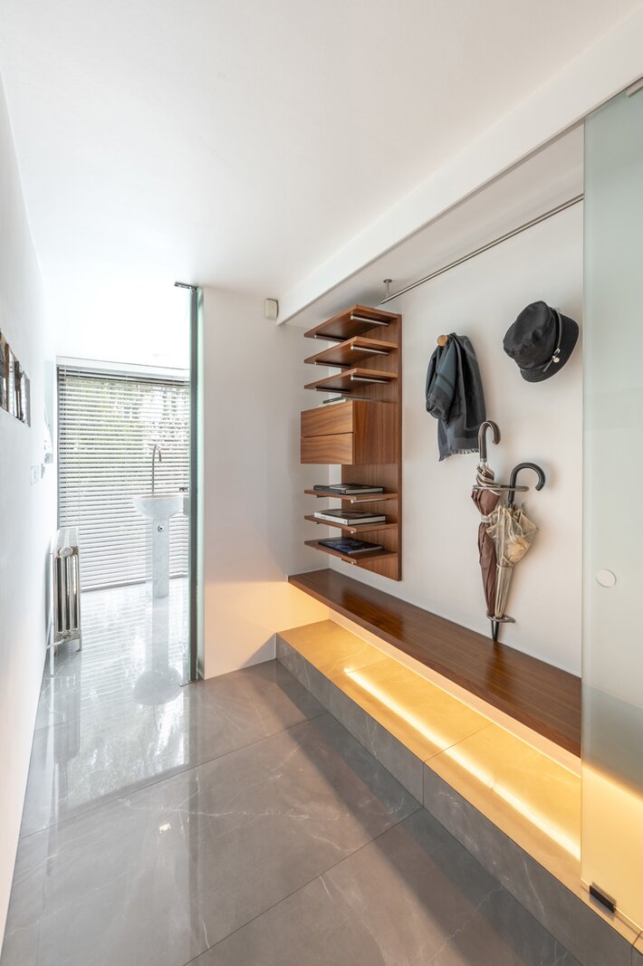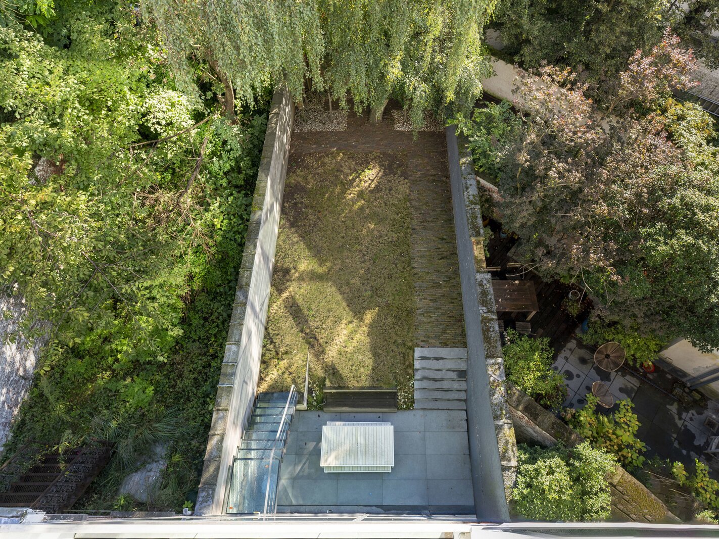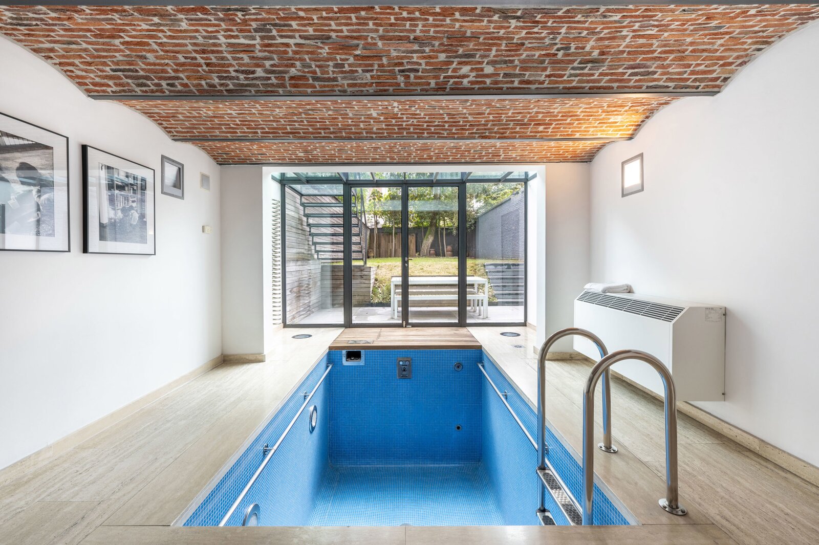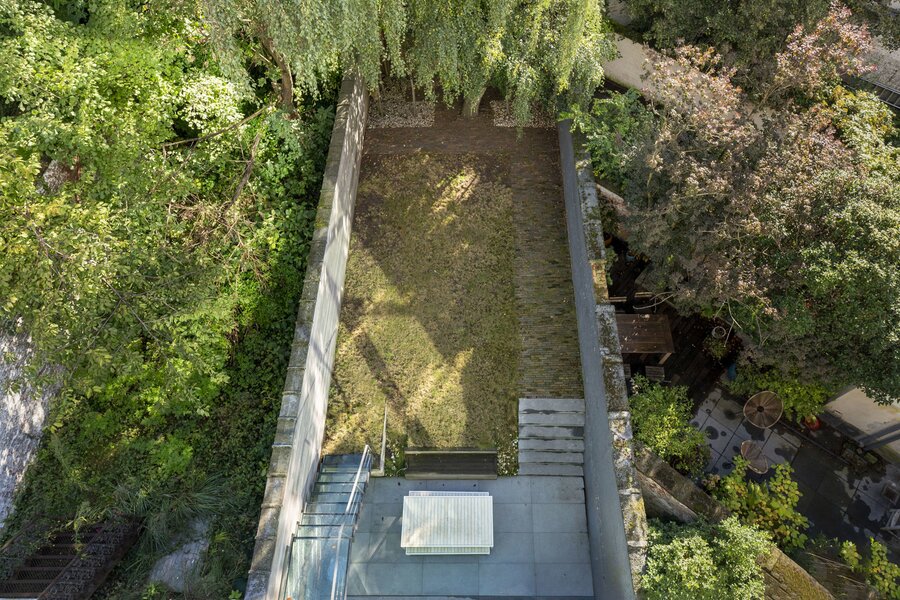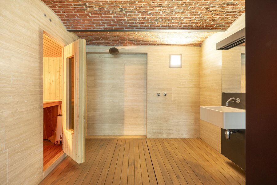 Het souterrain is ingericht als logeerkamer met douchekamer en achteraan zeer aangenaam zicht op de tuin, voorts een wellness met sauna en zwembad.