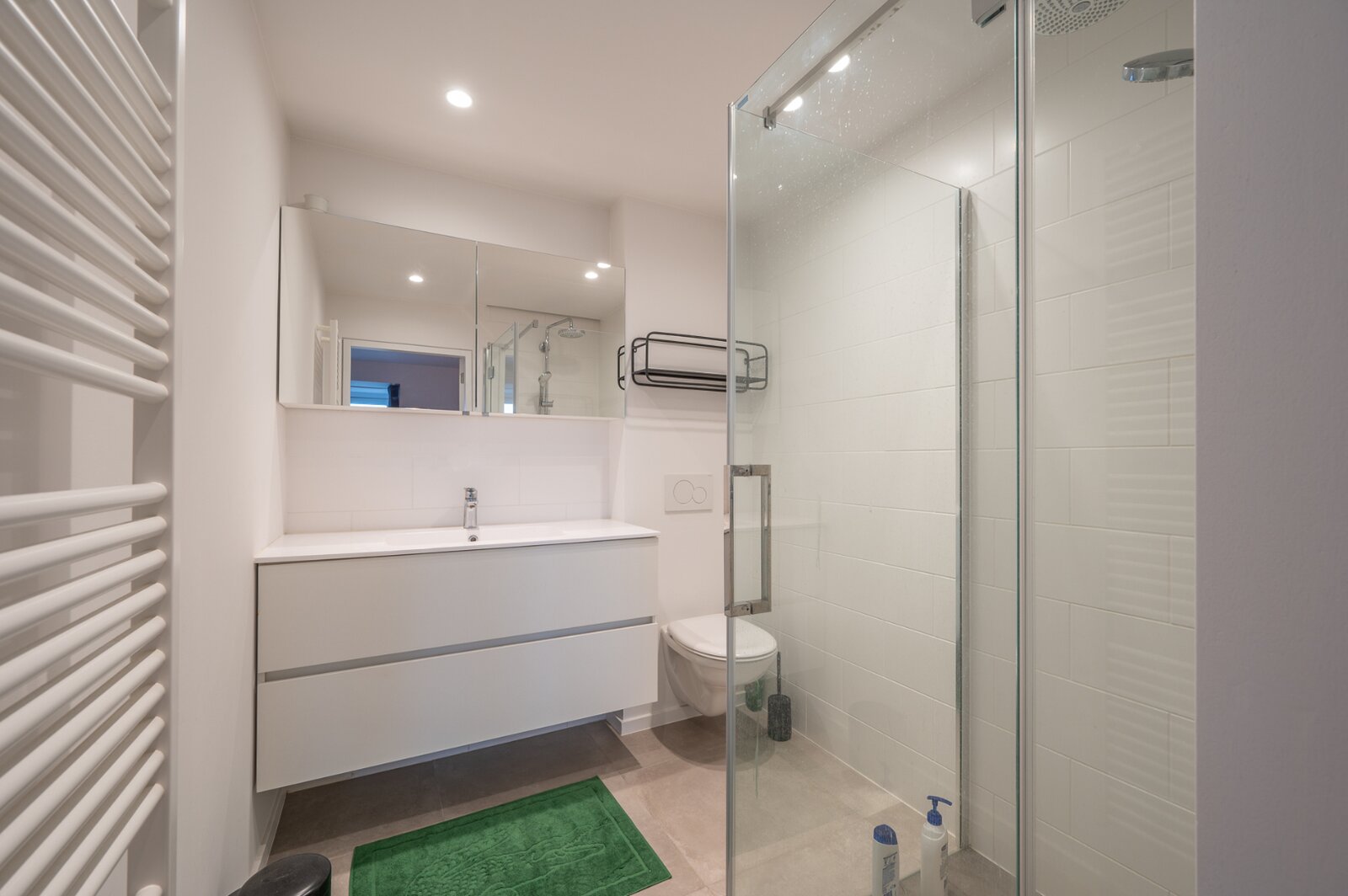 Ruime inkomhal met gastentoilet en vestiaire. Lichtrijke woon- en eetkamer met open, volledig geïnstalleerde keuken voorzien van alle moderne apparatuur. Praktische berging/wasplaats met aansluiting voor was- en droogmachine. Eerste slaapkamer met ingemaakte kasten. Ruime douchekamer. Tweede slaapkamer, eveneens met ingemaakte kasten. Tweede badkamer met inloopdouche.