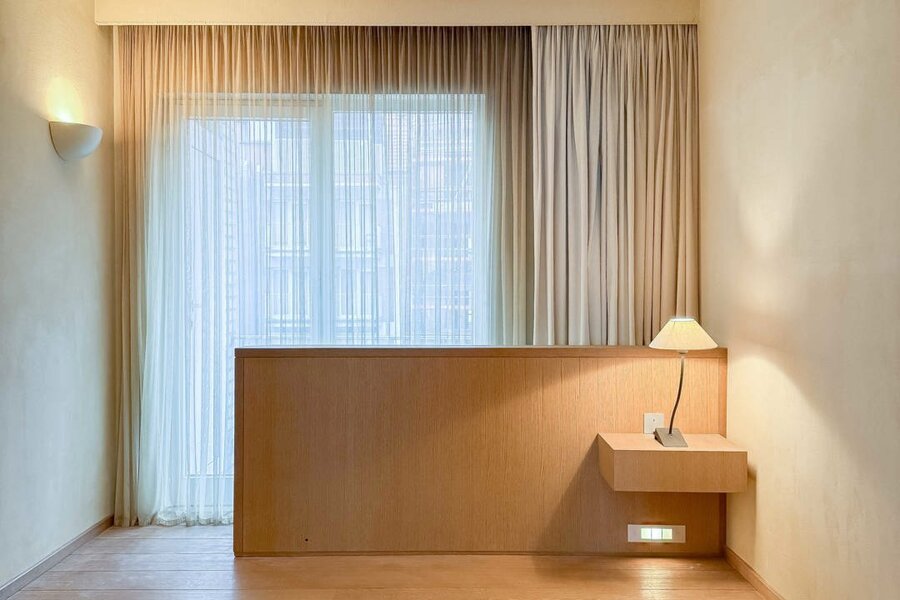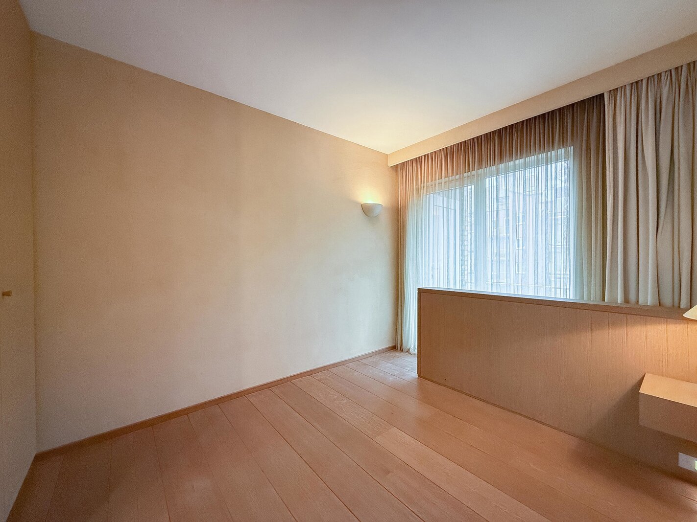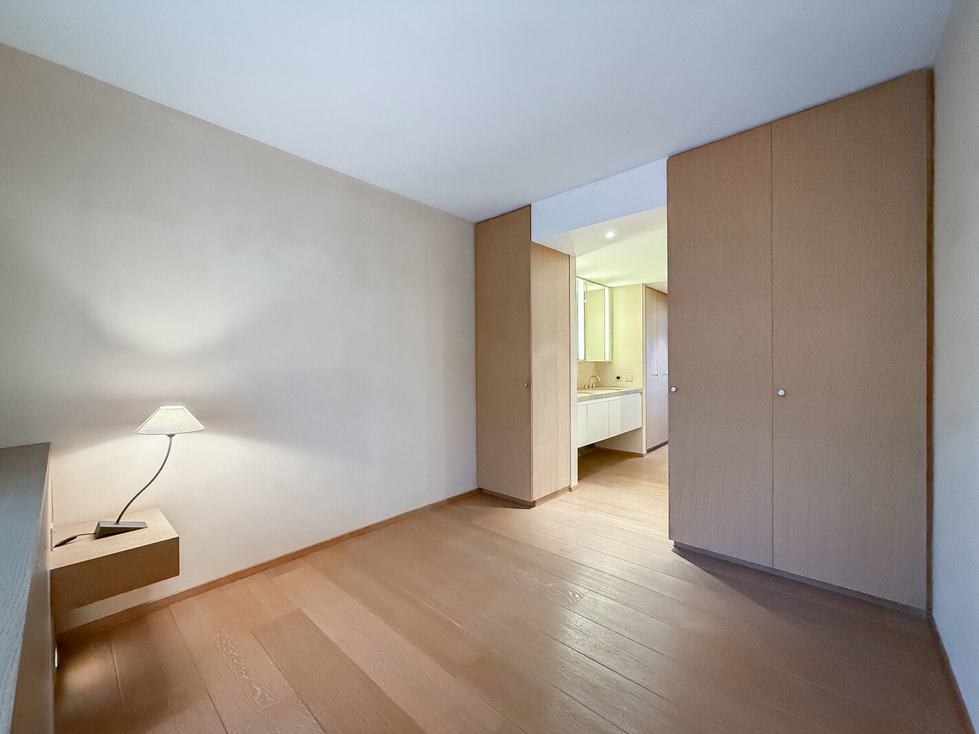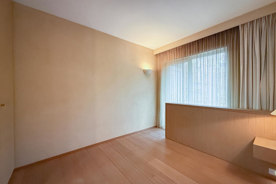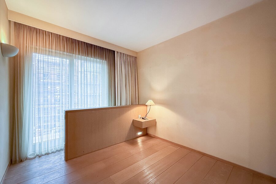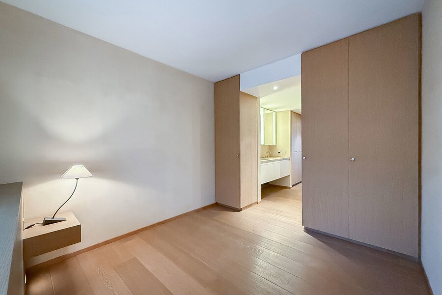 Achteraan bevindt zich een lichtrijke, volwaardige slaapkamer met ingemaakte kasten en toegang tot een zonnig, zuidgericht terras, een perfecte plek om in alle rust te ontspannen. De luxueus ingerichte badkamer, uitgevoerd in natuursteen, is uitgerust met een dubbele lavabo en een ruime inloopdouche.