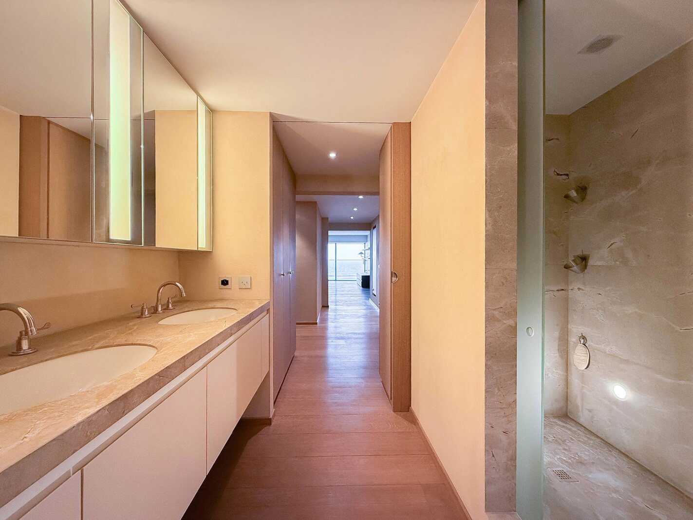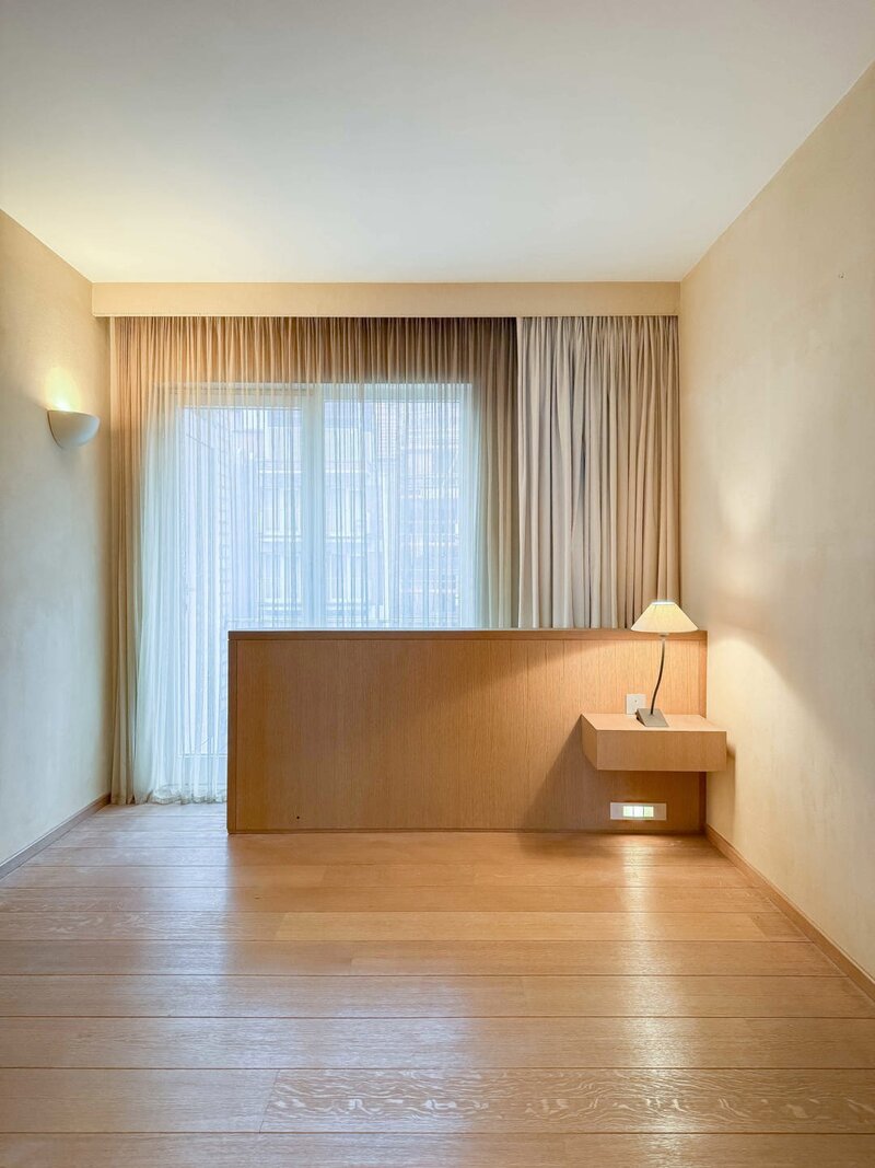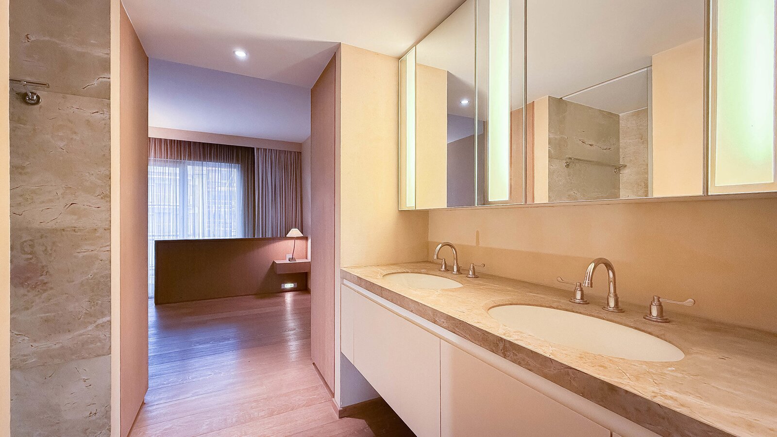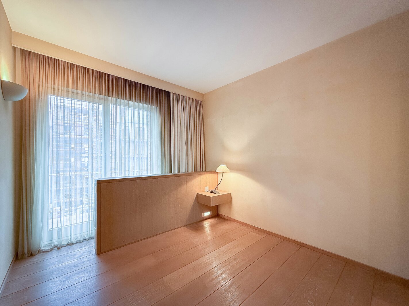 Achteraan bevindt zich een lichtrijke, volwaardige slaapkamer met ingemaakte kasten en toegang tot een zonnig, zuidgericht terras, een perfecte plek om in alle rust te ontspannen. De luxueus ingerichte badkamer, uitgevoerd in natuursteen, is uitgerust met een dubbele lavabo en een ruime inloopdouche.