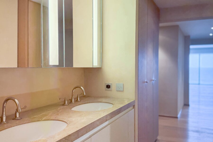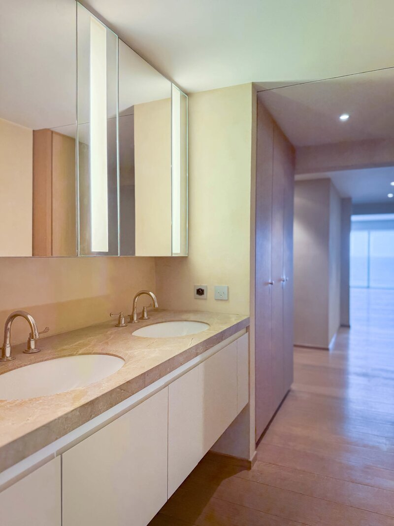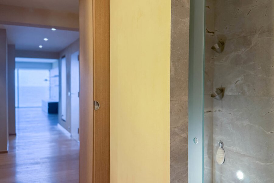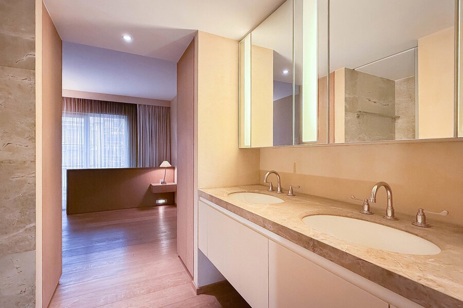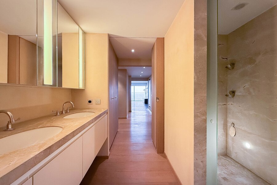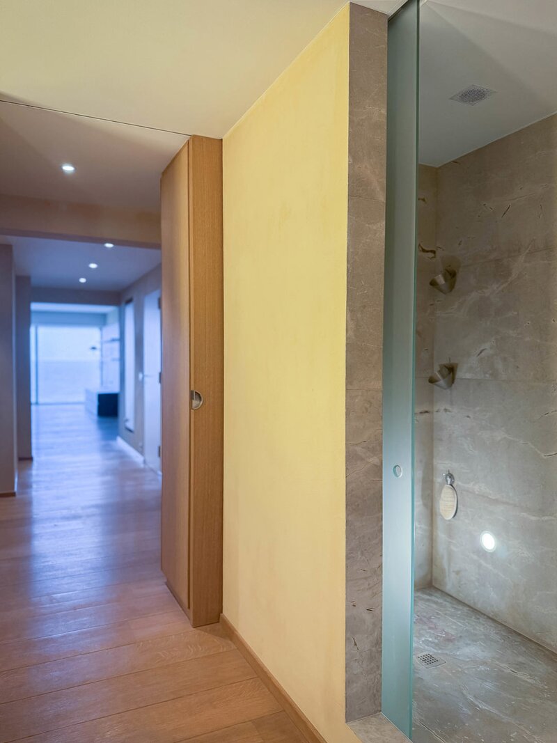 Achteraan bevindt zich een lichtrijke, volwaardige slaapkamer met ingemaakte kasten en toegang tot een zonnig, zuidgericht terras, een perfecte plek om in alle rust te ontspannen. De luxueus ingerichte badkamer, uitgevoerd in natuursteen, is uitgerust met een dubbele lavabo en een ruime inloopdouche.