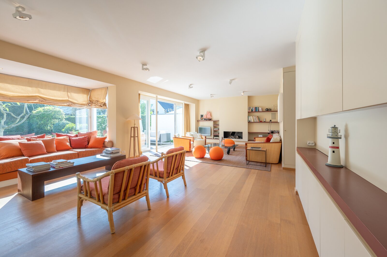 Ruime inkomhal, voorzien van een gastentoilet en een praktische vestiaire. Lichtrijke leefruimte met gezellige zithoek. Ruime eetkamer met volledig geïnstalleerde keuken. Vanuit de woonkamer heeft u directe toegang tot de zuidwestelijk georiënteerde tuin met charmant terras.