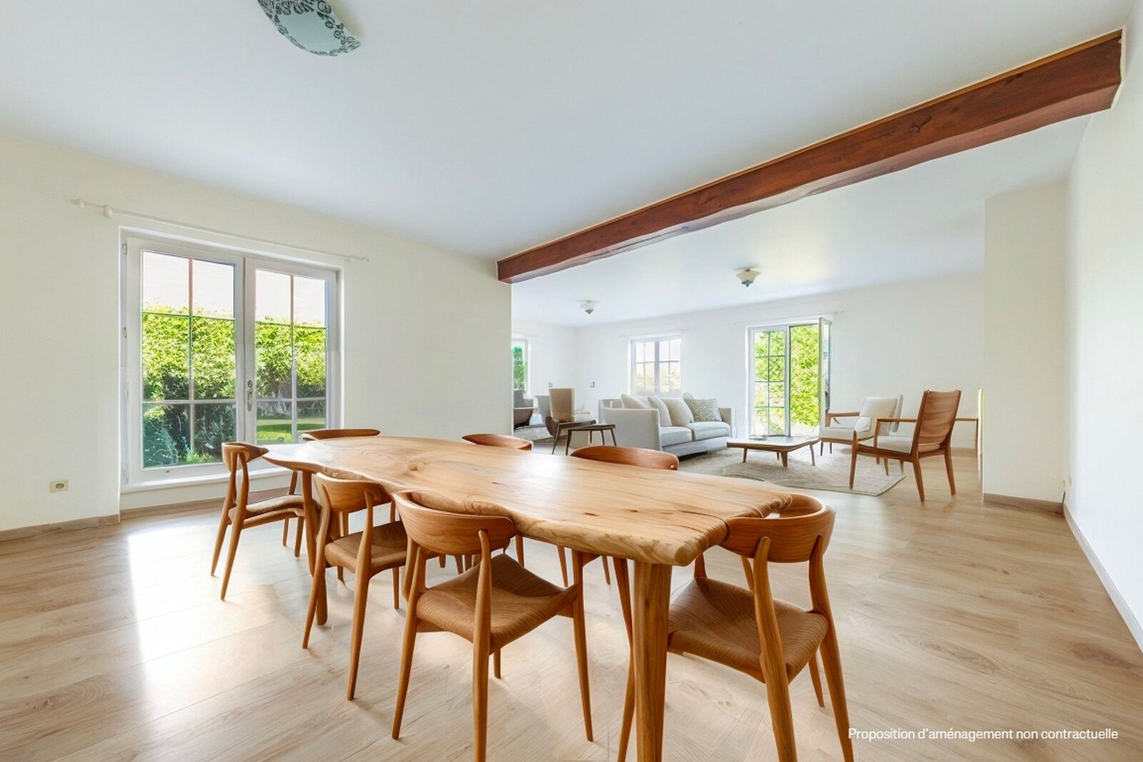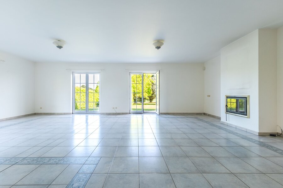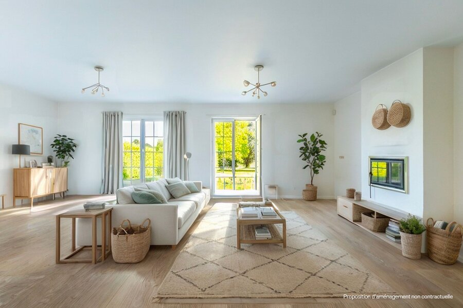 Villa gebouwd in 1994 op een perceel van 15 are, met een totale oppervlakte van 350 m², waarvan circa 285 m² bewoonbaar. De gelijkvloerse verdieping omvat een inkomhal met vestiaire en gastentoilet, een volledig vernieuwde keuken uit 2022, en een lichtrijke leefruimte van 65 m² met open haard. Twee terrassen sluiten aan op de woonruimte en geven uit op een beboste tuin, georiënteerd op het noordwesten.
