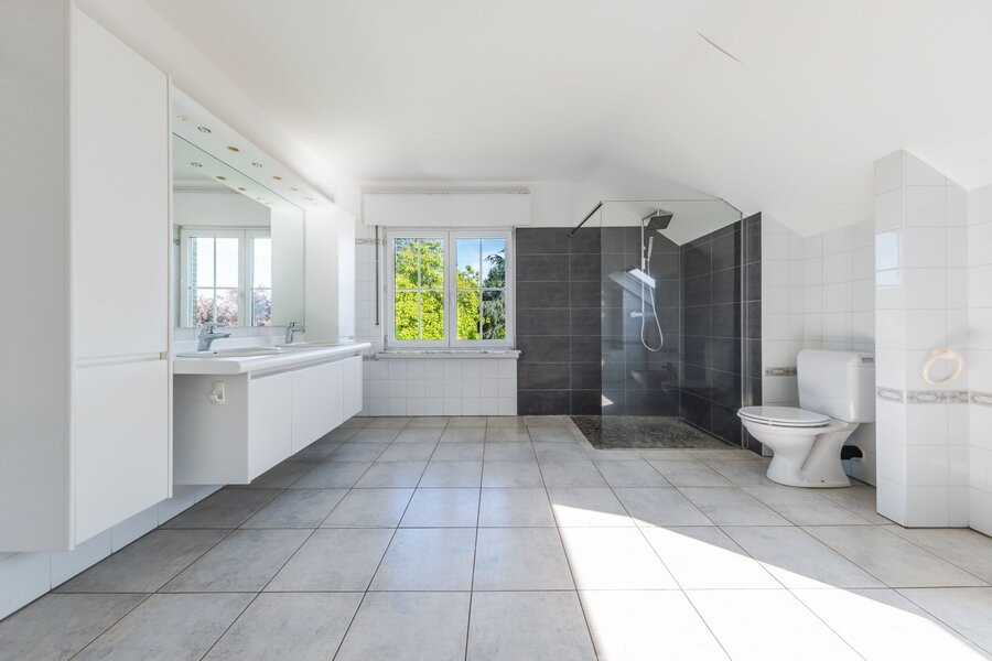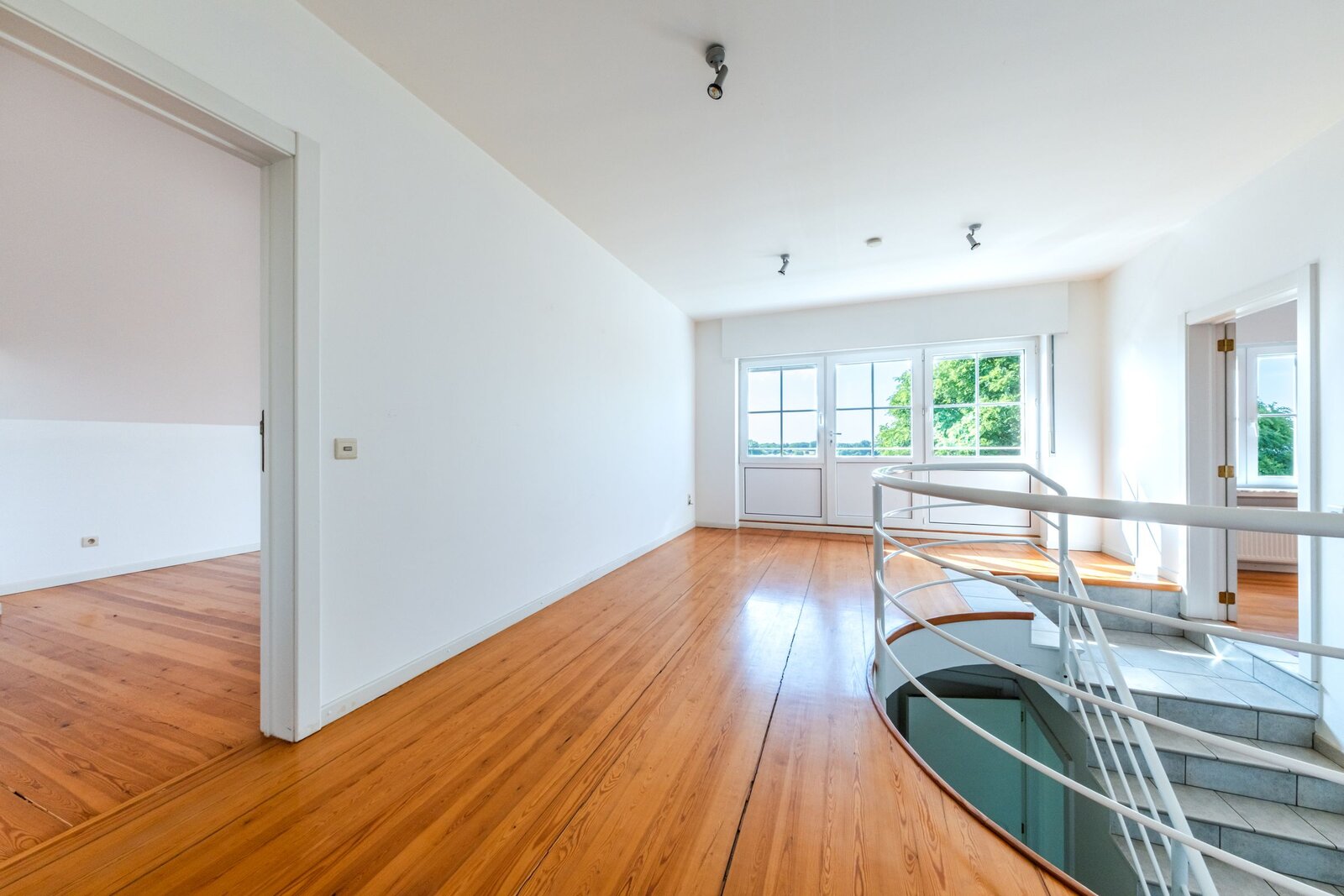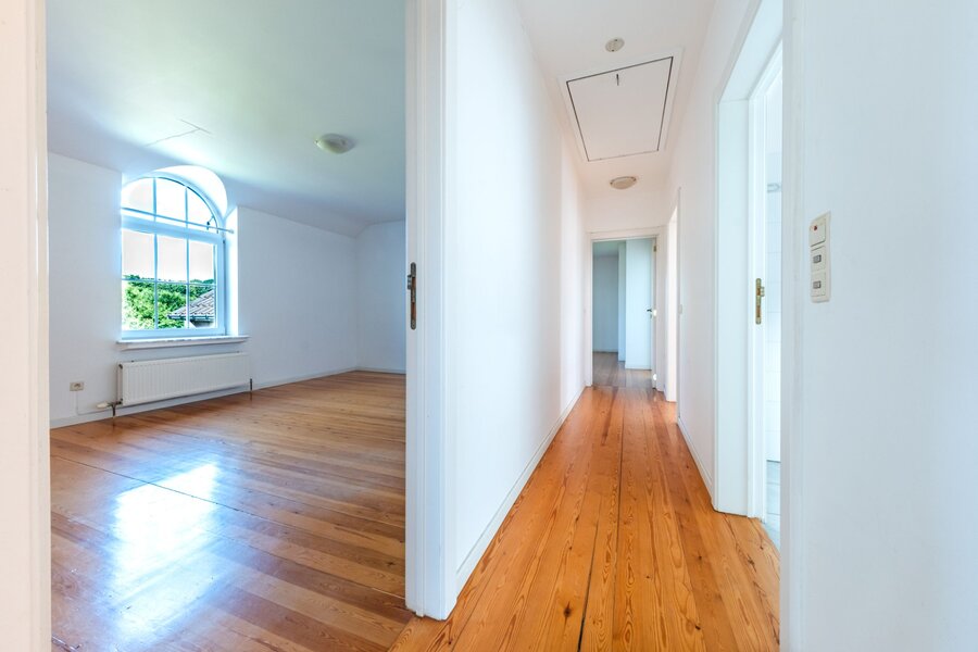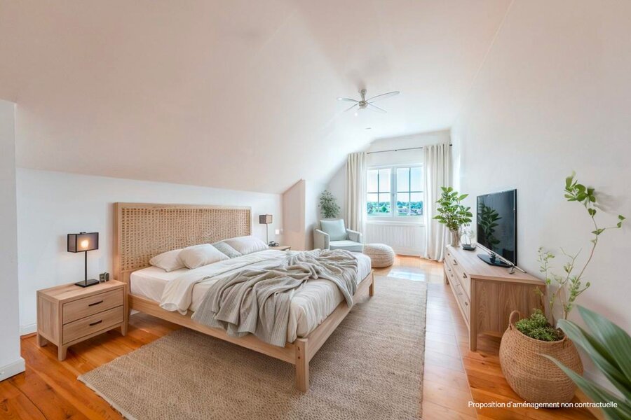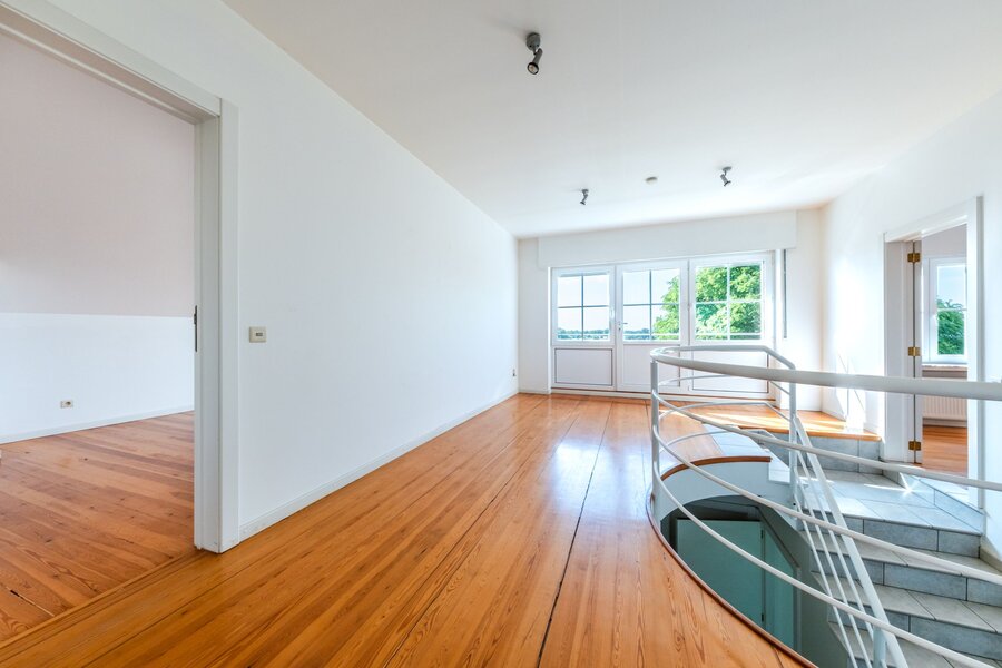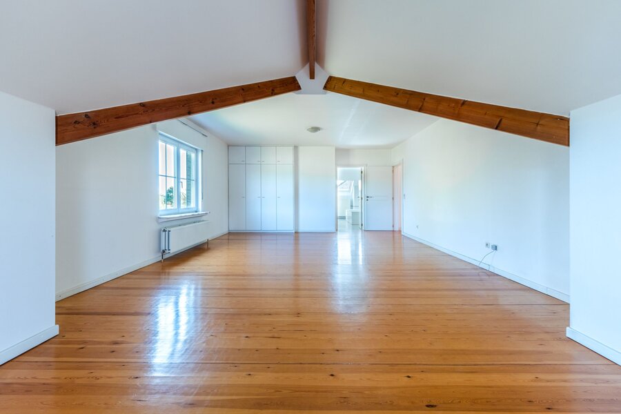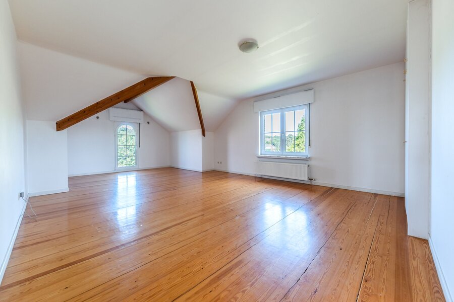 Op de eerste verdieping bevinden zich drie ruime slaapkamers (20, 20 en 21 m²), een ouderlijke suite van 40 m² met en-suite badkamer, een bureau (mogelijk een vijfde slaapkamer) en een tweede badkamer. De zolder is inrichtbaar.