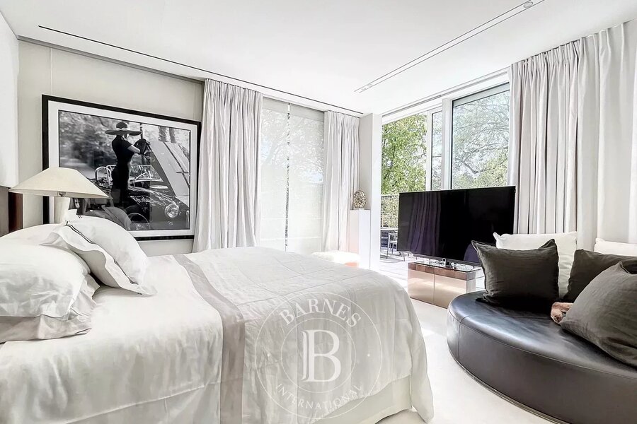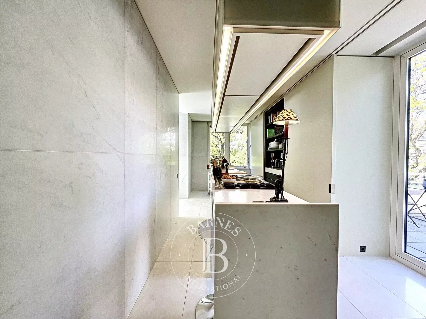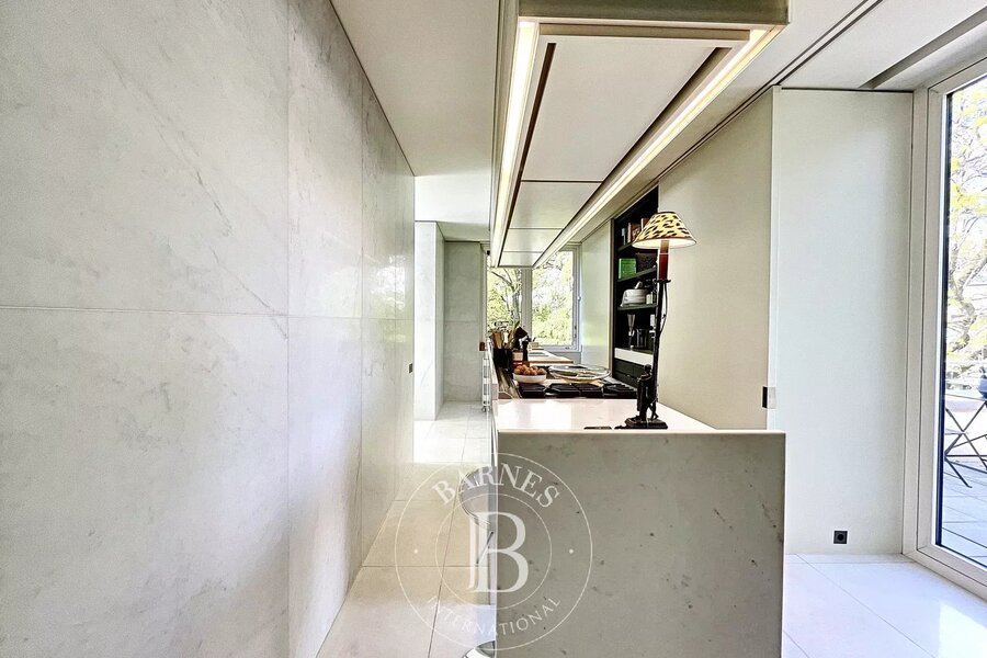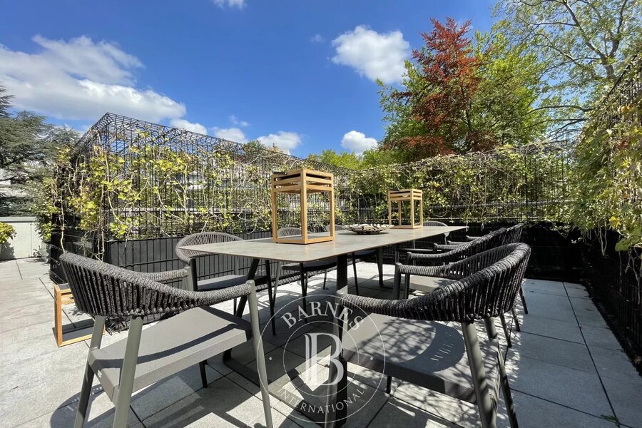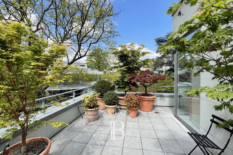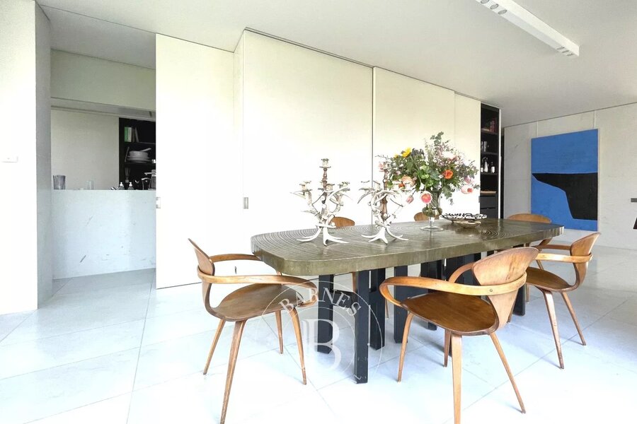 Gelegen op de bovenste verdieping van de 3, is het als volgt samengesteld: eetkamer en woonkamer met toegang tot het 150m2 terras op het zuiden gericht en volledig rondom het appartement, aparte ingerichte keuken, hoofdslaapkamer met dressing en marmeren badkamer, kantoor of tweede slaapkamer en een wasruimte. Een kelder maakt deel uit van de verkoop. Drie garageboxen in supplement.