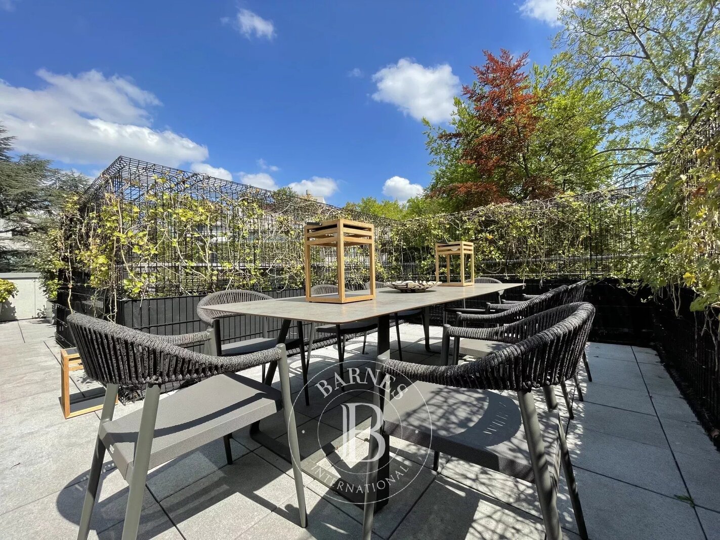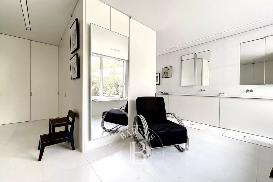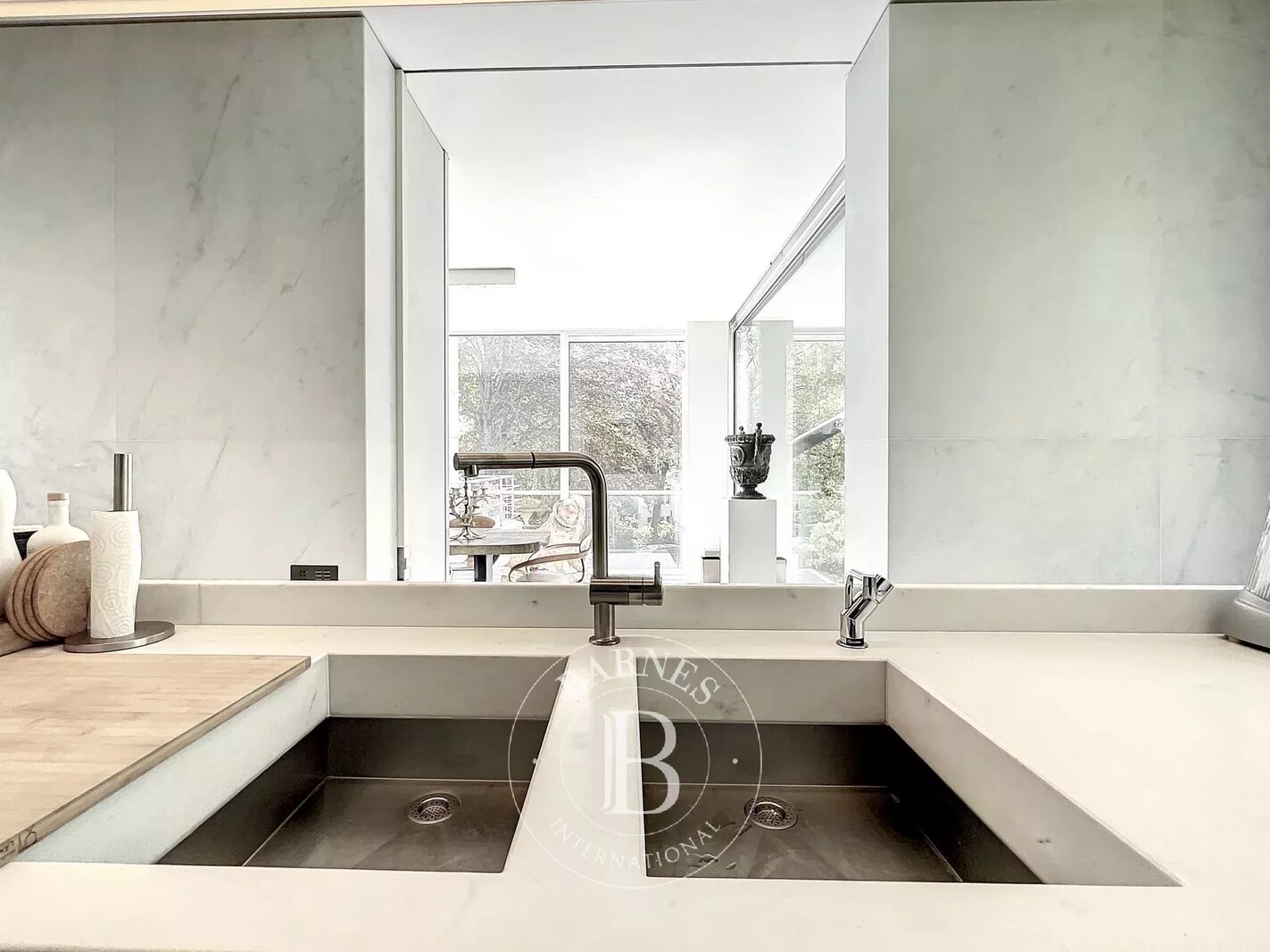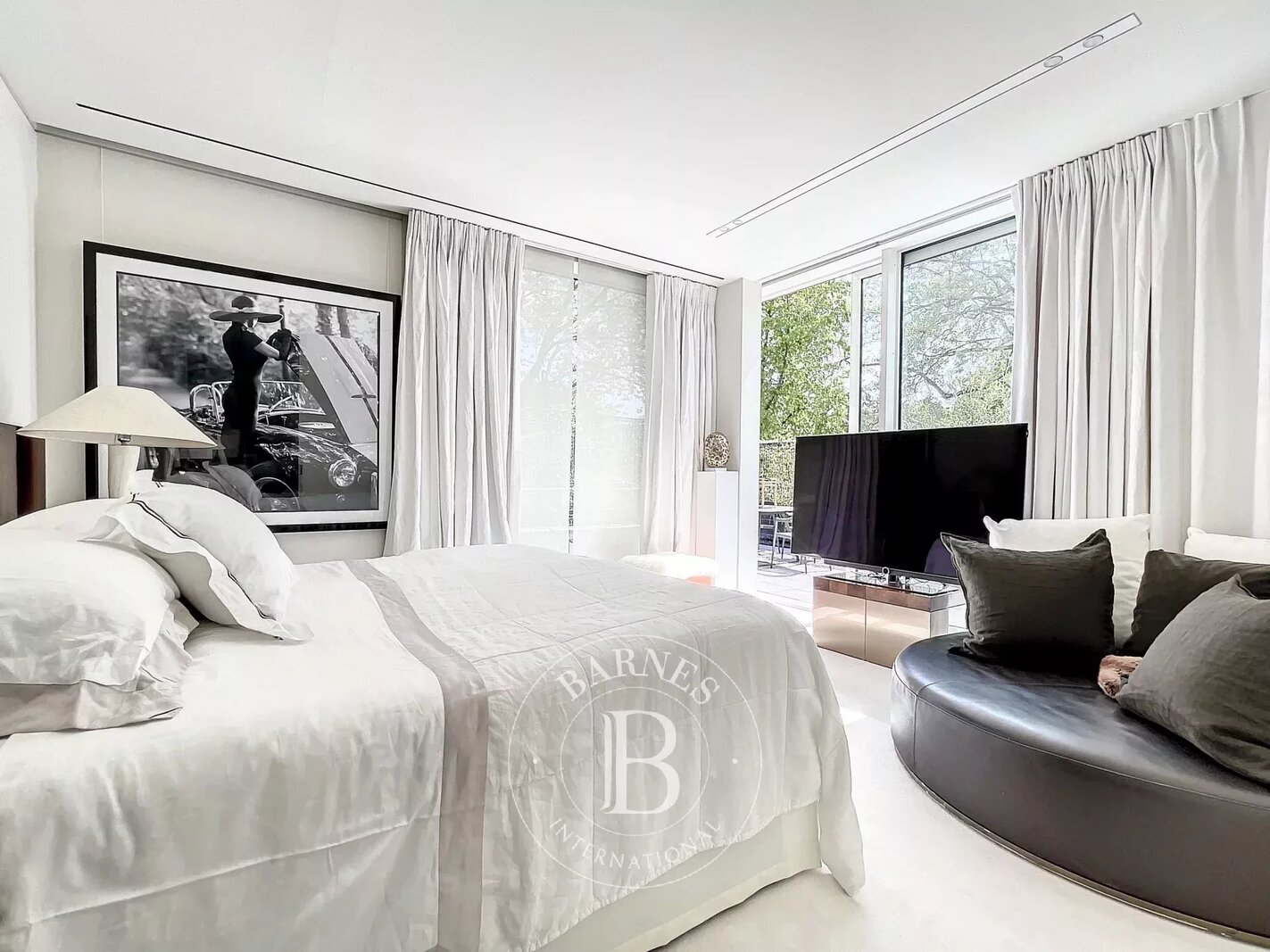 Gelegen op de bovenste verdieping van de 3, is het als volgt samengesteld: eetkamer en woonkamer met toegang tot het 150m2 terras op het zuiden gericht en volledig rondom het appartement, aparte ingerichte keuken, hoofdslaapkamer met dressing en marmeren badkamer, kantoor of tweede slaapkamer en een wasruimte. Een kelder maakt deel uit van de verkoop. Drie garageboxen in supplement.