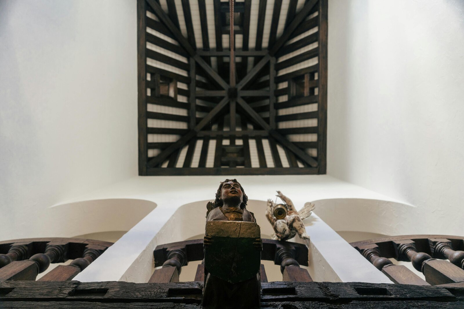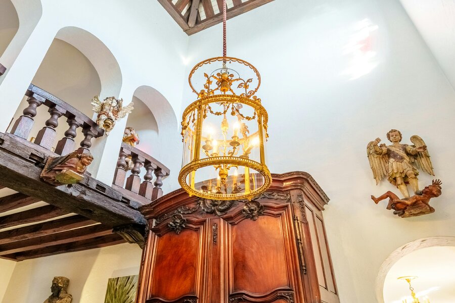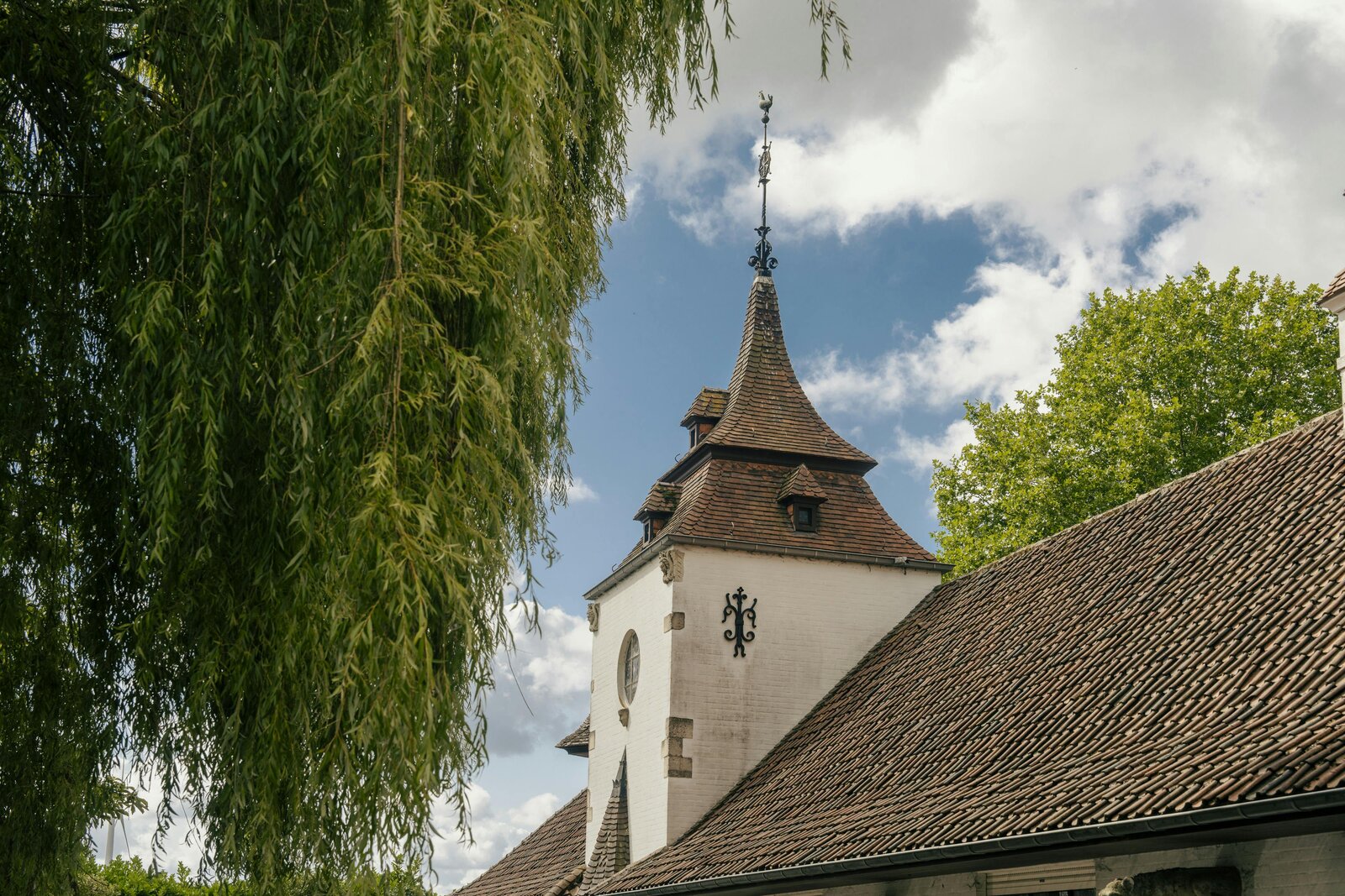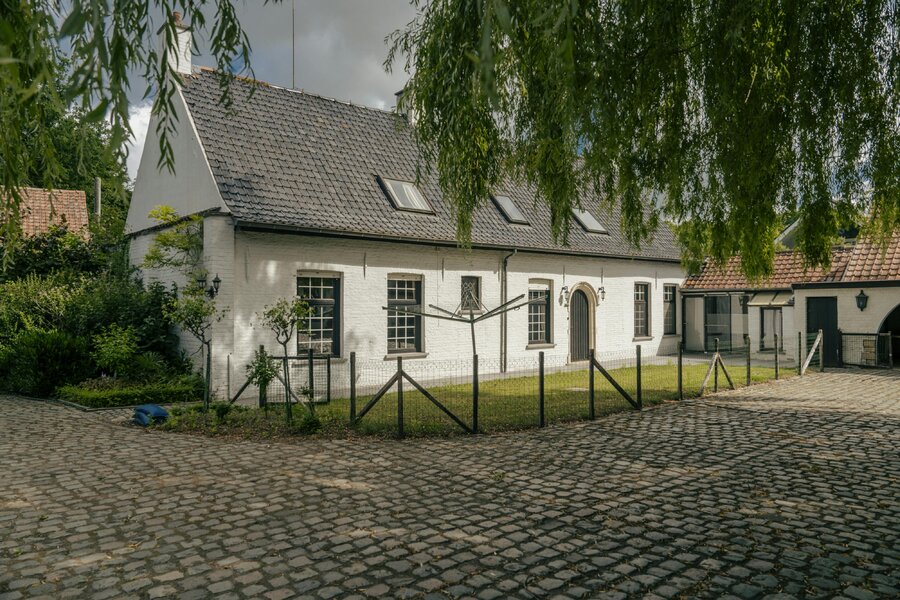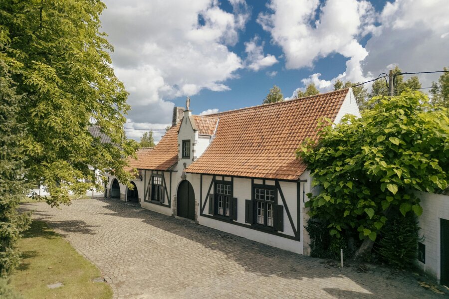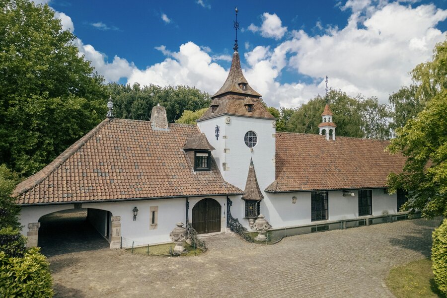 witte gevels, sierlijke dakruiters, boogvormige doorgangen, smeedijzeren ornamenten, een massieve houten inkomdeur en karaktervolle loodglasramen zorgen voor een authentieke uitstraling met grandeur. De centrale toren fungeert als architecturale blikvanger.