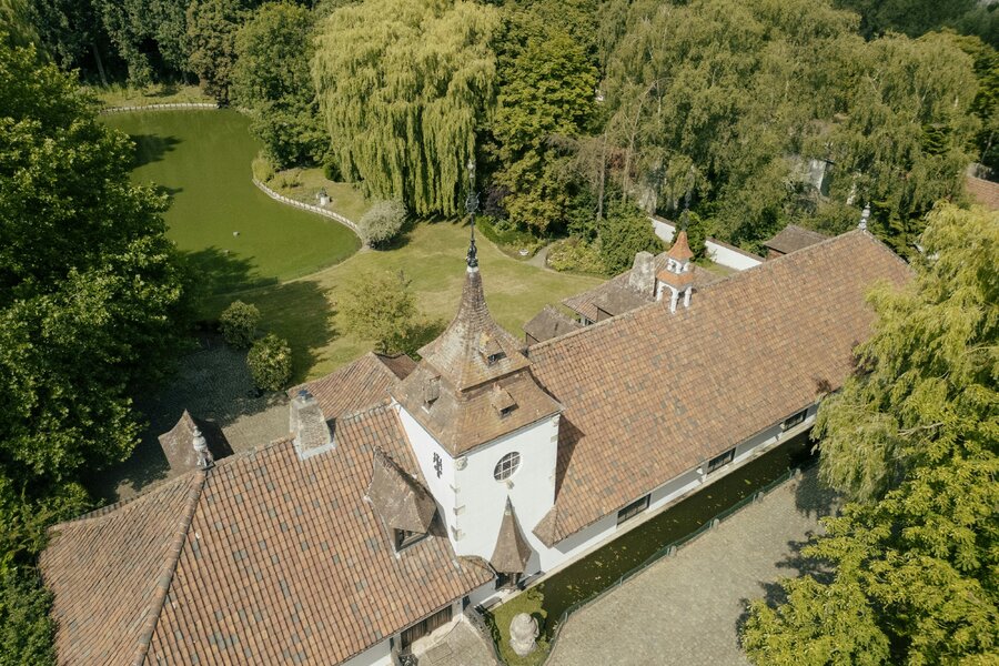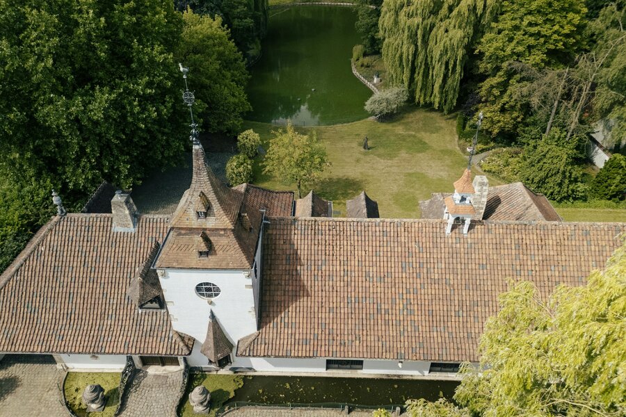 De leefruimtes kijken uit op de grote vijver en het omliggende parkdomein, wat zorgt voor een permanent vakantiegevoel. De binnenkoer, omsloten door de gebouwen, tuinmuur en toegangspoort, biedt absolute privacy en een bijzondere sfeervolle beleving.