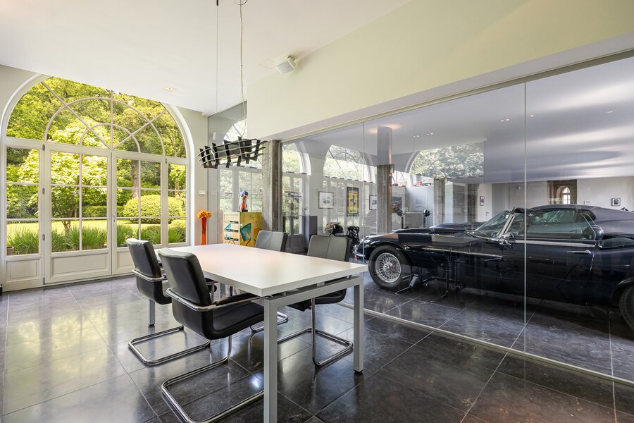 Polyvalente ruimte, momenteel ingericht als bureel (met afzonderlijke inkom) met zicht op oldtimerstalling (met plaats voor 4 oldtimers naast elkaar).