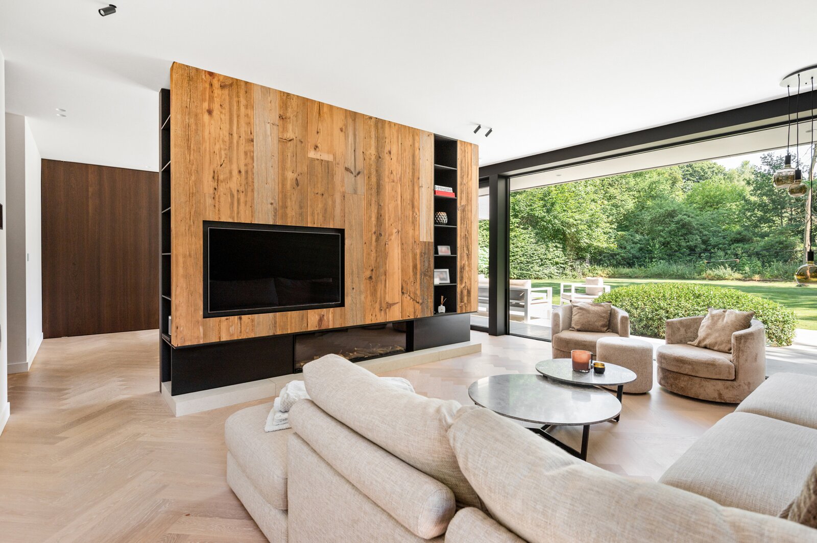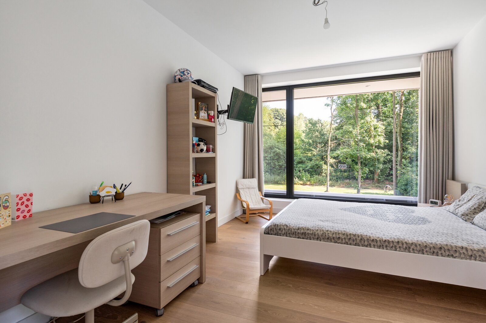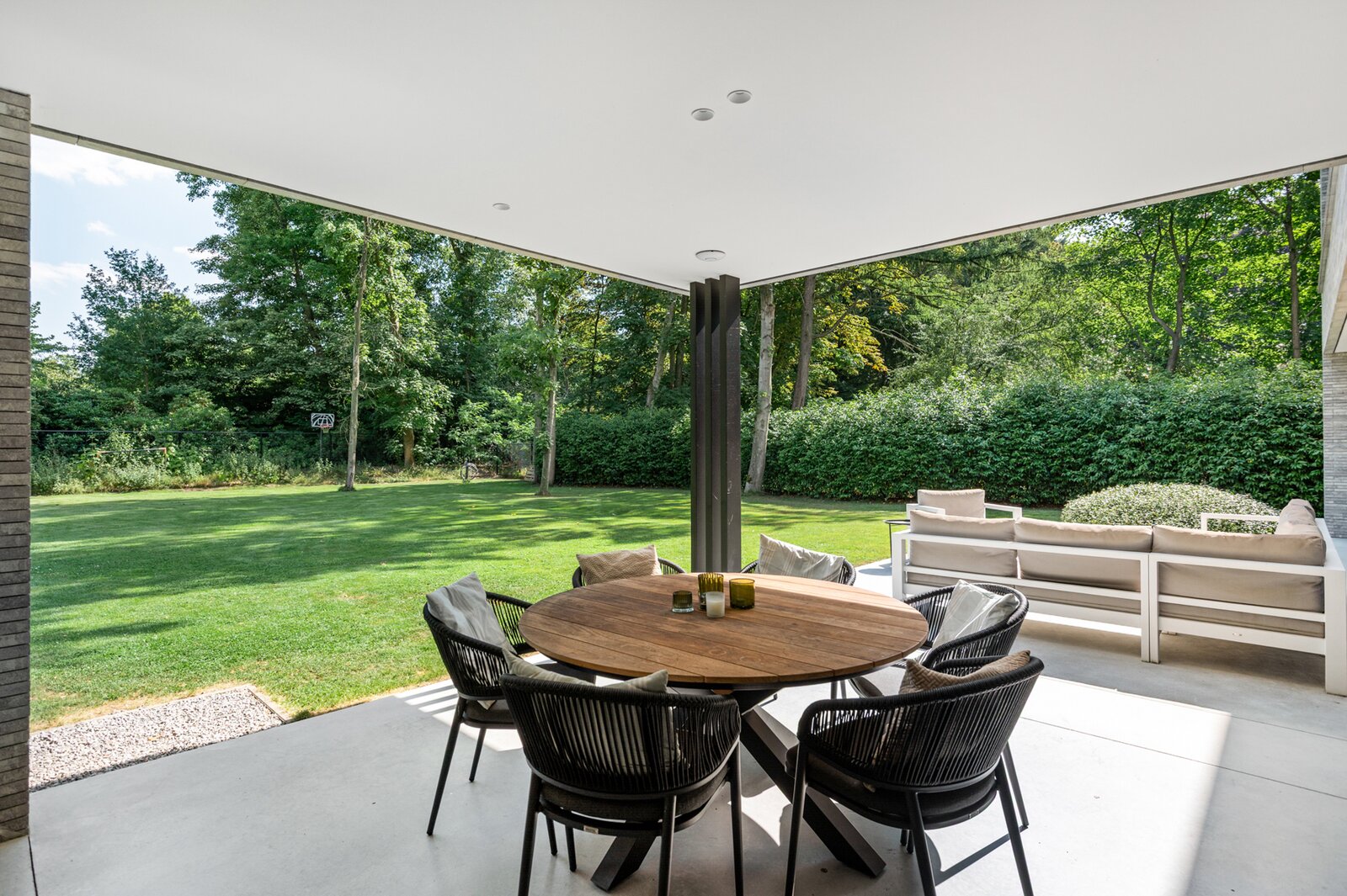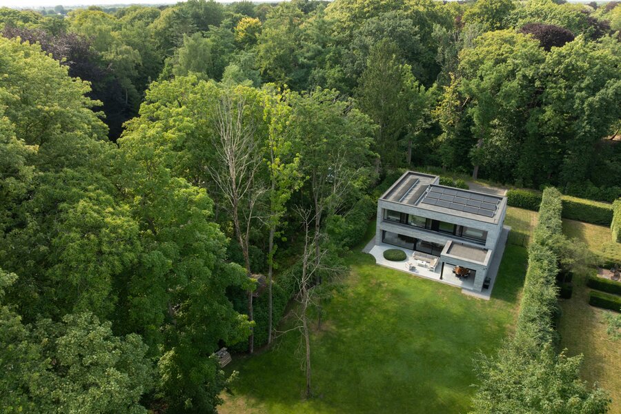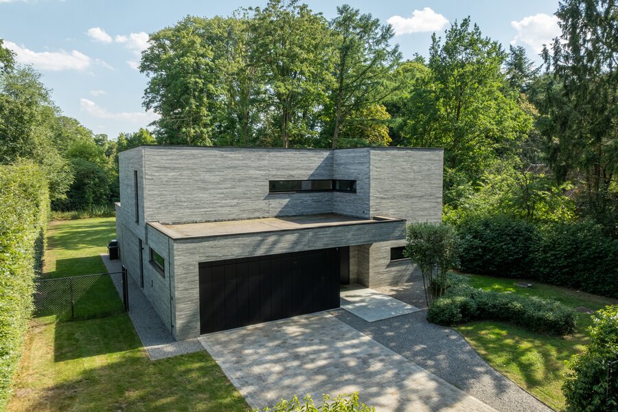 In een doodlopende en uiterst rustige zijstraat van de Kapelsestraat, bevindt zich deze ruime en instapklare nieuwbouwvilla (2023) die luxe, ruimte en verfijning ademt. Omringd door het weelderige groen, biedt dit unieke eigendom een oase van rust en privacy, met een verfijnde architectuur die perfect opgaat in de natuur. De villa is met uiterste zorg en met kwalitatieve materialen gebouwd en afgewerkt. Reeds bij het betreden van de woning via de ruime inkomhal, valt de aandacht voor detail op. Hier bevinden zich een gastentoilet met handenwasser, een ingemaakte vestiairekast en een doorgang naar de kelder. De open leefruimte straalt klasse en warmte uit, met een visgraat parket die naadloos doorloopt in de ruime eetkamer, voorzien van een stijlvolle ingebouwde barkast. De aansluitende zithoek met gashaard nodigt uit tot gezellige avonden in een huiselijke sfeer. De aparte bureauruimte, eveneens op parket, is ideaal voor thuiswerk of een rustige lees/speelkamer. De leefkeuken, afgewerkt met een strakke gietvloer (PU) is voorzien van hoogwaardige inbouwtoestellen, een doordachte indeling en een ingemaakte bureaukast. Grote schuiframen verbinden binnen en buiten moeiteloos, met toegang tot het deels overdekte terras, uitgerust met elektriciteit, tv-aansluitingen en voorbereid voor terrasverwarming. Achter de keuken bevindt zich de dubbele garage met praktisch valluik naar de kelder. Deze garage met automatische poort biedt plek voor twee wagens en extra bergruimte. Tevens via een zijdeur bereikbaar. Op de eerste verdieping leidt betreden we de royale overloop op warme parketvloer. Hier bevinden zich vier slaapkamers, waaronder de master suite met inloopdressing met verlichting en uitzicht op de tuin. De badkamer is een toonbeeld van verfijning, met een dubbele lavabo, een inloopdouche met dubbele douchekop en hoogwaardig AXOR Line kraanwerk op gietvloer. Het apart nachttoilet biedt extra comfort. 2 gelijke kinderkamers geven uit op de prachtige tuin. De laatste kamer is momenteel gebruikt als wasplaats/dressing, maar kan evengoed dienen als 4e slaapkamer. De woning is volledig onderkelderd (159 m²), wat uitzonderlijke mogelijkheden biedt. De kelder herbergt onder andere een ruime fitness- of speelruimte, een aparte kantoorruimte, een technische ruimte met domotica, extra bergruimte en een voorziening voor een zwembadinstallatie. Hier zijn uitbreiding en multifunctioneel gebruik perfect mogelijk. *Uitgebreide domotica *Bluetooth sloten *Binnenhuisinrichting door Anastasia Misotten *24 Zonnepanelen *Vloerverwarming * EPC