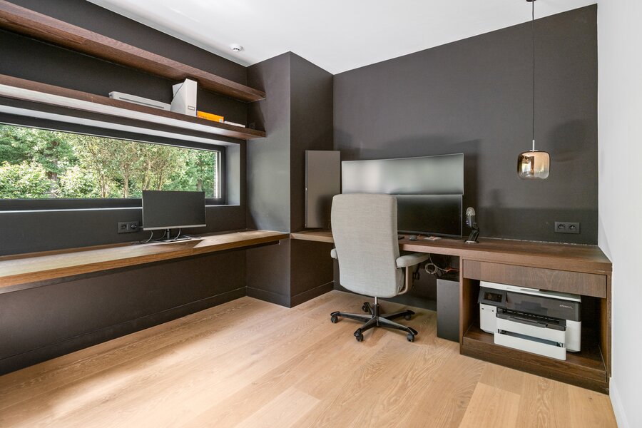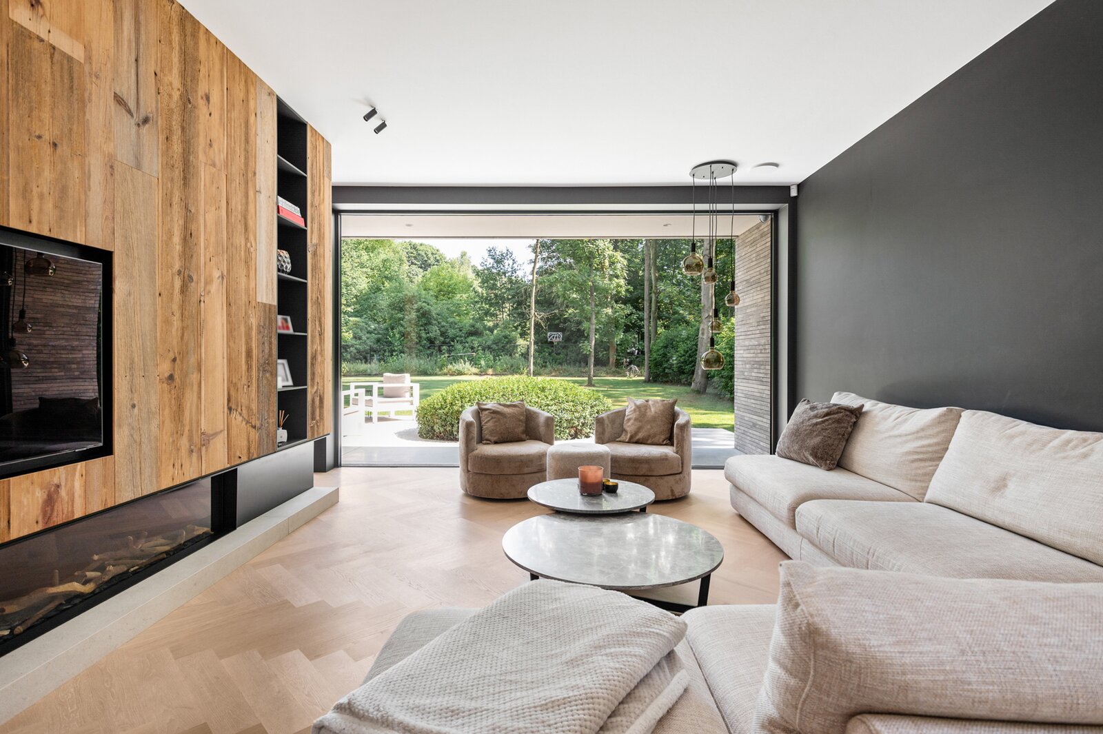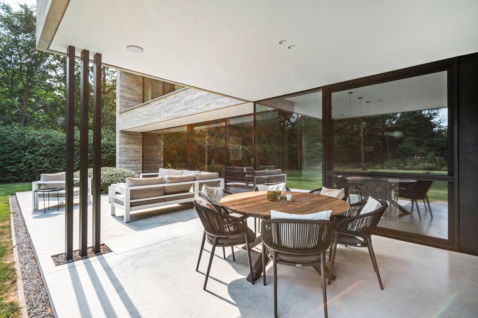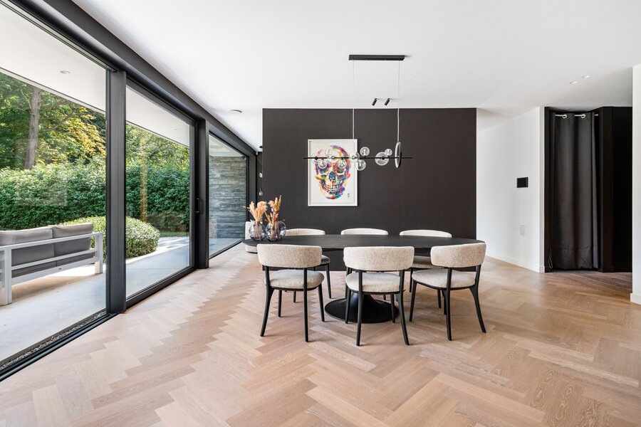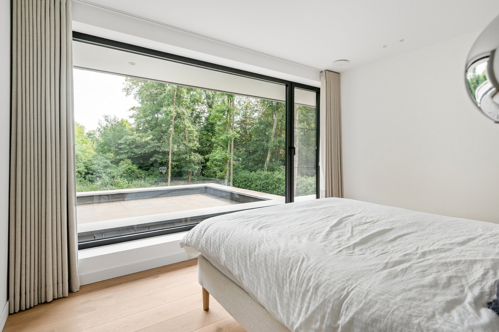 In een doodlopende en uiterst rustige zijstraat van de Kapelsestraat, bevindt zich deze ruime en instapklare nieuwbouwvilla (2023) die luxe, ruimte en verfijning ademt. Omringd door het weelderige groen, biedt dit unieke eigendom een oase van rust en privacy, met een verfijnde architectuur die perfect opgaat in de natuur. De villa is met uiterste zorg en met kwalitatieve materialen gebouwd en afgewerkt. Reeds bij het betreden van de woning via de ruime inkomhal, valt de aandacht voor detail op. Hier bevinden zich een gastentoilet met handenwasser, een ingemaakte vestiairekast en een doorgang naar de kelder. De open leefruimte straalt klasse en warmte uit, met een visgraat parket die naadloos doorloopt in de ruime eetkamer, voorzien van een stijlvolle ingebouwde barkast. De aansluitende zithoek met gashaard nodigt uit tot gezellige avonden in een huiselijke sfeer. De aparte bureauruimte, eveneens op parket, is ideaal voor thuiswerk of een rustige lees/speelkamer. De leefkeuken, afgewerkt met een strakke gietvloer (PU) is voorzien van hoogwaardige inbouwtoestellen, een doordachte indeling en een ingemaakte bureaukast. Grote schuiframen verbinden binnen en buiten moeiteloos, met toegang tot het deels overdekte terras, uitgerust met elektriciteit, tv-aansluitingen en voorbereid voor terrasverwarming. Achter de keuken bevindt zich de dubbele garage met praktisch valluik naar de kelder. Deze garage met automatische poort biedt plek voor twee wagens en extra bergruimte. Tevens via een zijdeur bereikbaar. Op de eerste verdieping leidt betreden we de royale overloop op warme parketvloer. Hier bevinden zich vier slaapkamers, waaronder de master suite met inloopdressing met verlichting en uitzicht op de tuin. De badkamer is een toonbeeld van verfijning, met een dubbele lavabo, een inloopdouche met dubbele douchekop en hoogwaardig AXOR Line kraanwerk op gietvloer. Het apart nachttoilet biedt extra comfort. 2 gelijke kinderkamers geven uit op de prachtige tuin. De laatste kamer is momenteel gebruikt als wasplaats/dressing, maar kan evengoed dienen als 4e slaapkamer. De woning is volledig onderkelderd (159 m²), wat uitzonderlijke mogelijkheden biedt. De kelder herbergt onder andere een ruime fitness- of speelruimte, een aparte kantoorruimte, een technische ruimte met domotica, extra bergruimte en een voorziening voor een zwembadinstallatie. Hier zijn uitbreiding en multifunctioneel gebruik perfect mogelijk. *Uitgebreide domotica *Bluetooth sloten *Binnenhuisinrichting door Anastasia Misotten *24 Zonnepanelen *Vloerverwarming * EPC