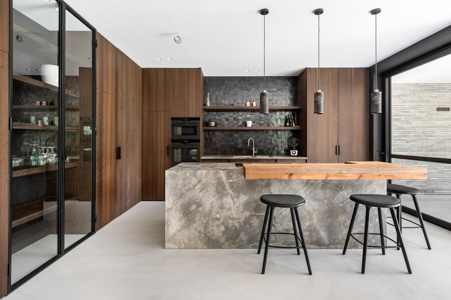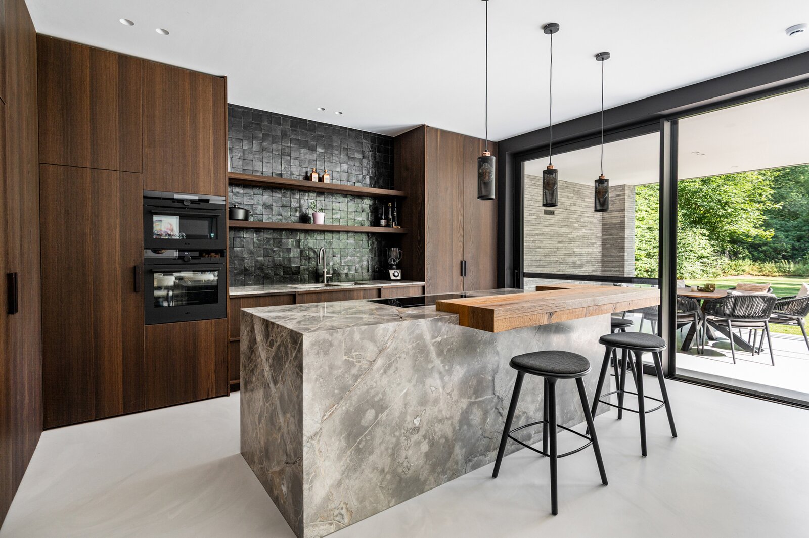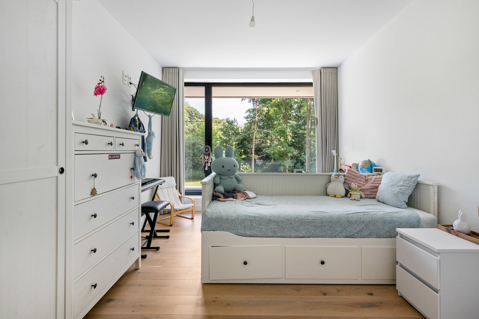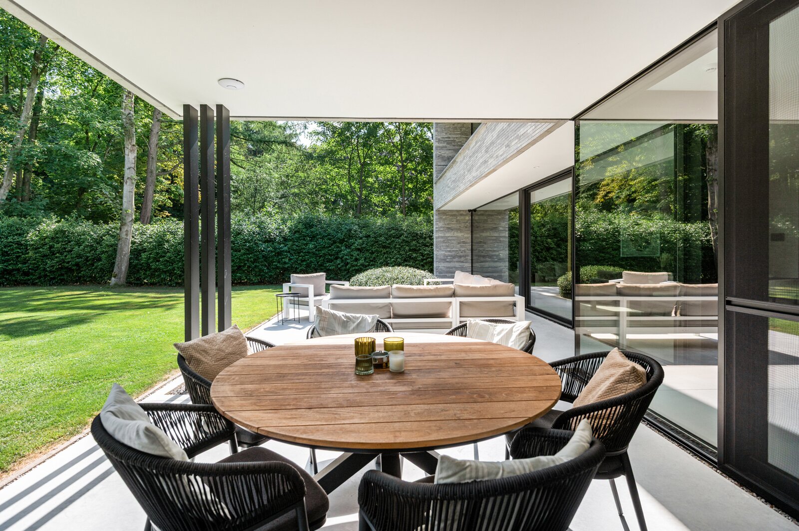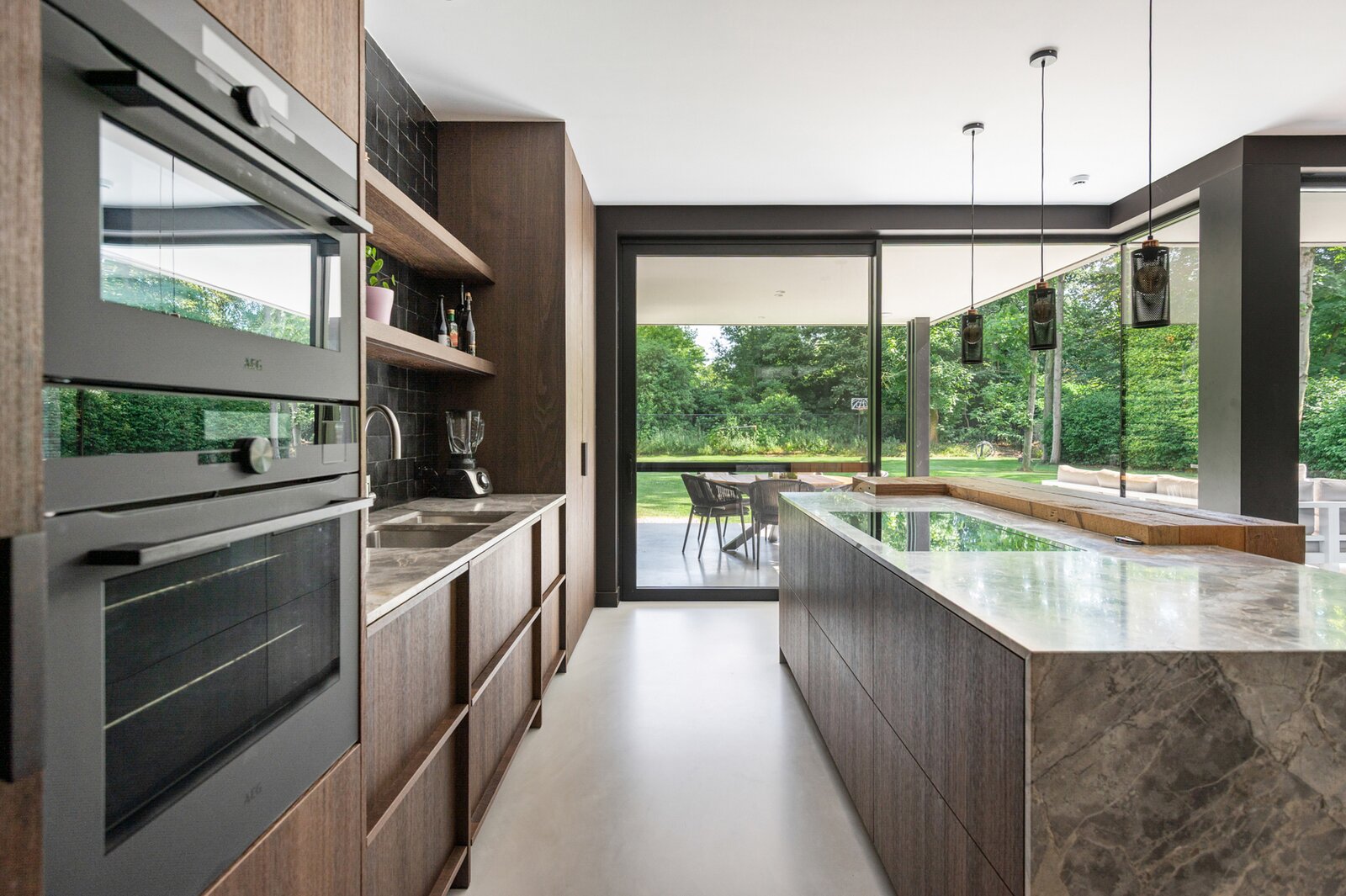 In een doodlopende en uiterst rustige zijstraat van de Kapelsestraat, bevindt zich deze ruime en instapklare nieuwbouwvilla (2023) die luxe, ruimte en verfijning ademt. Omringd door het weelderige groen, biedt dit unieke eigendom een oase van rust en privacy, met een verfijnde architectuur die perfect opgaat in de natuur. De villa is met uiterste zorg en met kwalitatieve materialen gebouwd en afgewerkt. Reeds bij het betreden van de woning via de ruime inkomhal, valt de aandacht voor detail op. Hier bevinden zich een gastentoilet met handenwasser, een ingemaakte vestiairekast en een doorgang naar de kelder. De open leefruimte straalt klasse en warmte uit, met een visgraat parket die naadloos doorloopt in de ruime eetkamer, voorzien van een stijlvolle ingebouwde barkast. De aansluitende zithoek met gashaard nodigt uit tot gezellige avonden in een huiselijke sfeer. De aparte bureauruimte, eveneens op parket, is ideaal voor thuiswerk of een rustige lees/speelkamer. De leefkeuken, afgewerkt met een strakke gietvloer (PU) is voorzien van hoogwaardige inbouwtoestellen, een doordachte indeling en een ingemaakte bureaukast. Grote schuiframen verbinden binnen en buiten moeiteloos, met toegang tot het deels overdekte terras, uitgerust met elektriciteit, tv-aansluitingen en voorbereid voor terrasverwarming. Achter de keuken bevindt zich de dubbele garage met praktisch valluik naar de kelder. Deze garage met automatische poort biedt plek voor twee wagens en extra bergruimte. Tevens via een zijdeur bereikbaar. Op de eerste verdieping leidt betreden we de royale overloop op warme parketvloer. Hier bevinden zich vier slaapkamers, waaronder de master suite met inloopdressing met verlichting en uitzicht op de tuin. De badkamer is een toonbeeld van verfijning, met een dubbele lavabo, een inloopdouche met dubbele douchekop en hoogwaardig AXOR Line kraanwerk op gietvloer. Het apart nachttoilet biedt extra comfort. 2 gelijke kinderkamers geven uit op de prachtige tuin. De laatste kamer is momenteel gebruikt als wasplaats/dressing, maar kan evengoed dienen als 4e slaapkamer. De woning is volledig onderkelderd (159 m²), wat uitzonderlijke mogelijkheden biedt. De kelder herbergt onder andere een ruime fitness- of speelruimte, een aparte kantoorruimte, een technische ruimte met domotica, extra bergruimte en een voorziening voor een zwembadinstallatie. Hier zijn uitbreiding en multifunctioneel gebruik perfect mogelijk. *Uitgebreide domotica *Bluetooth sloten *Binnenhuisinrichting door Anastasia Misotten *24 Zonnepanelen *Vloerverwarming * EPC