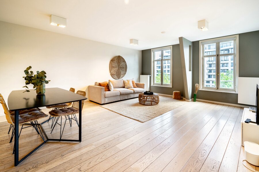 Gelegen op de prestigieuze Waterloolaan, vlakbij de Louizalaan en het Egmontpark, gemeubeld appartement met één slaapkamer met een bruto oppervlakte volgens EPC van ± 118 m².