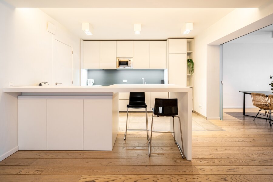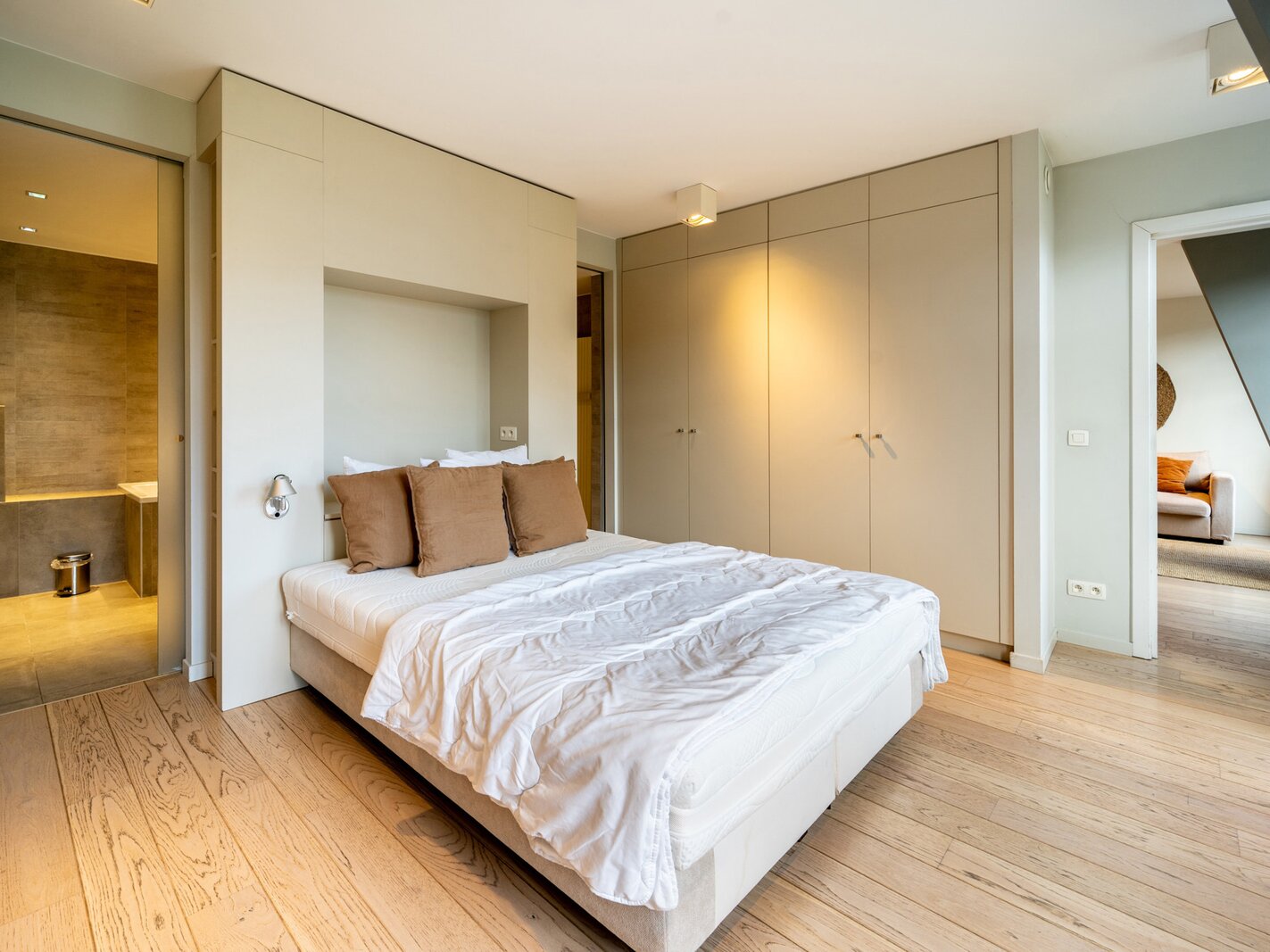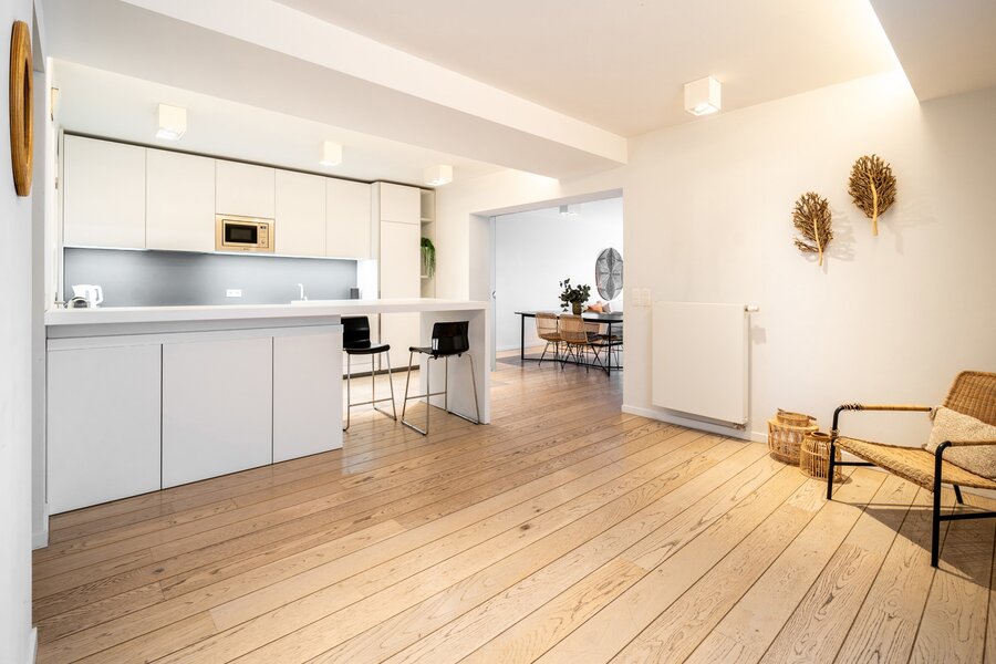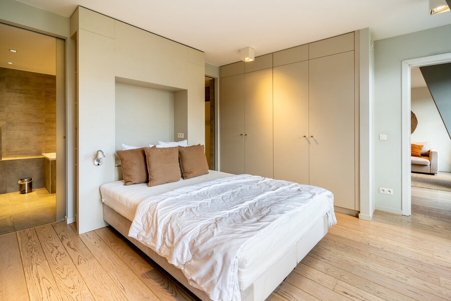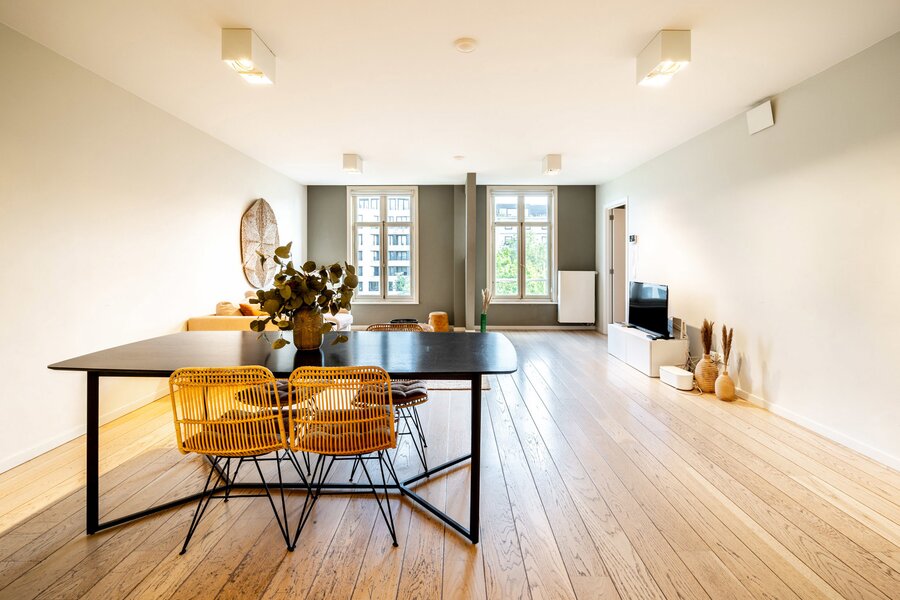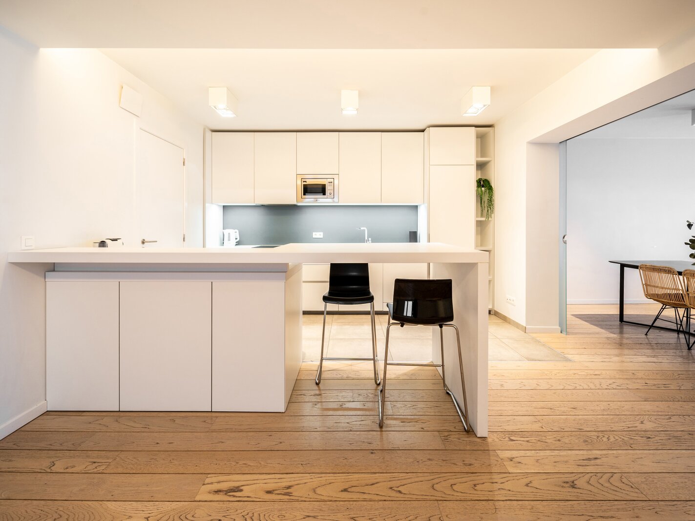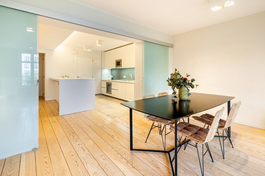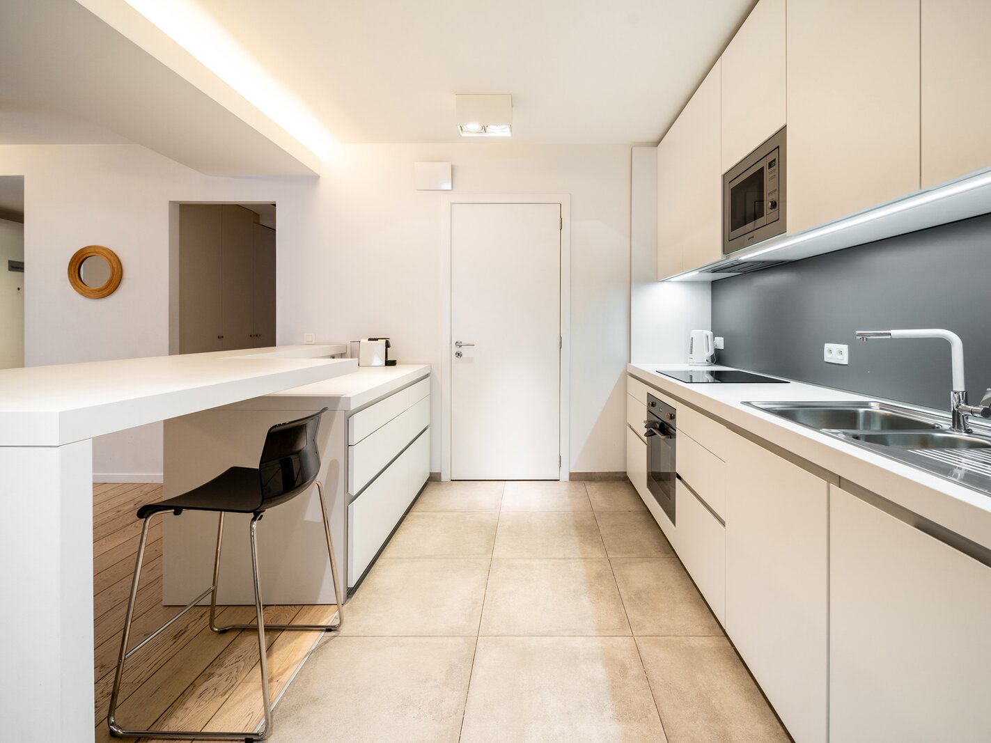 Het appartement gelegen op de derde verdieping van een “Neo-Renaissance” geïnspireerd herenhuis komt uit op een inkomhal met vestiaire en gastentoilet en leidt naar de enorme leefruimte bestaande uit een “Bulthaup” keuken ingericht met een aanrecht/lunchruimte en strekt zich uit tot de woonkamer en eetkamer. Aan de nachtzijde een grote slaapkamer met ingebouwde kasten en een badkamer met inloopdouche, ligbad en apart toilet. Een ingerichte wasruimte maakt het pakket compleet.
